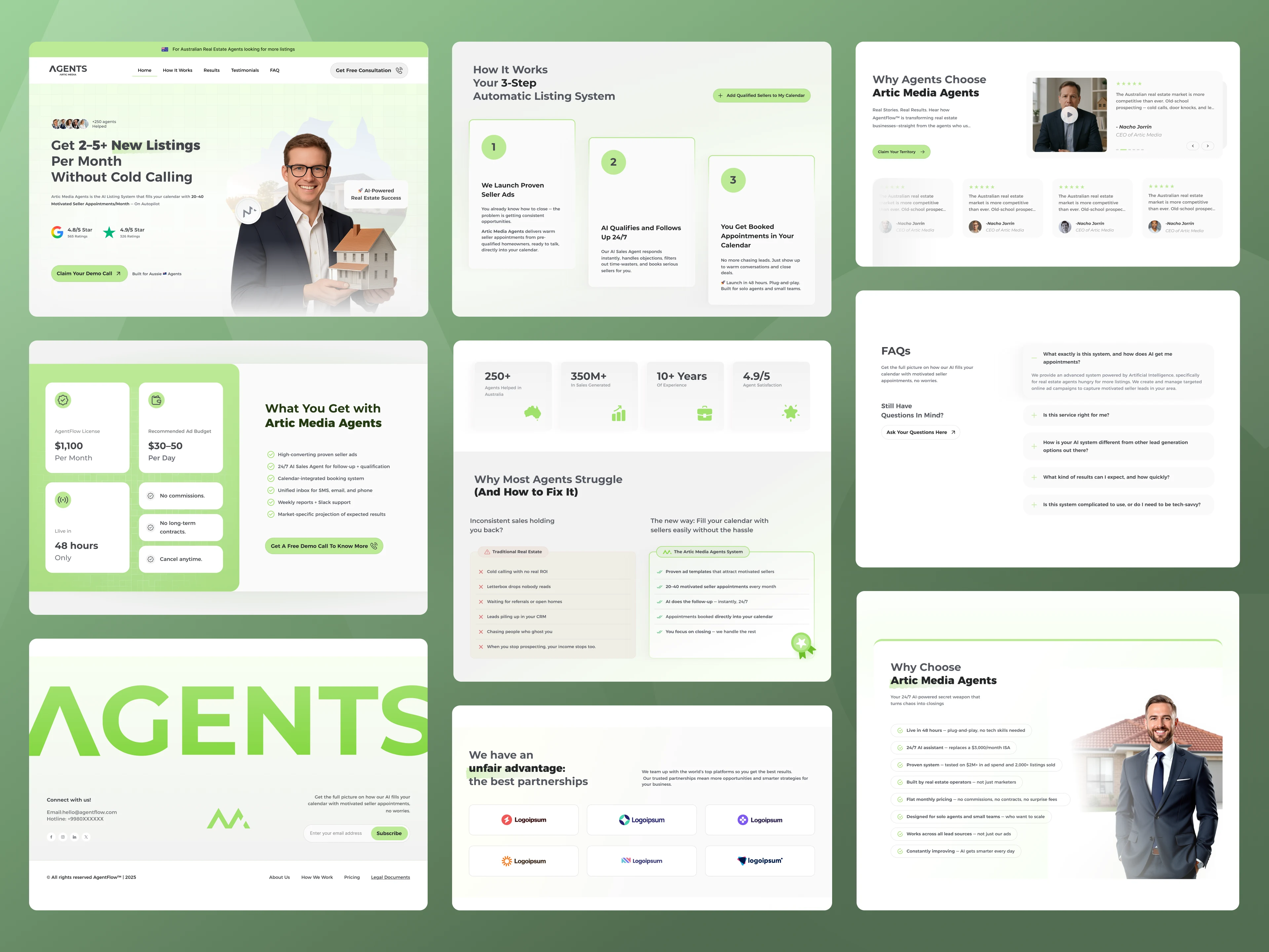 Artic Media helps agents get 20–40 motivated seller appointments per month and 2–5+ new listings—without relying on cold calling, letter drops, or chasing buyers. The new website needed to clearly communicate this promise, build trust, and drive demo call bookings.