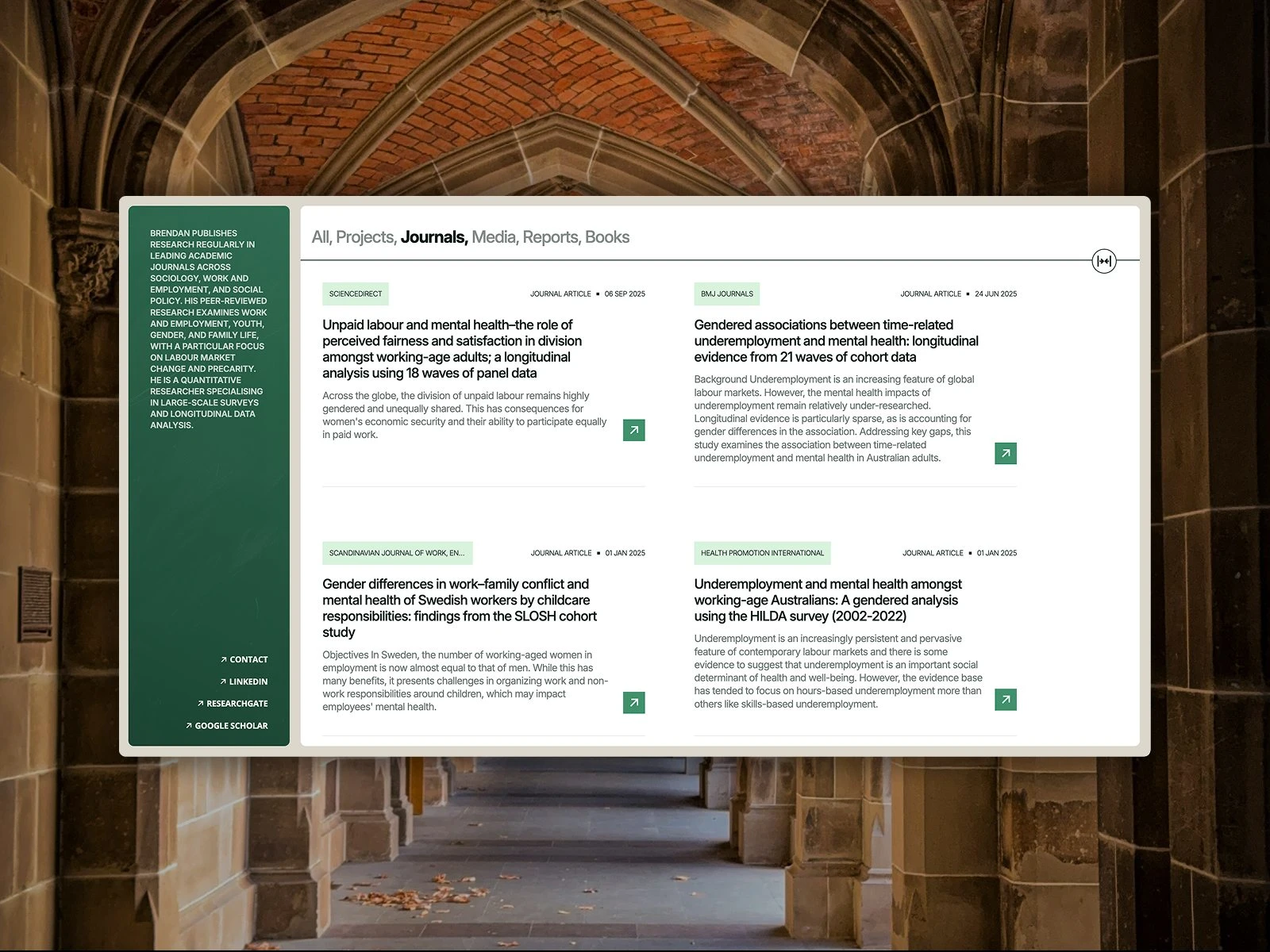 Dr Brendan Churchill is one of Australia’s leading sociologists, with over 120+ academic publications discussing gender and work equality. To support his ongoing work, we built a robust CMS-driven website in Webflow to make it easy to share new research in a creative way, whilst maintaining academic credibility.