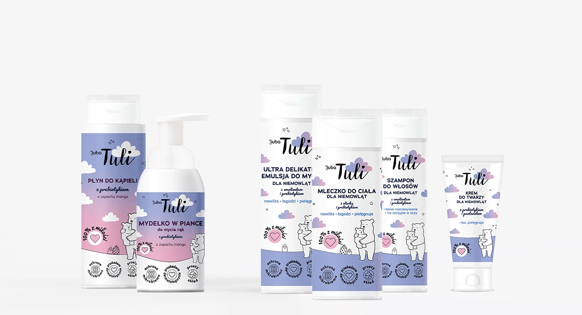 The project includes packaging designs and advertising materials for the new care series for infants and children. The aim of the project was to give the packaging a friendly and charming atmosphere while standing out on the shelf among other competitive brands. The design combines illustrations with simple, minimalist typography. The addition of a bold gradient, hand-drawn stars, and clouds aimed to give the packaging a sense of lightness and distinctiveness. The packaging fronts with the brand's distinctive bear contain product information. Luba Tuli has already used bear illustrations in their communication, so they were not changed, allowing customers to recognize the Luba Tuli series. The packaging was divided into two color groups to differentiate products for infants from those for children. The modern and aesthetic design makes the product stand out from the most commonly purchased brands.
