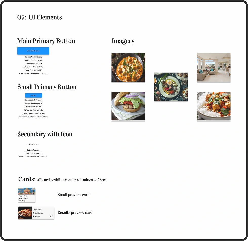 After completing the mid-fidelity wireframes, a mood board was created in order to set the tone and identify the visual direction of the Foodie app. After the completion of the mood board, I proceeded to the next stage which was to generate a style guide that contained a color palette, button, cards, and additional UI components that was implemented in the final high-fidelity wireframes