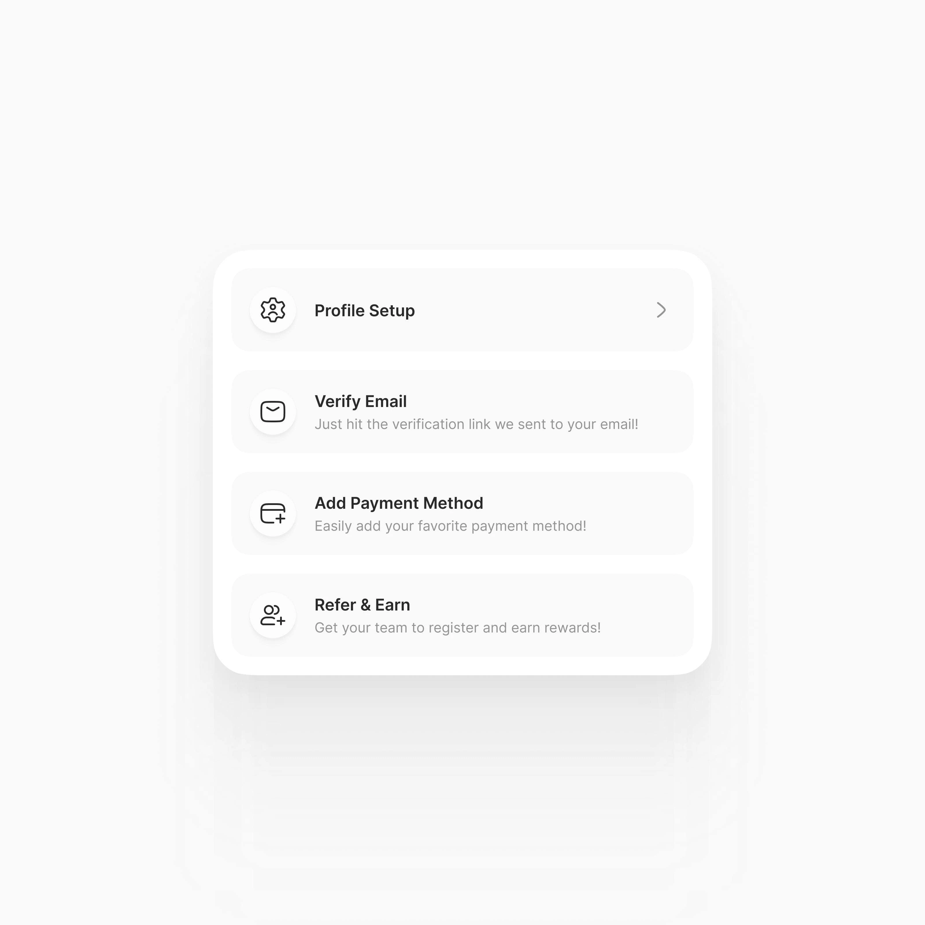 Card design with clear iconography and concise text ensure effortless navigation, neutral color palette and structured layout make it feel reliable and polished