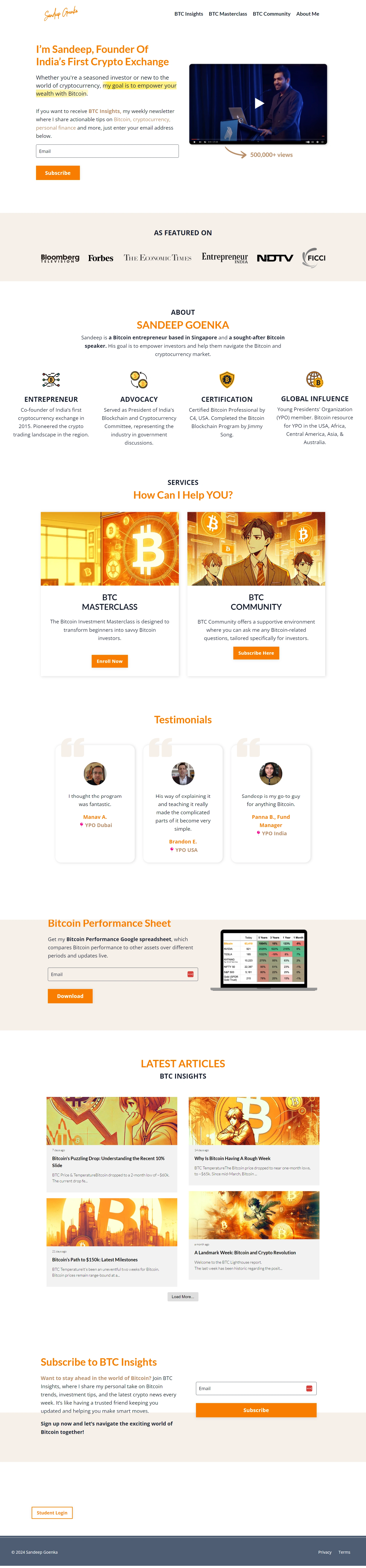 Sandeep was looking for a minimalist and modern website like industry experts “Ali Abdaal and Ankur Warikoo”. The goal is to have people subscribe for the weekly newsletter “BTC Insights”. Also, to showcase the information about Bitcoin programs and community.