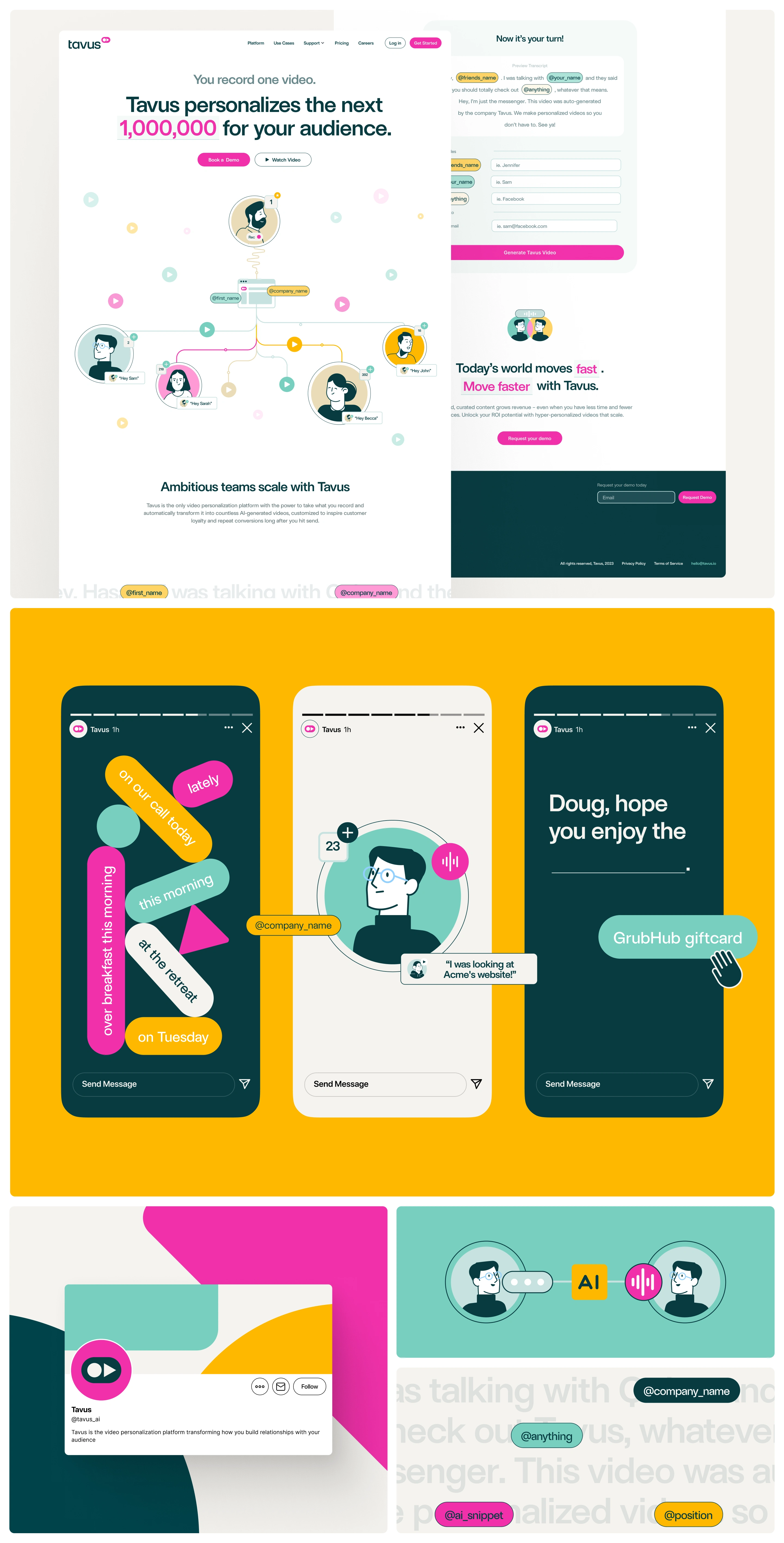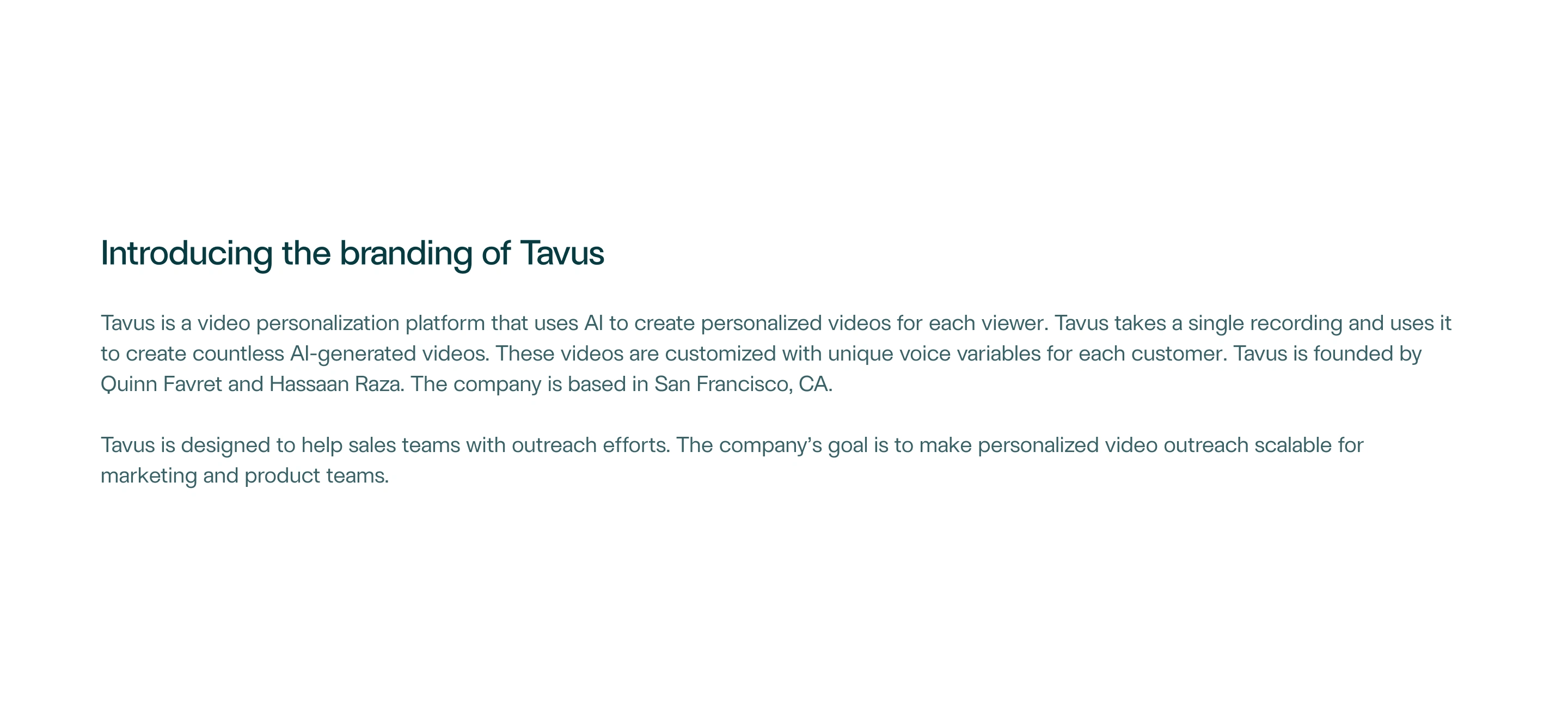 Tavus is a platform that uses AI to create personalized videos for each viewer. Tavus takes one recording and uses it to create countless AI-generated videos.
