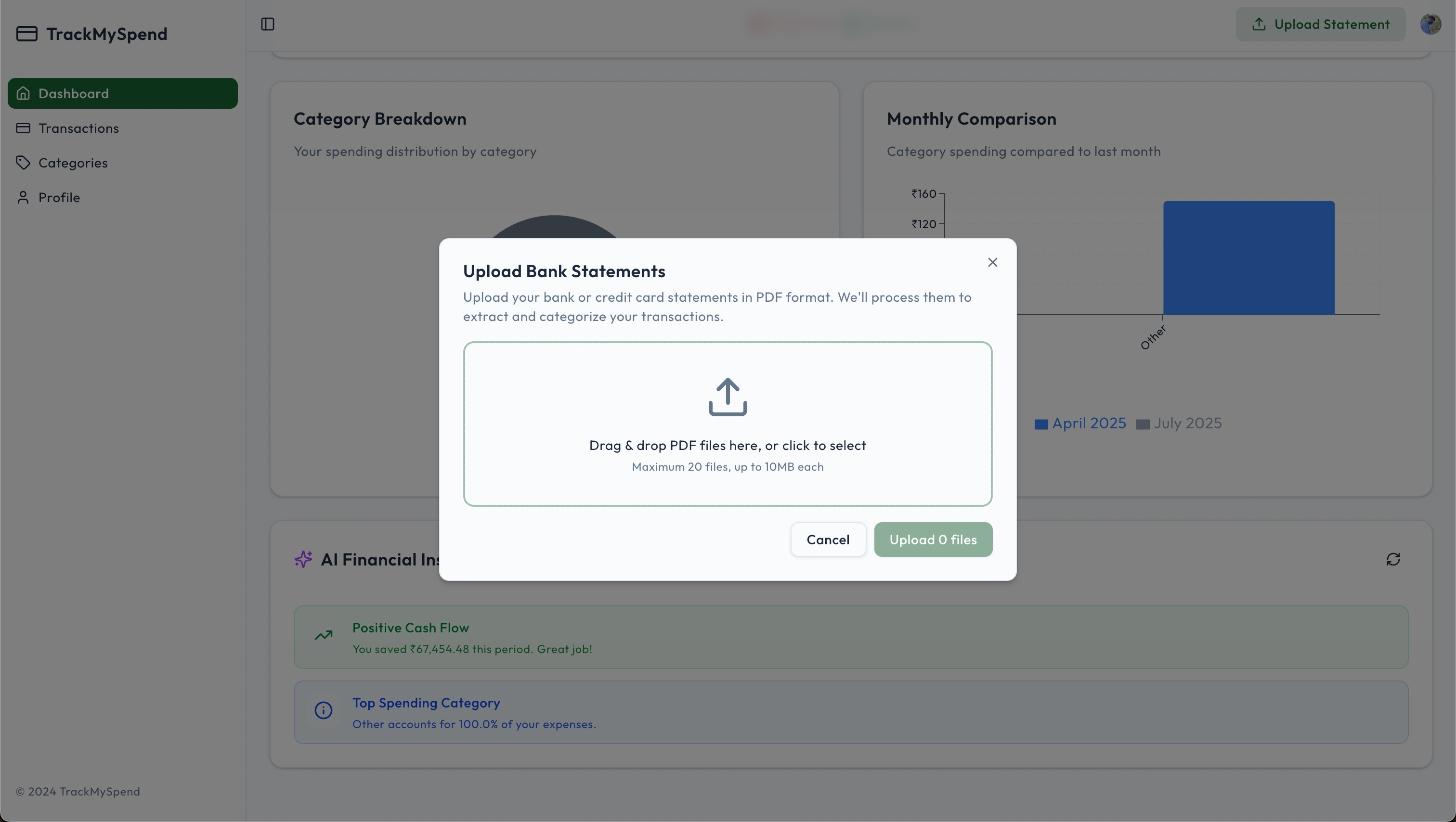 TrackMySpend is a web app that helps young Indian families make sense of their finances by turning raw bank and credit card statements into clear, categorized insights.
