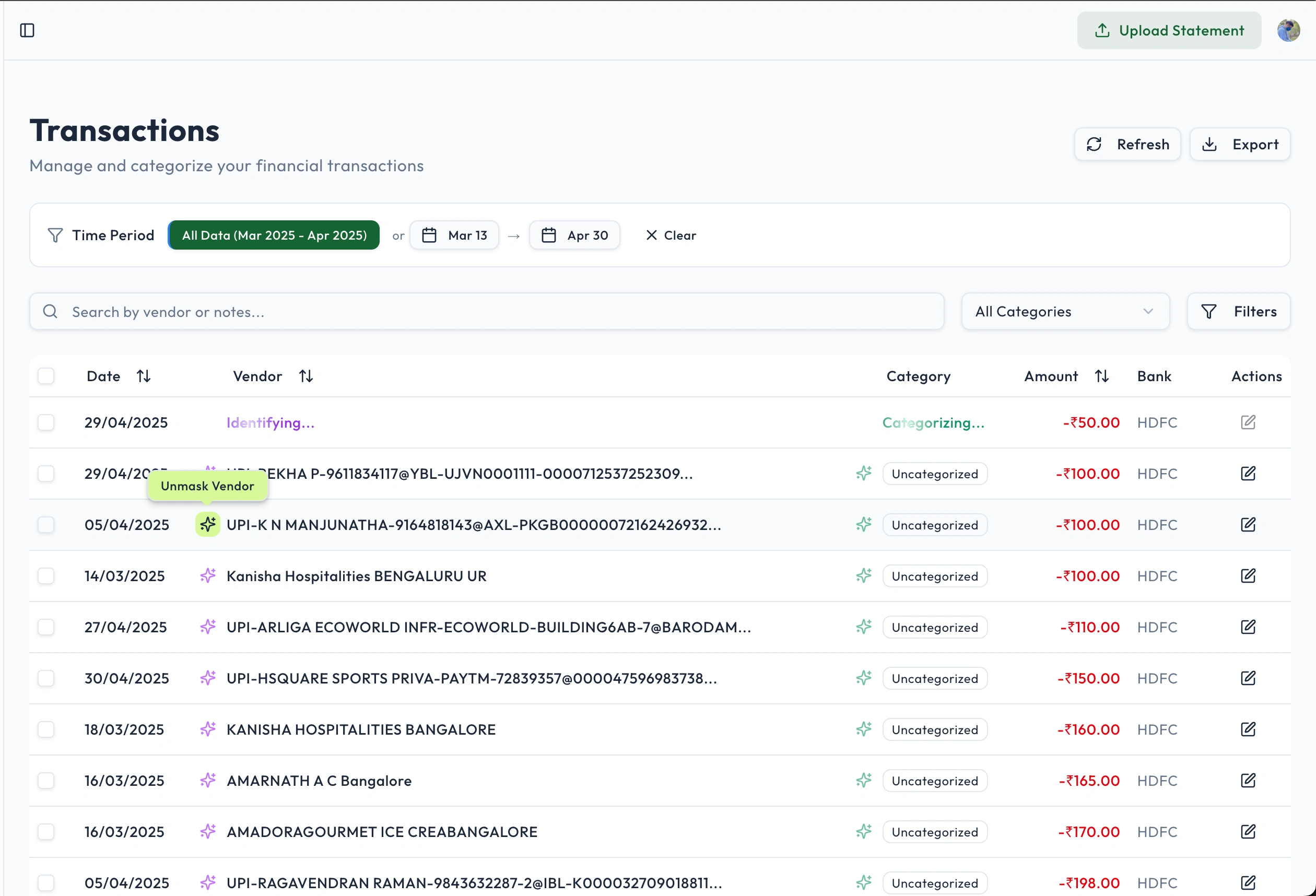 AI-powered finance dashboard that parses bank statements, cleans vendors, categorizes expenses, and shows clear spending insights with interactive dashboards.