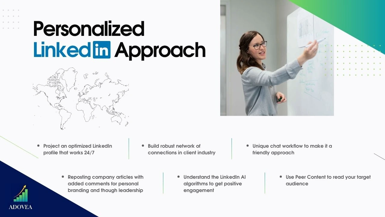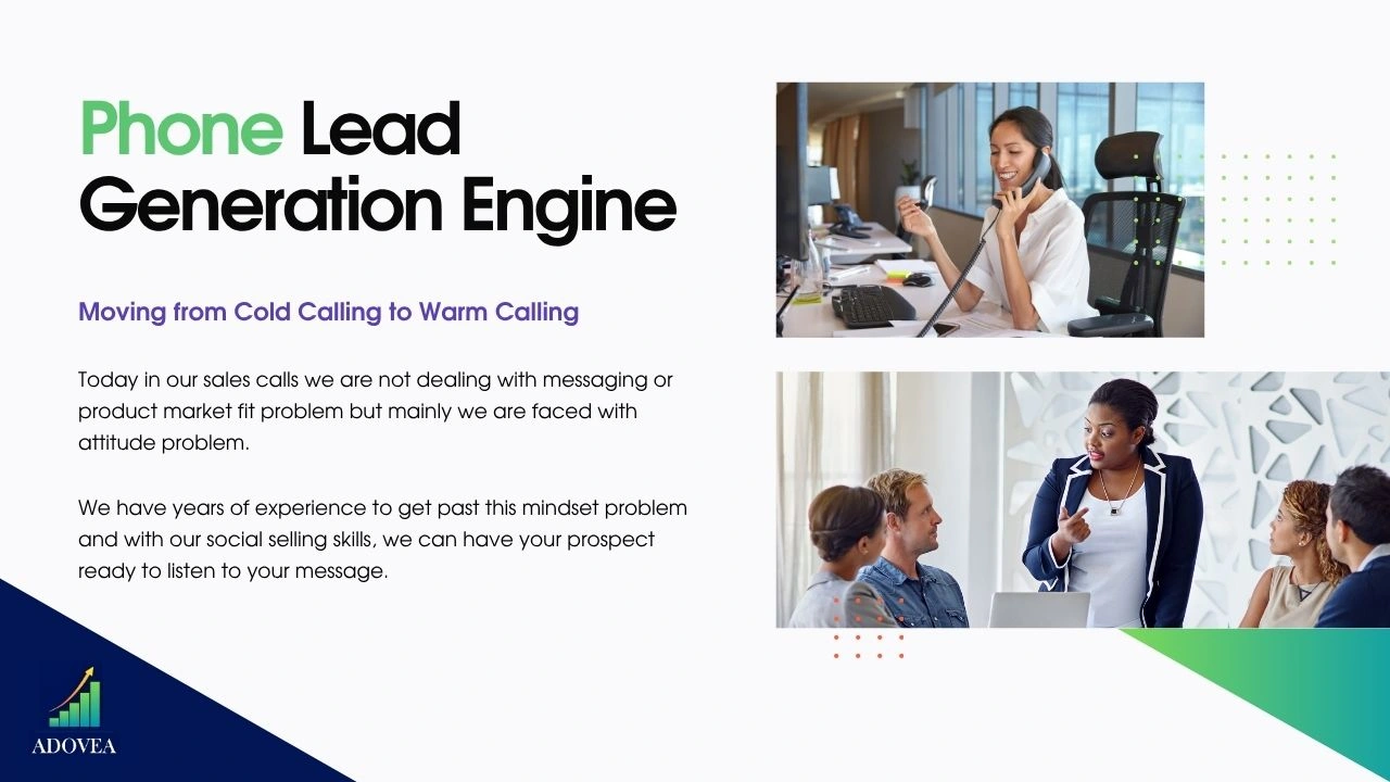 Created a deck for Adovea's B2B outbound services. Using brand identity, consistency, boosting engagement, and inquiries.
