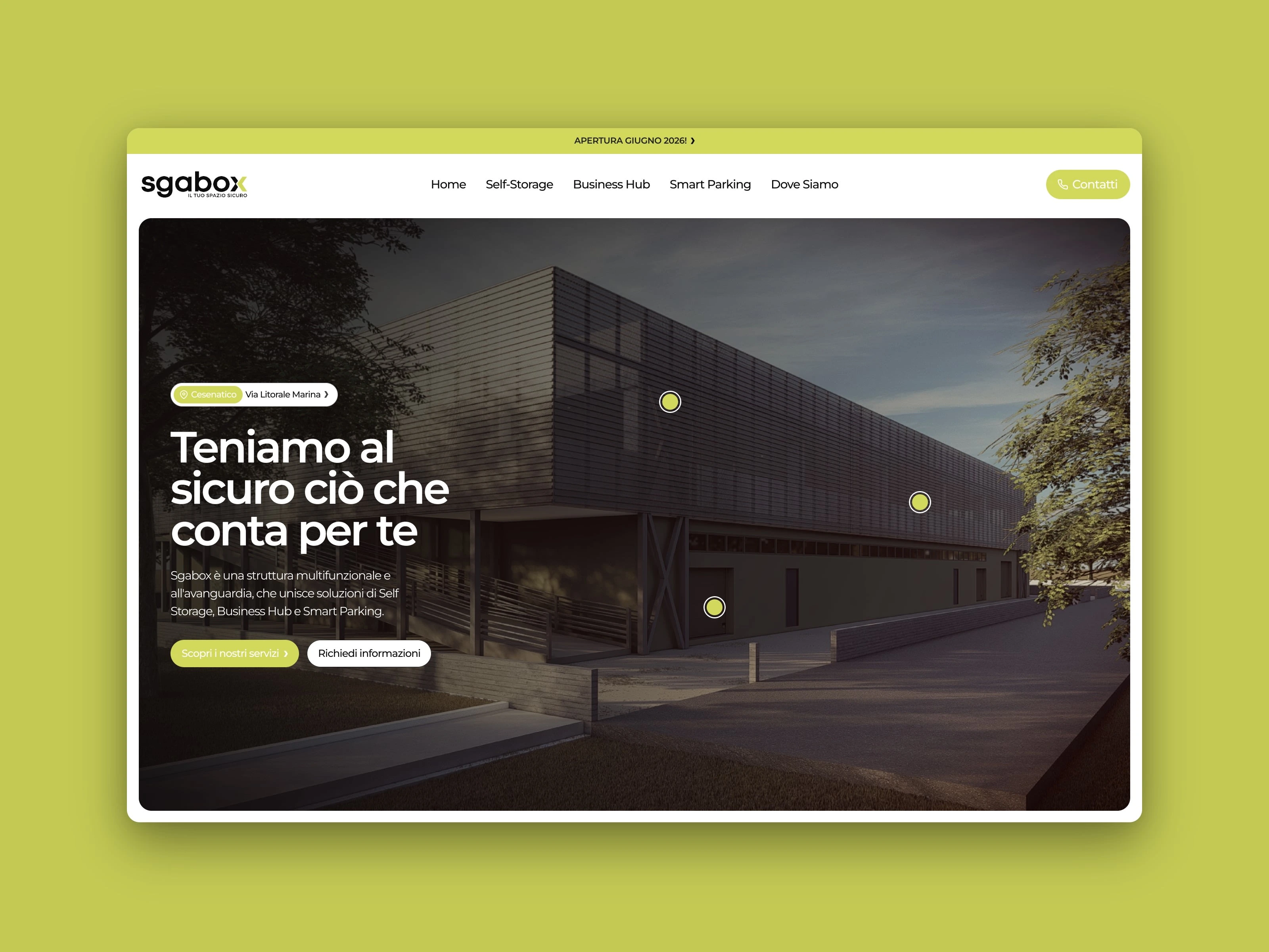 Sgabox is a multifunctional, cutting-edge facility that combines self-storage, business hub, and smart parking solutions made in Framer.