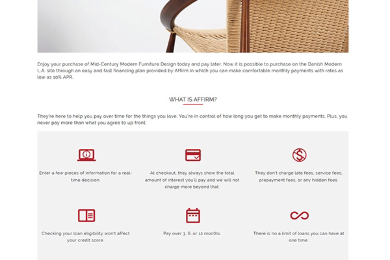 Creation of low and high fidelity wire-framing and mock-ups for new sections at Danishmodernla.com website incorporating Affirm payment.