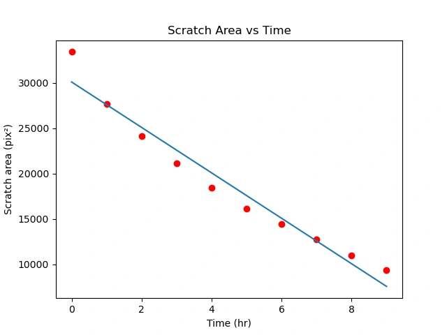 Scratch assay uses time-lapse images to track cell migration. Segmentation with entropy filter & Otsu in Python shows area shrinking over time.