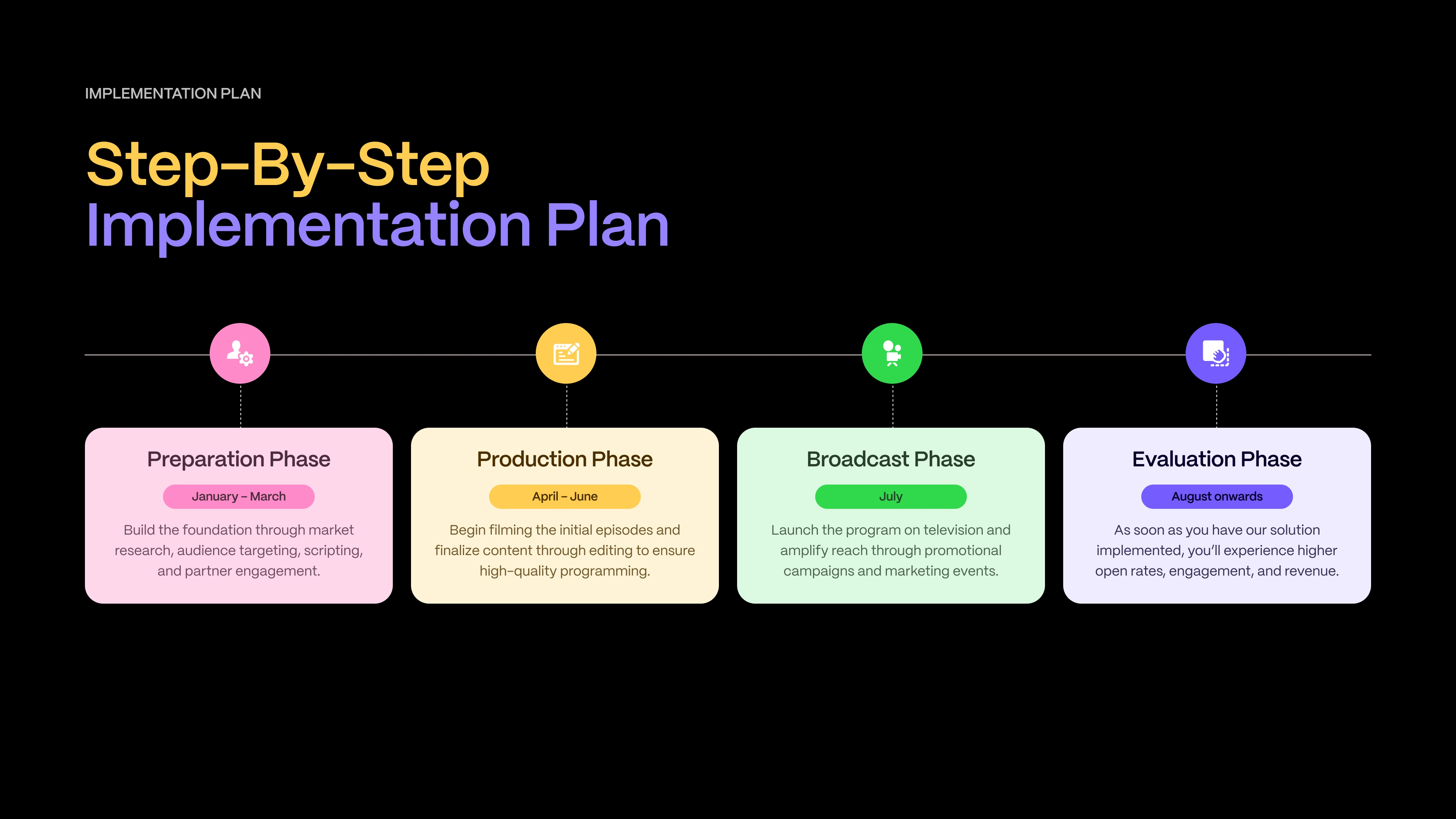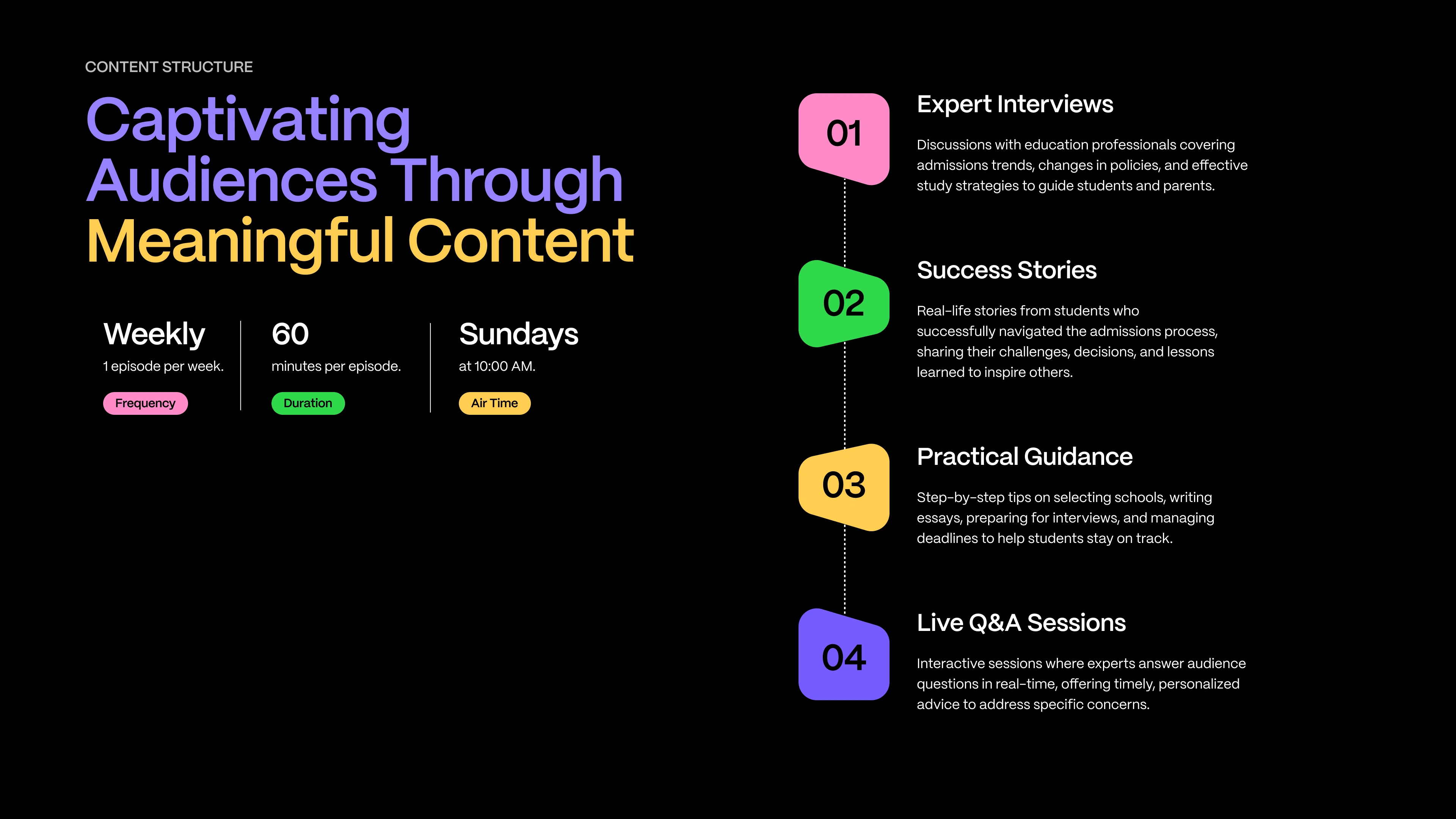 A streamlined, brand-aligned deck using bold fonts and vibrant accents—organized to highlight key insights that engage students, parents, and sponsors.