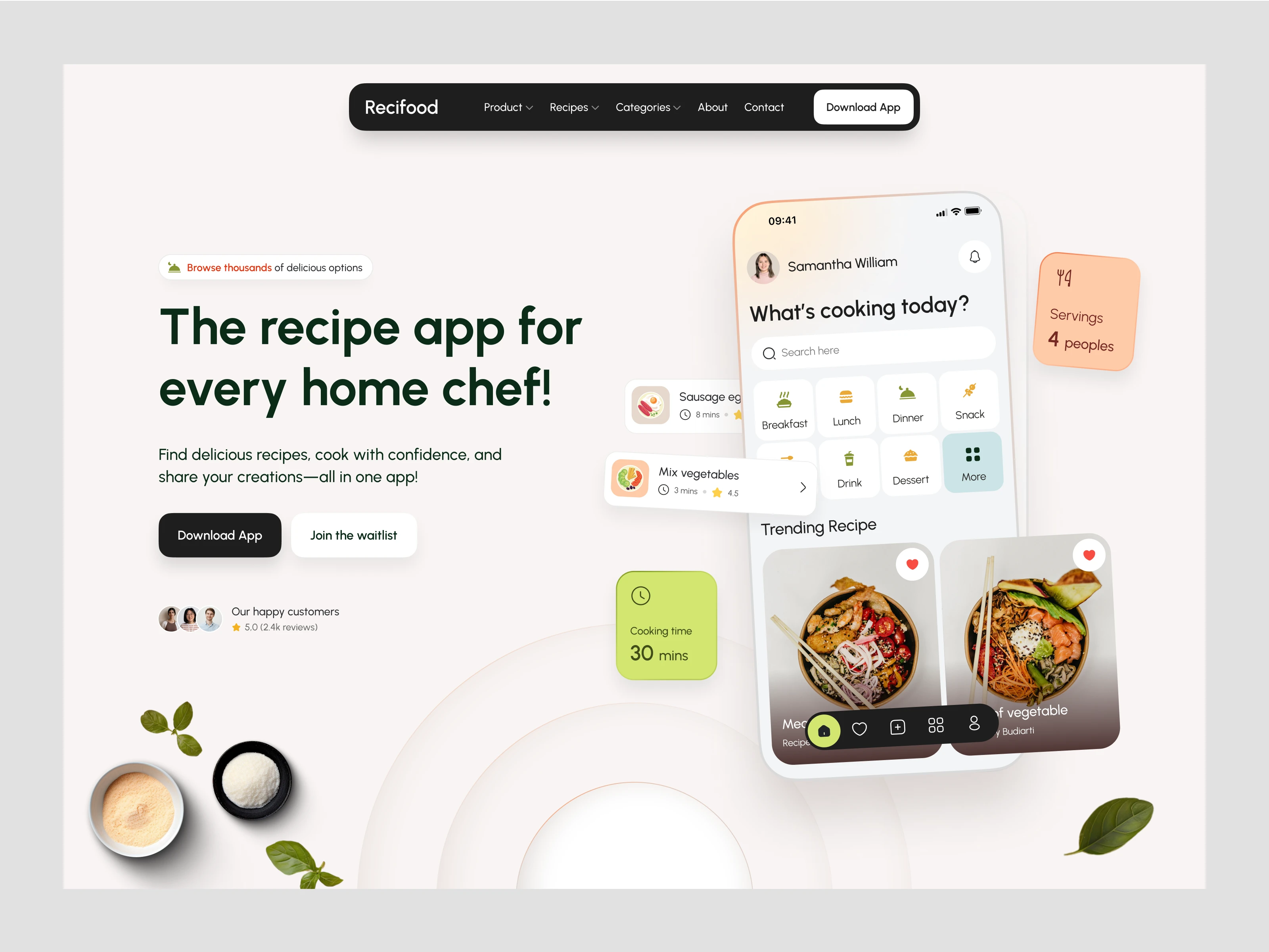 Explore this Food Recipe landing page design. Designed to help food apps, recipe platforms, or cooking communities showcase their features in a clean and modern style.