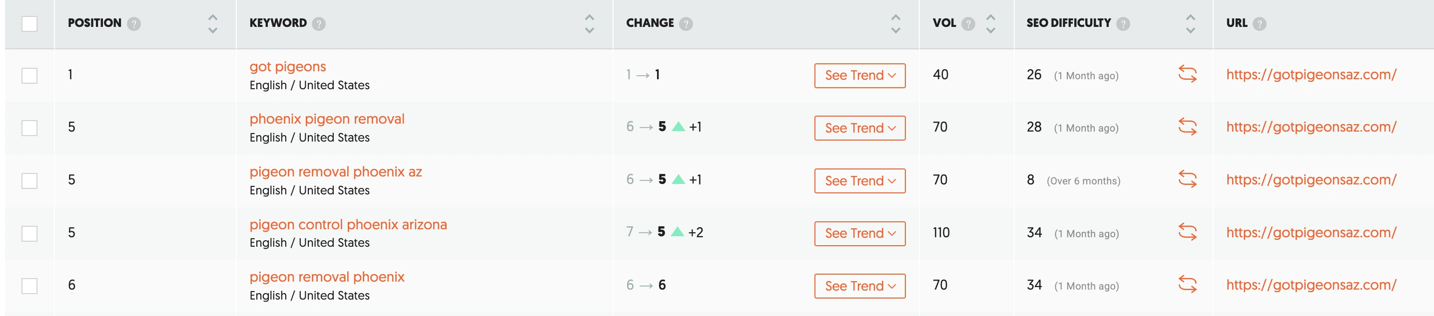 The owner used to perform door-to-door solicitation for houses that appeared to have pigeon infestations. He has never had to do that since we got him ranking on page one for several local search intent keywords.