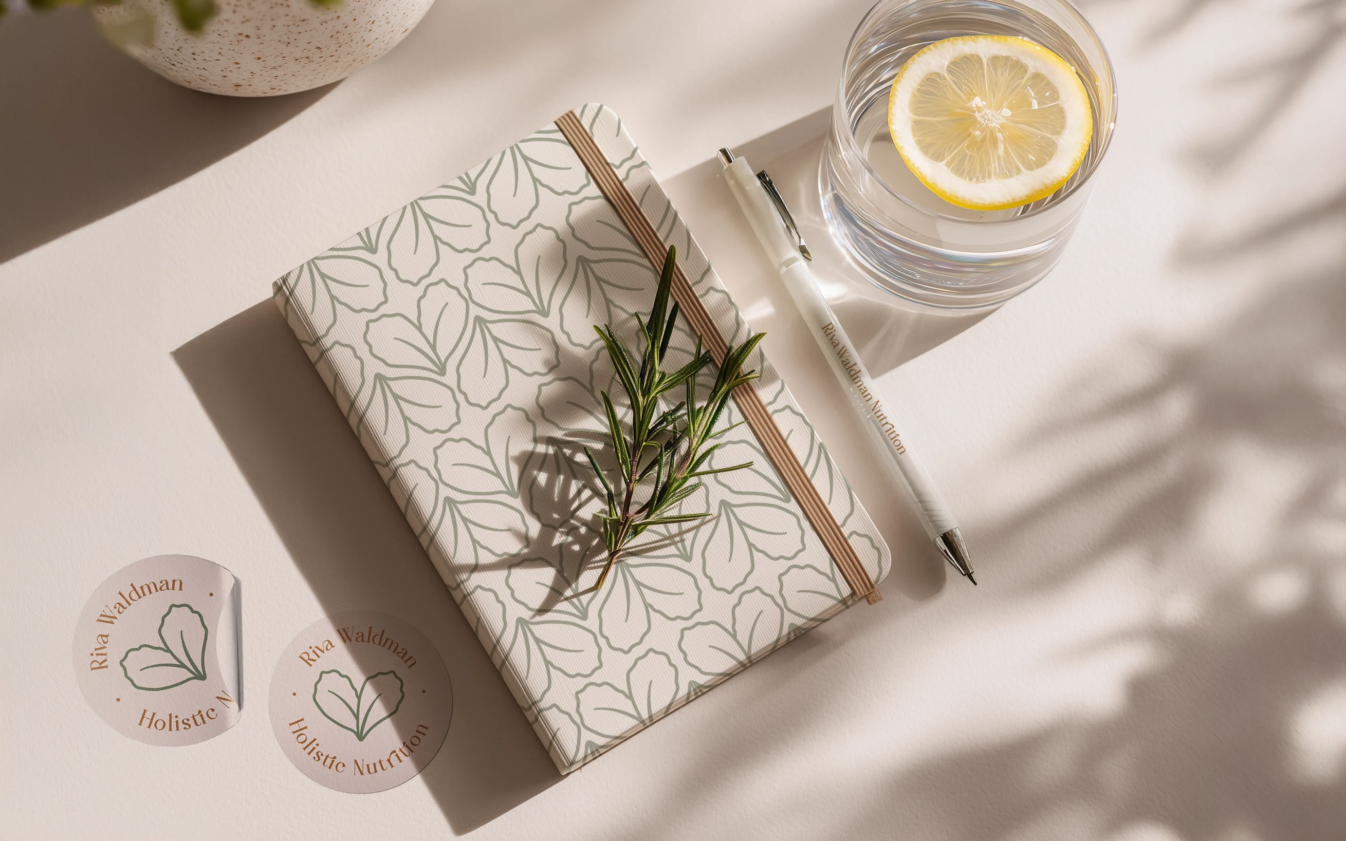 This identity was created for a holistic nutritionist seeking a warm, natural, and trustworthy brand presence. The mark blends a leaf and heart into a simple, organic symbol representing nourishment, care, and the balance of health and humanity. Paired with soft earth-toned colors and modern typography, the visual system feels grounded, calm, and welcoming.