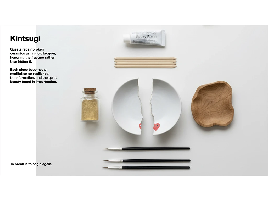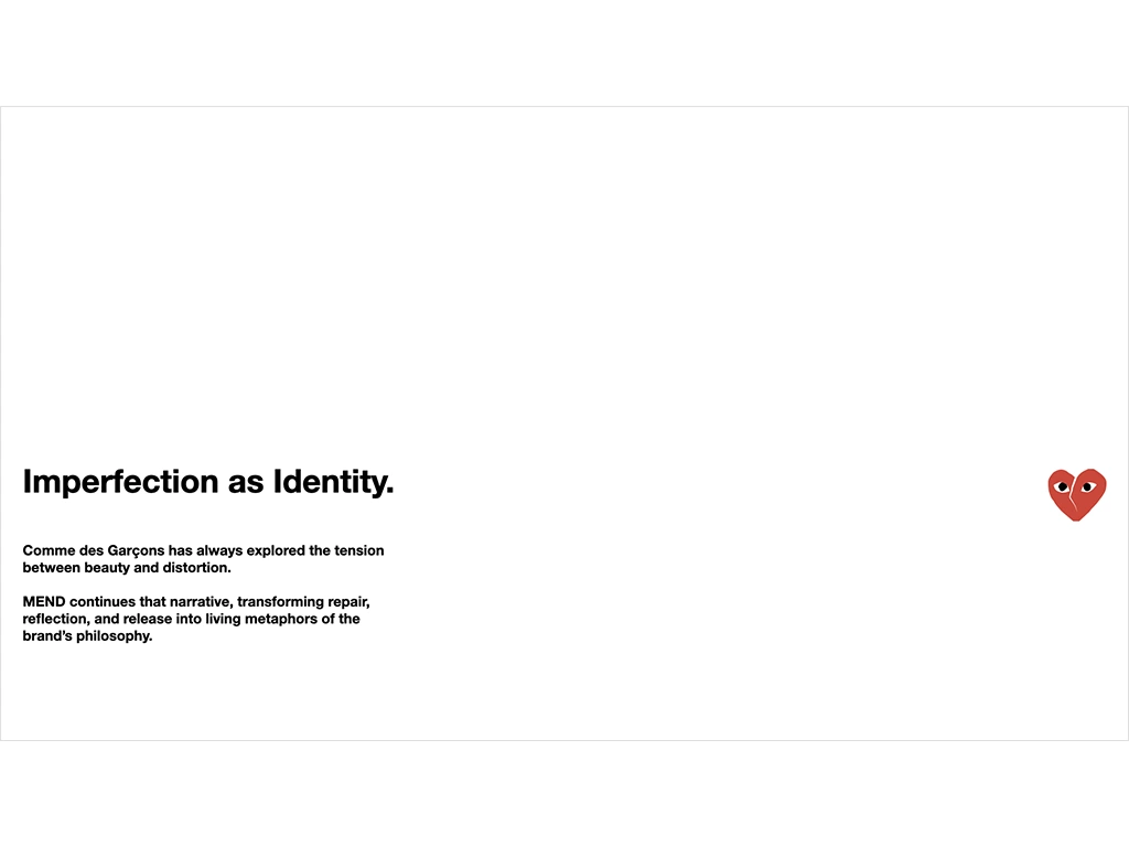 A highly designed concept deck created to visualize MEND, an immersive Comme des Garçons experiential activation. The presentation blends editorial minimalism with the brand’s raw, avant-garde aesthetic. Each slide was crafted to mirror the brand’s conceptual tone while clearly articulating the activation’s emotional narrative, spatial design, and sensory journey. The result is a pitch deck that feels both strategic and artful, equal parts presentation and visual manifesto.