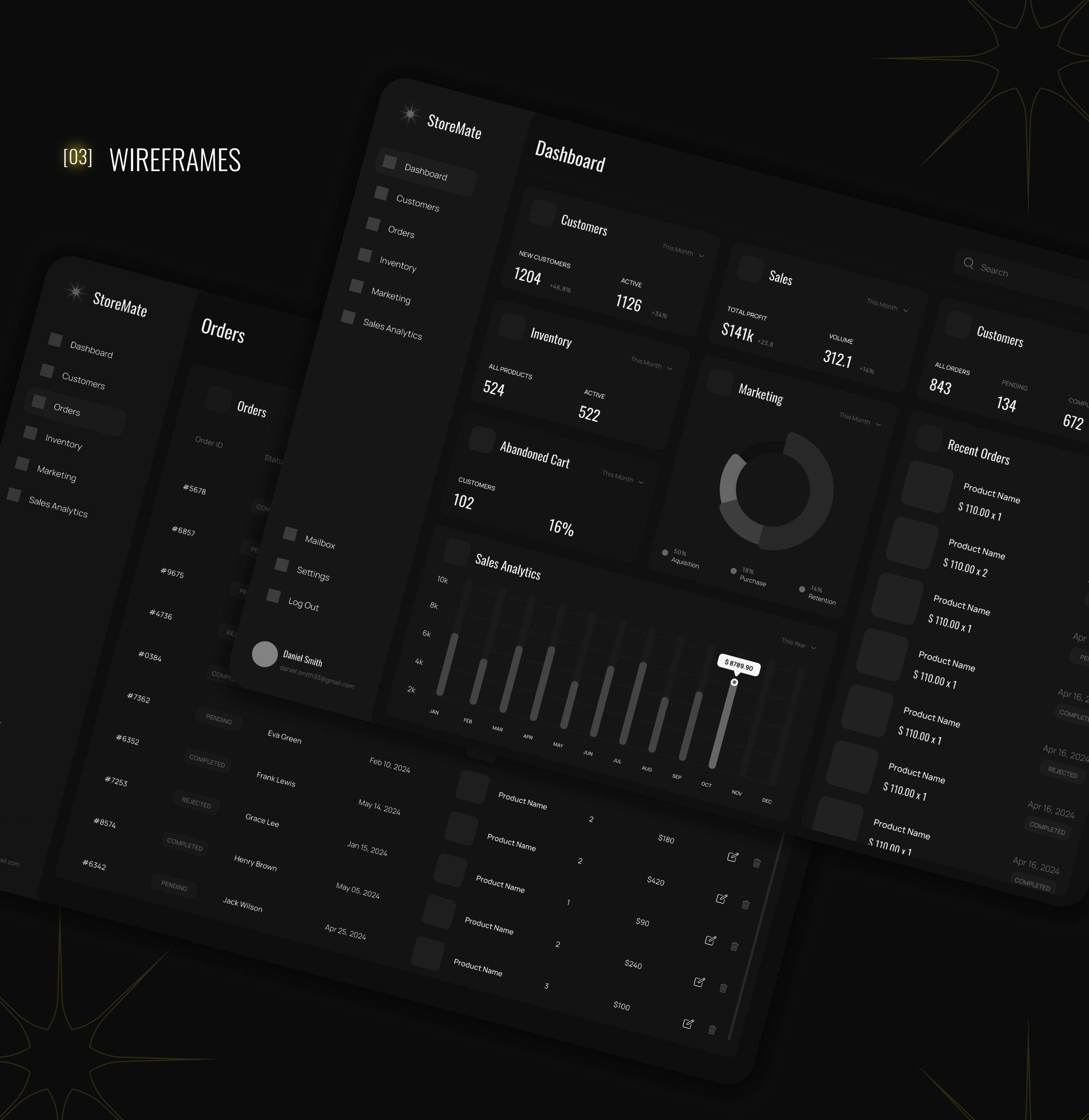 Our team created wireframes that mapped out clear user flows, followed by a comprehensive UI kit and style guide to ensure design consistency. The UI design focused on simplicity and ease of navigation, aiming to improve efficiency for users managing customers, inventory, and sales data.