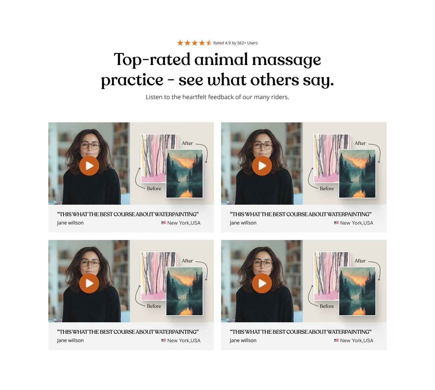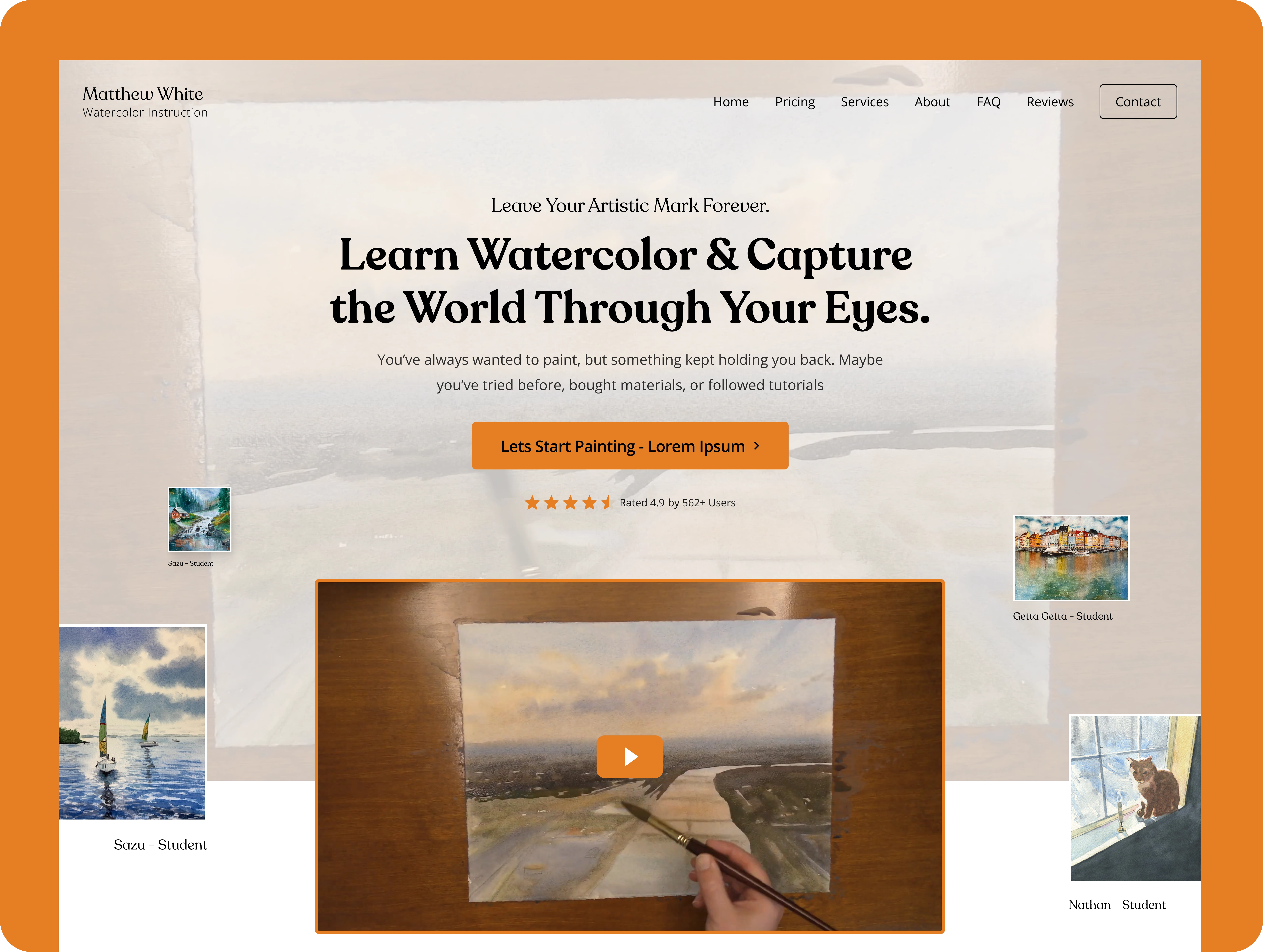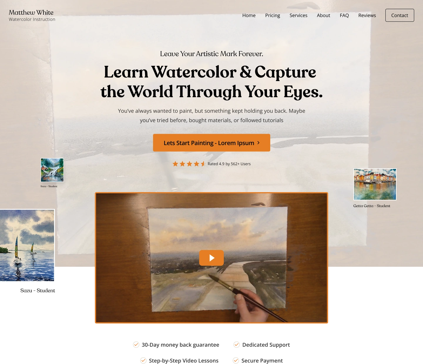 The site introduces a structured watercolor painting course, guiding students from complete beginner to confident creator. It outlines the benefits, showcases featured artwork, offers testimonials, and breaks down what’s included in the course bundle.
