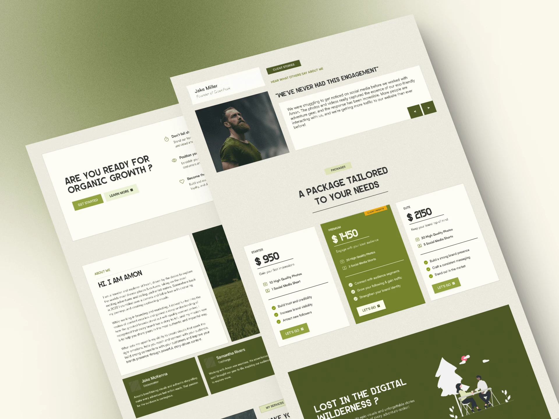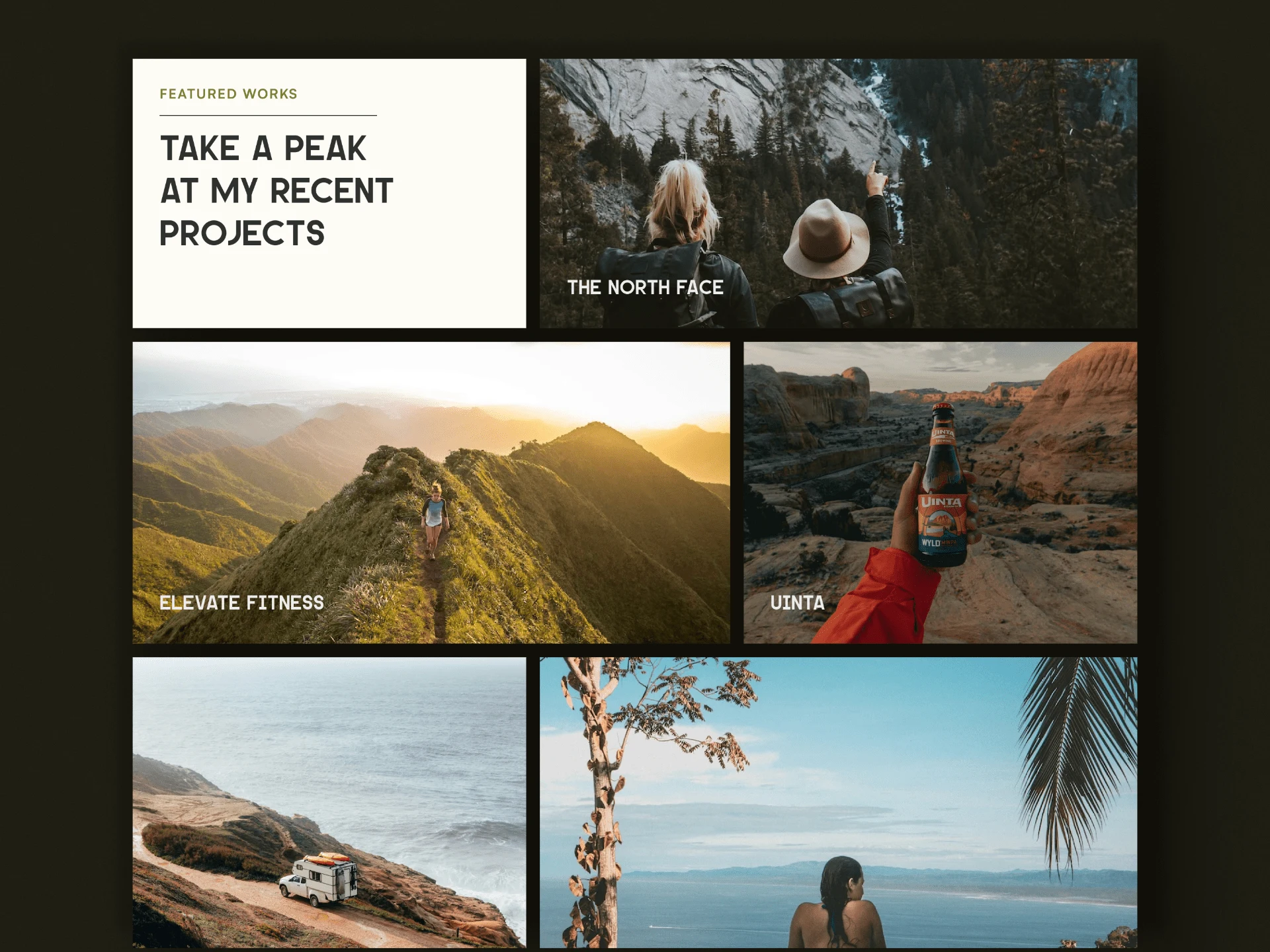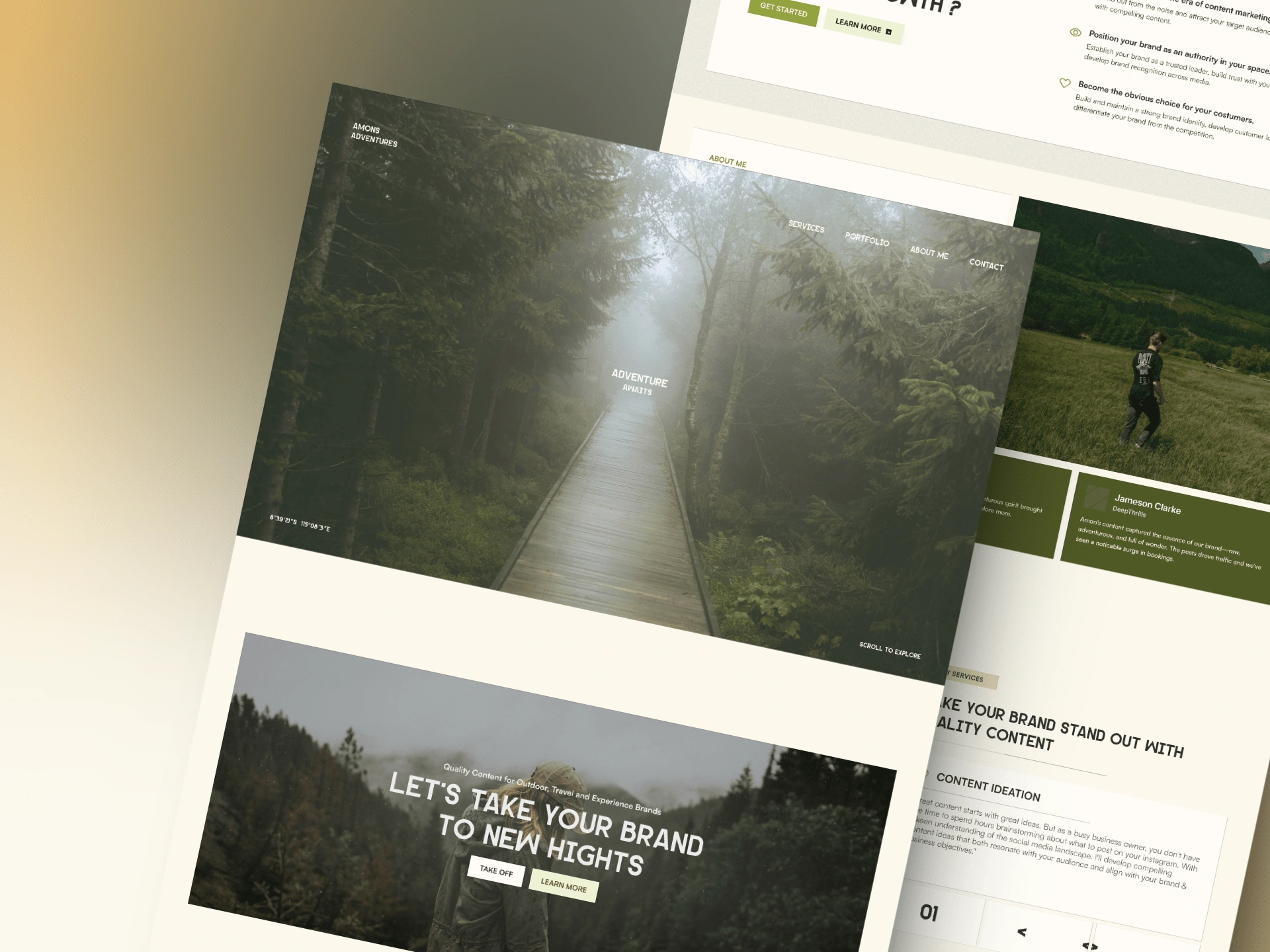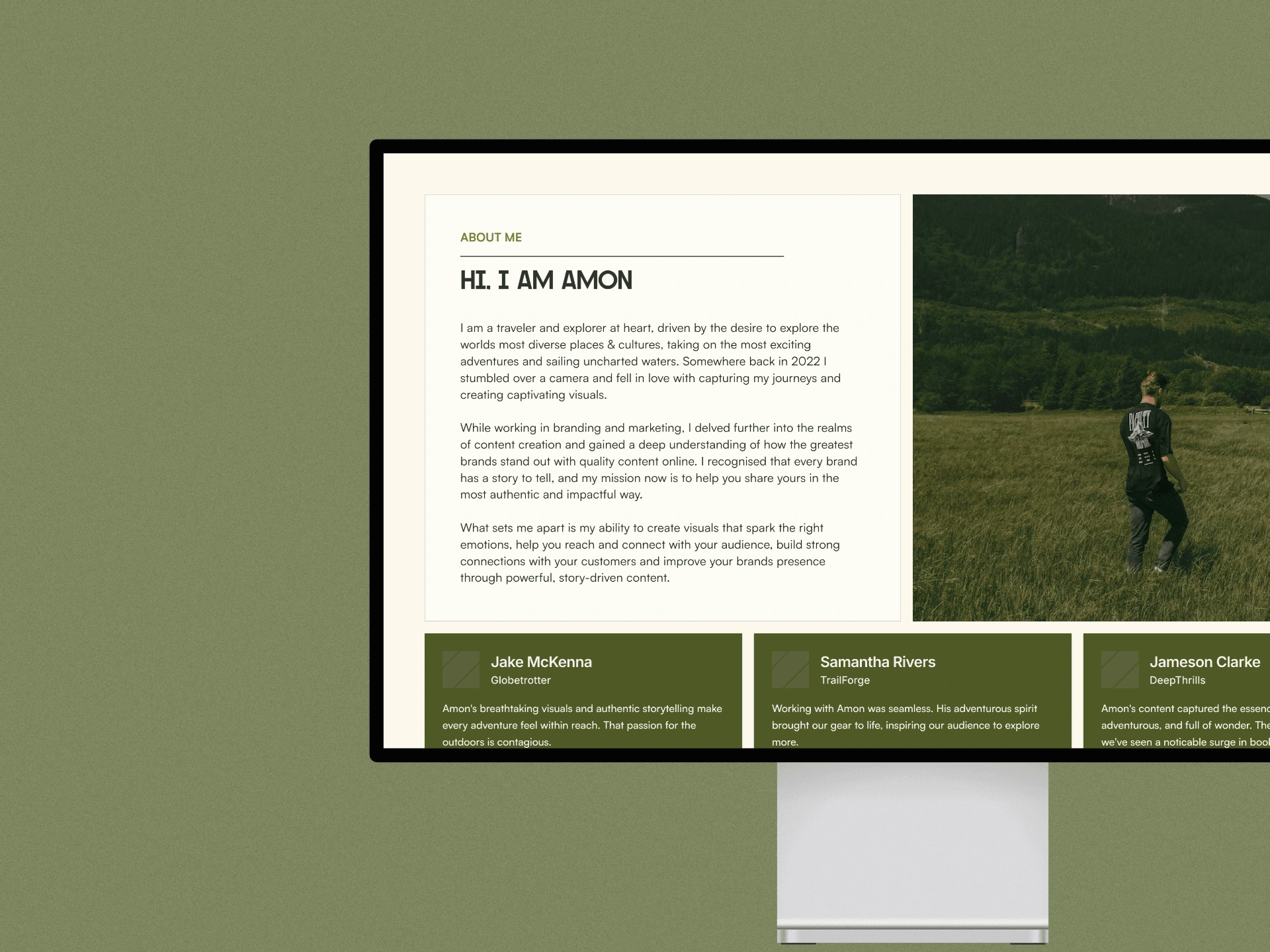 To align the creator's positioning with the target niche of travel, outdoor, and experience-focused brands, I based the branding and website design on a simple palette of natural colors, complemented by a bold yet playful, outdoorsy typeface. The rich pastel green primary color reflects the creator's nature-centered content while also symbolizing the growth his work aims to bring to brands.