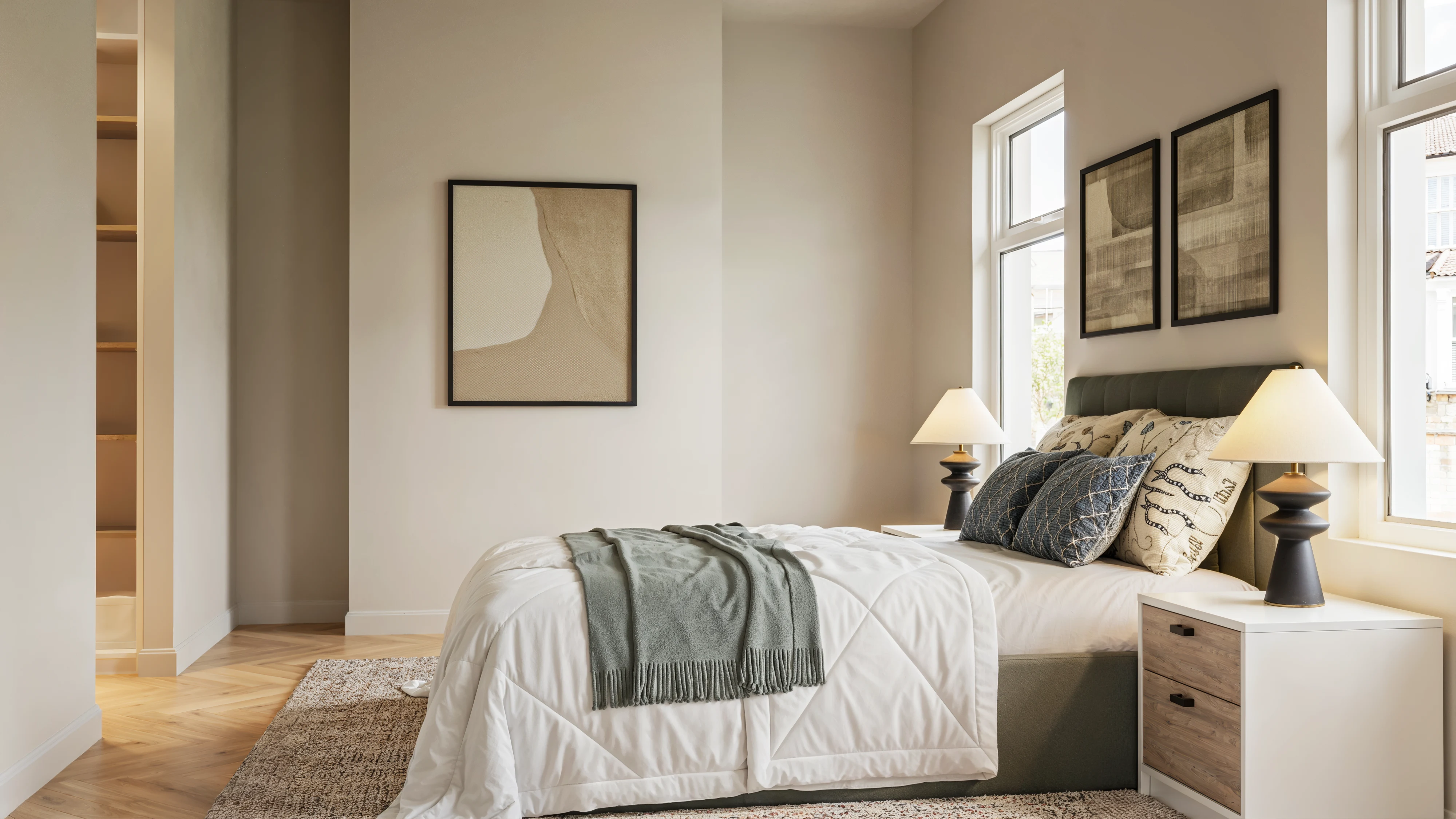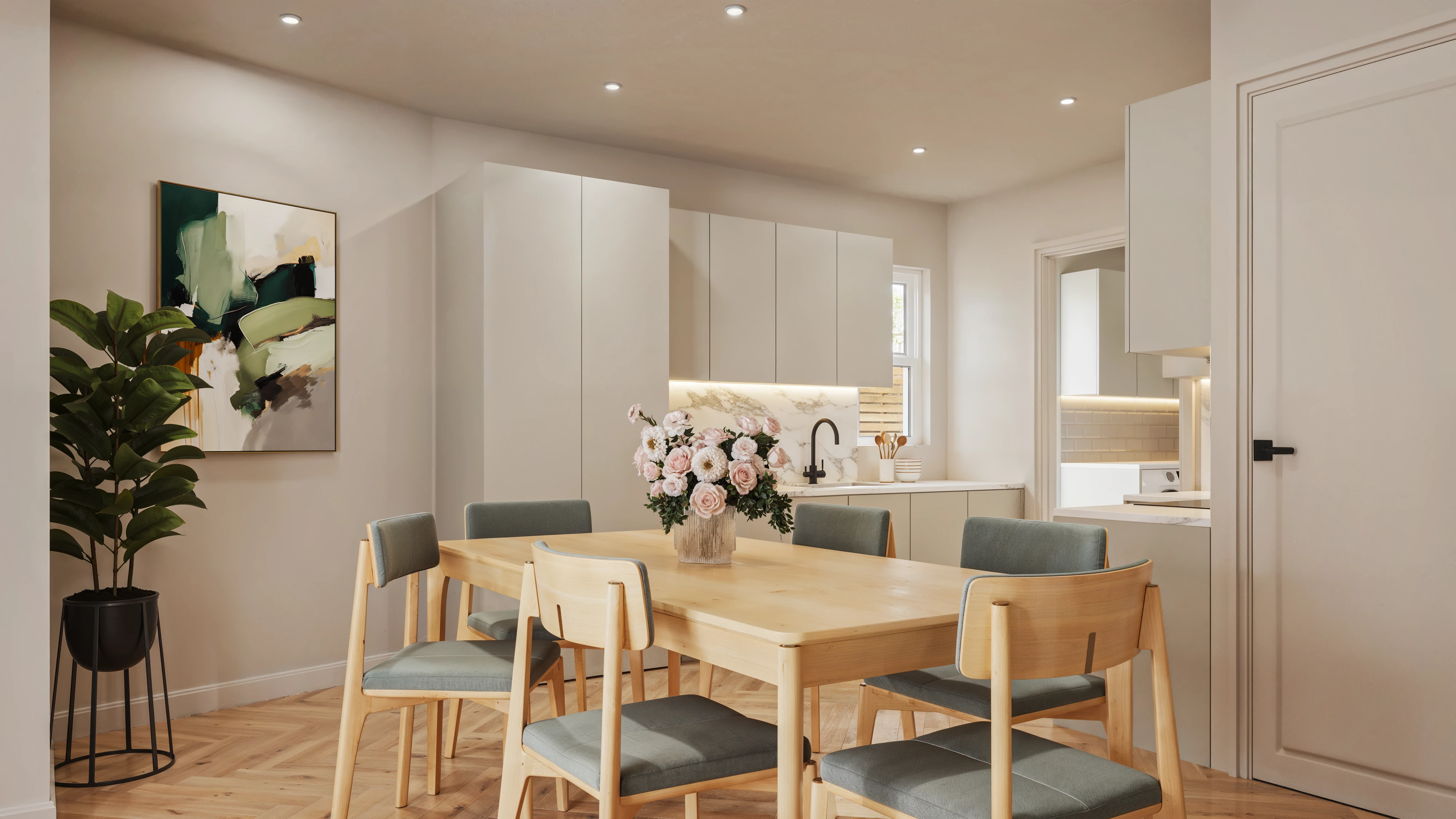 A set of 3D visualizations for an apartment interior. Focuses on modern contemporary styling. Realistic materials, lighting and textures.