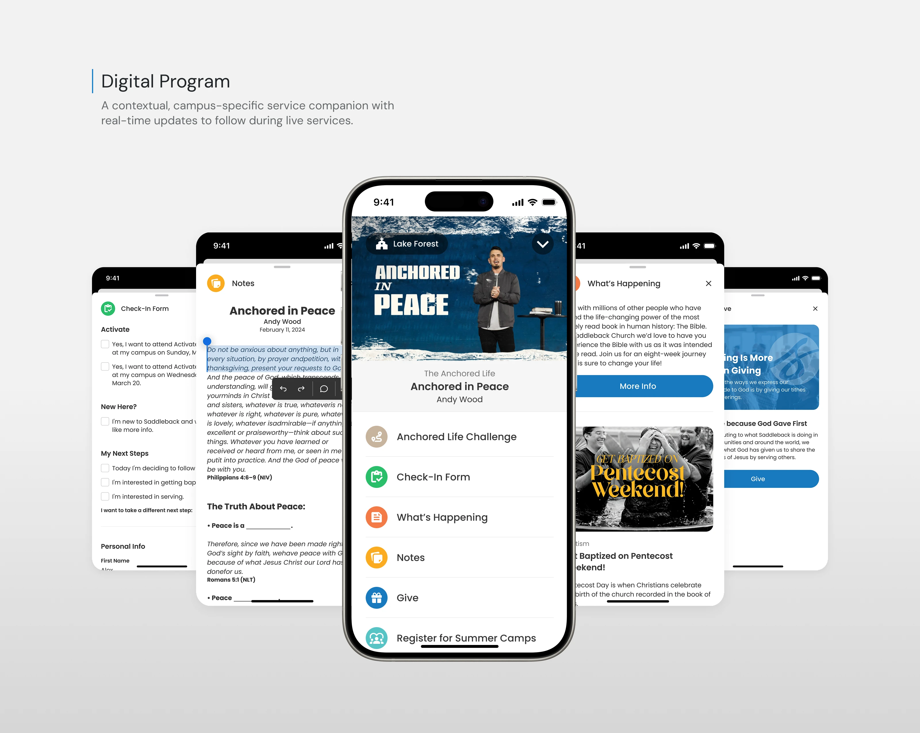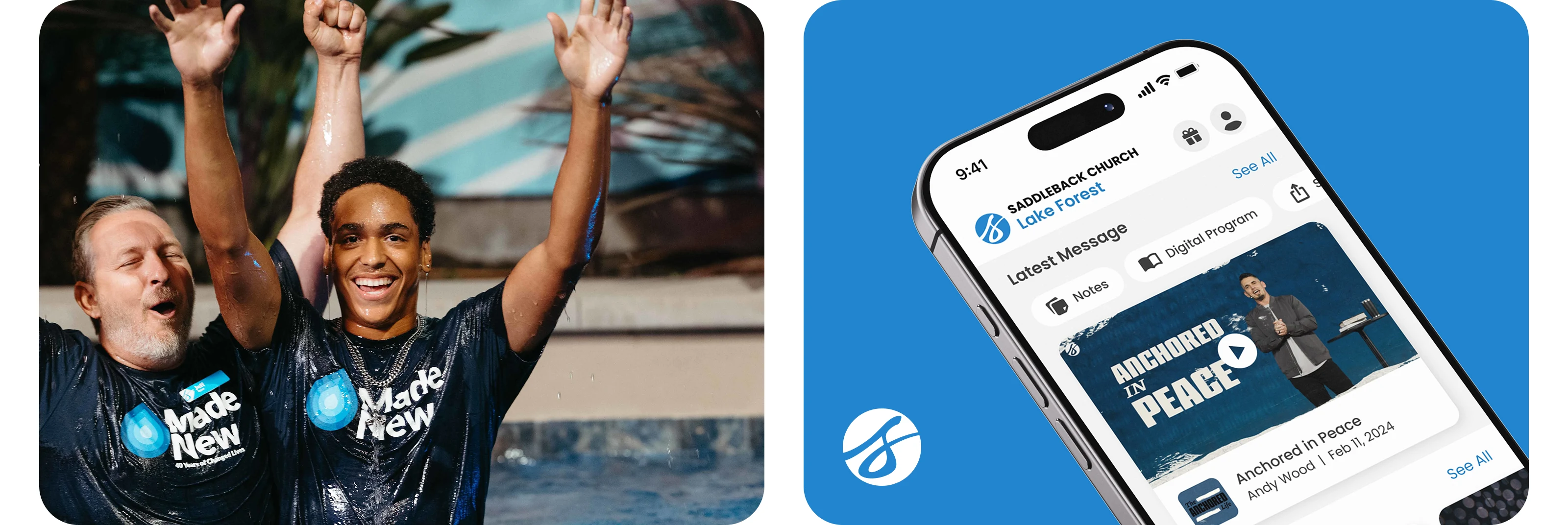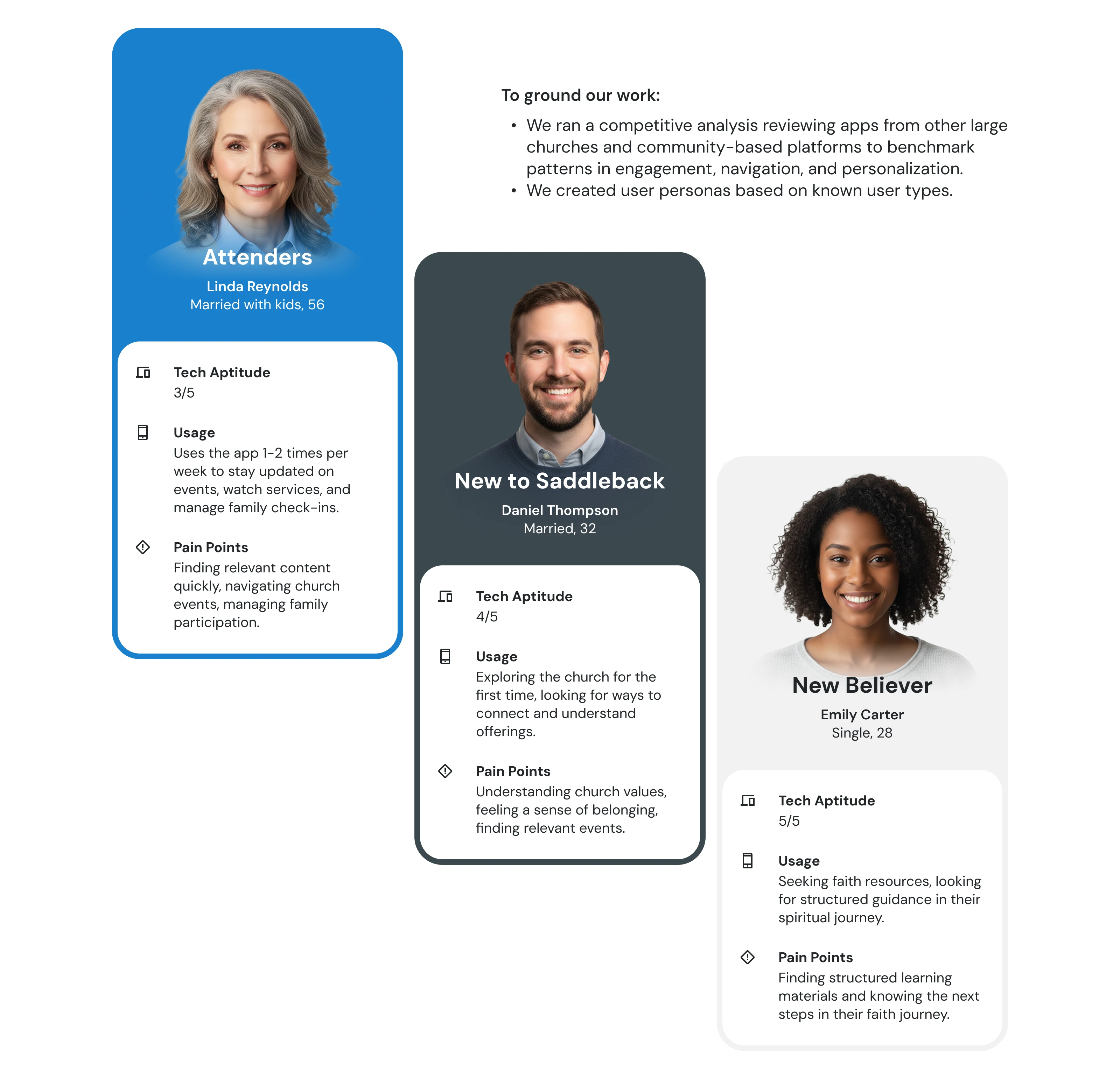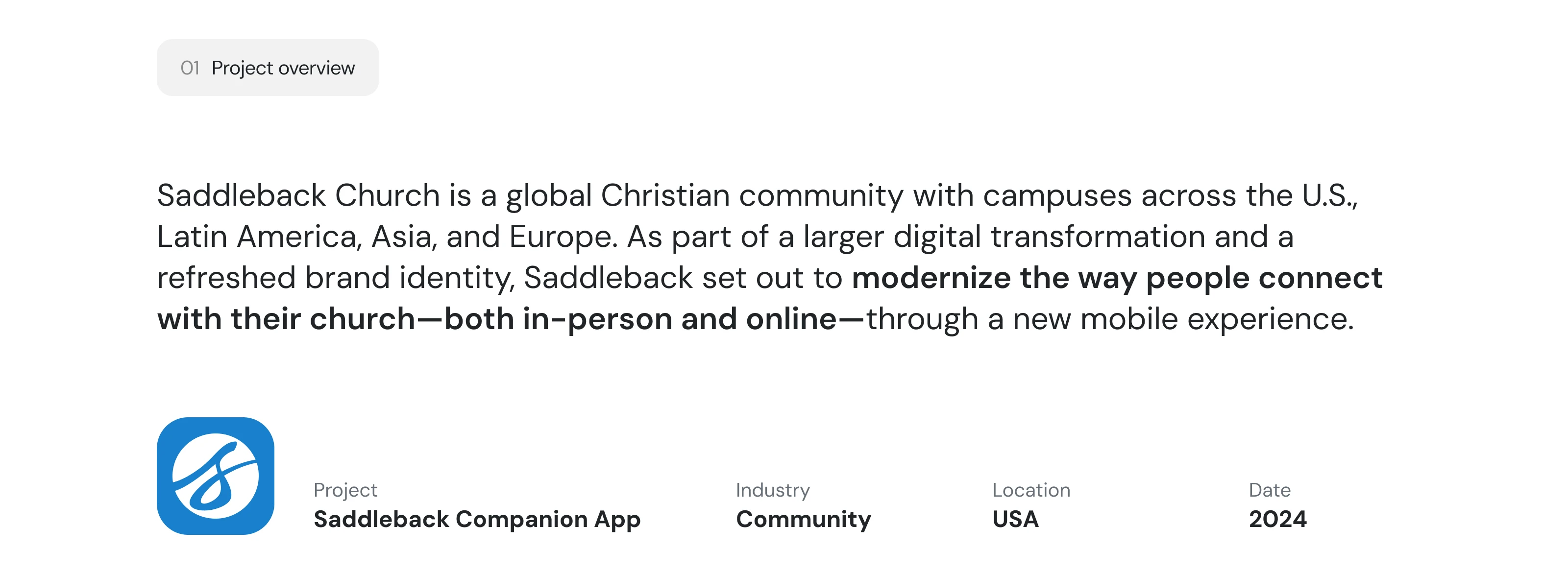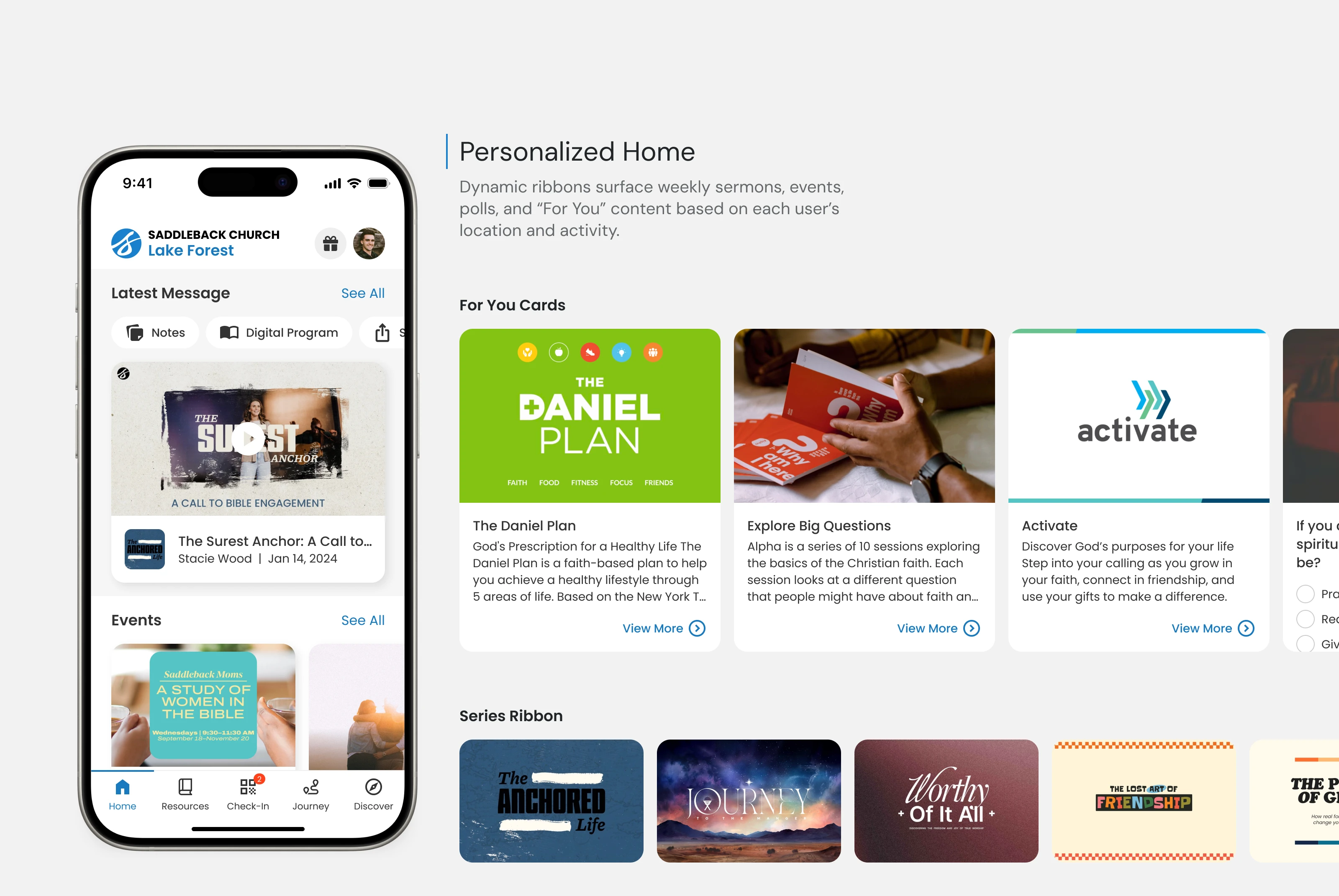 Mobile app redesign for Saddleback Church as part of a digital transformation, achieving a 4.1 App Store rating and 10K+ downloads on Google Play.