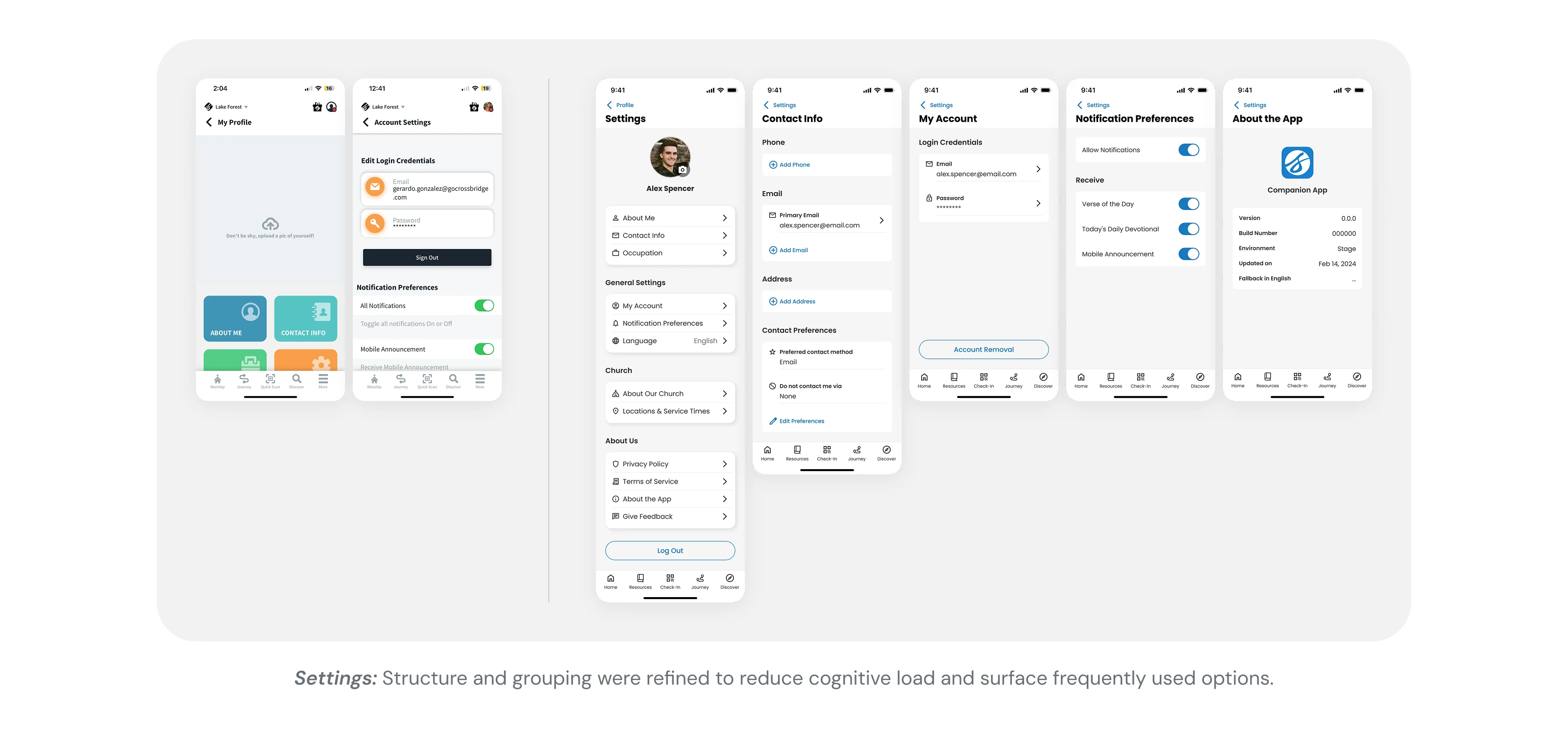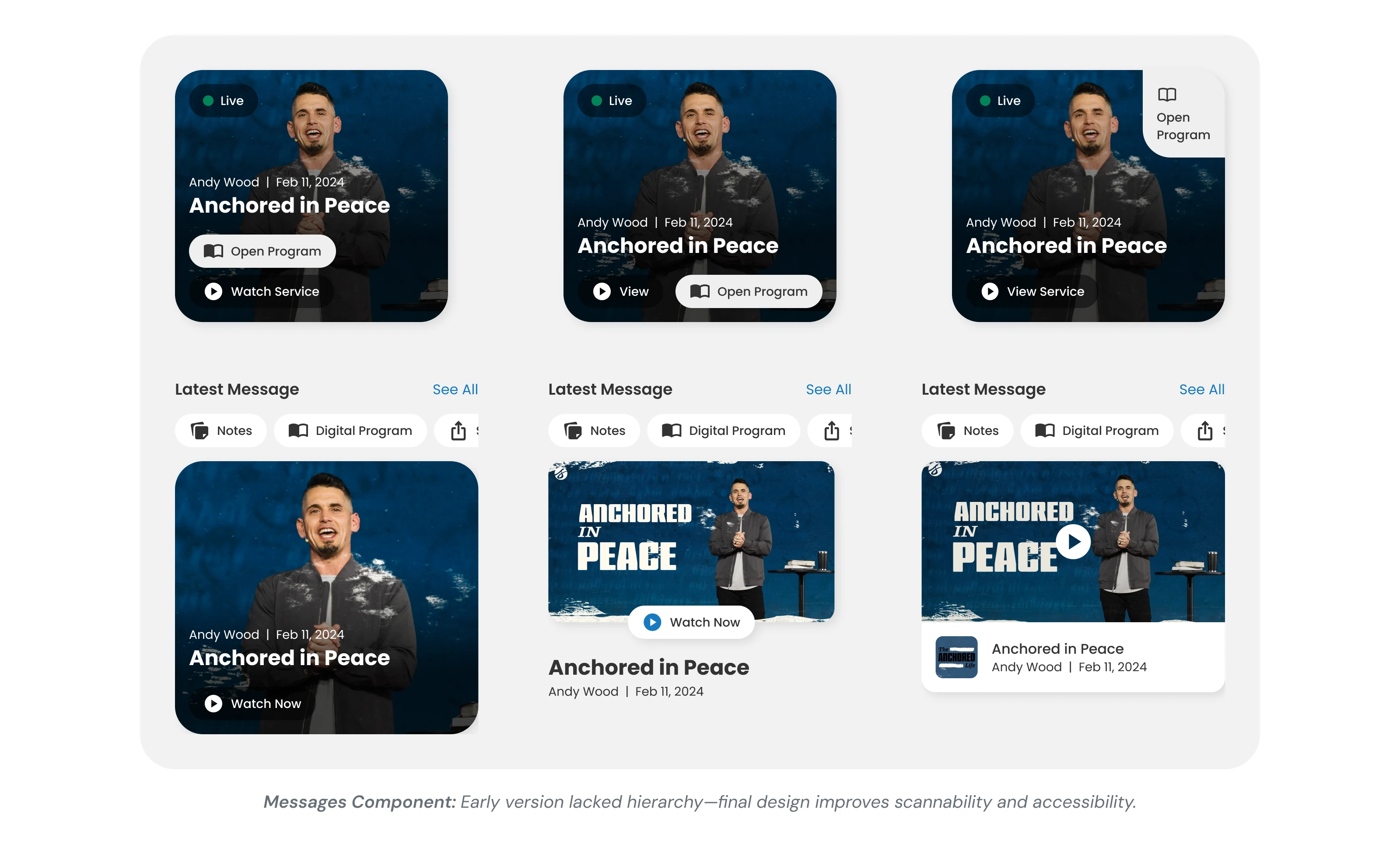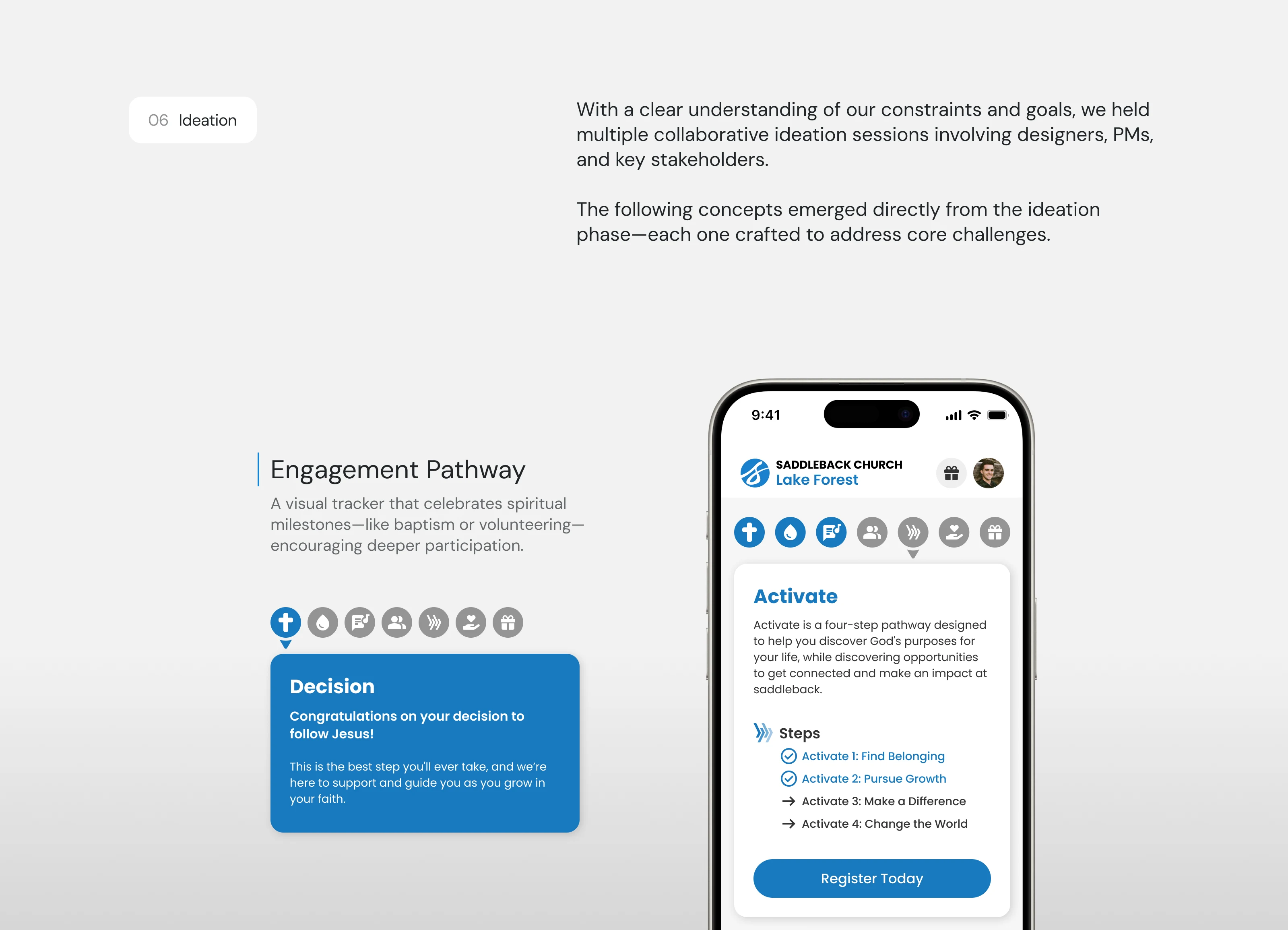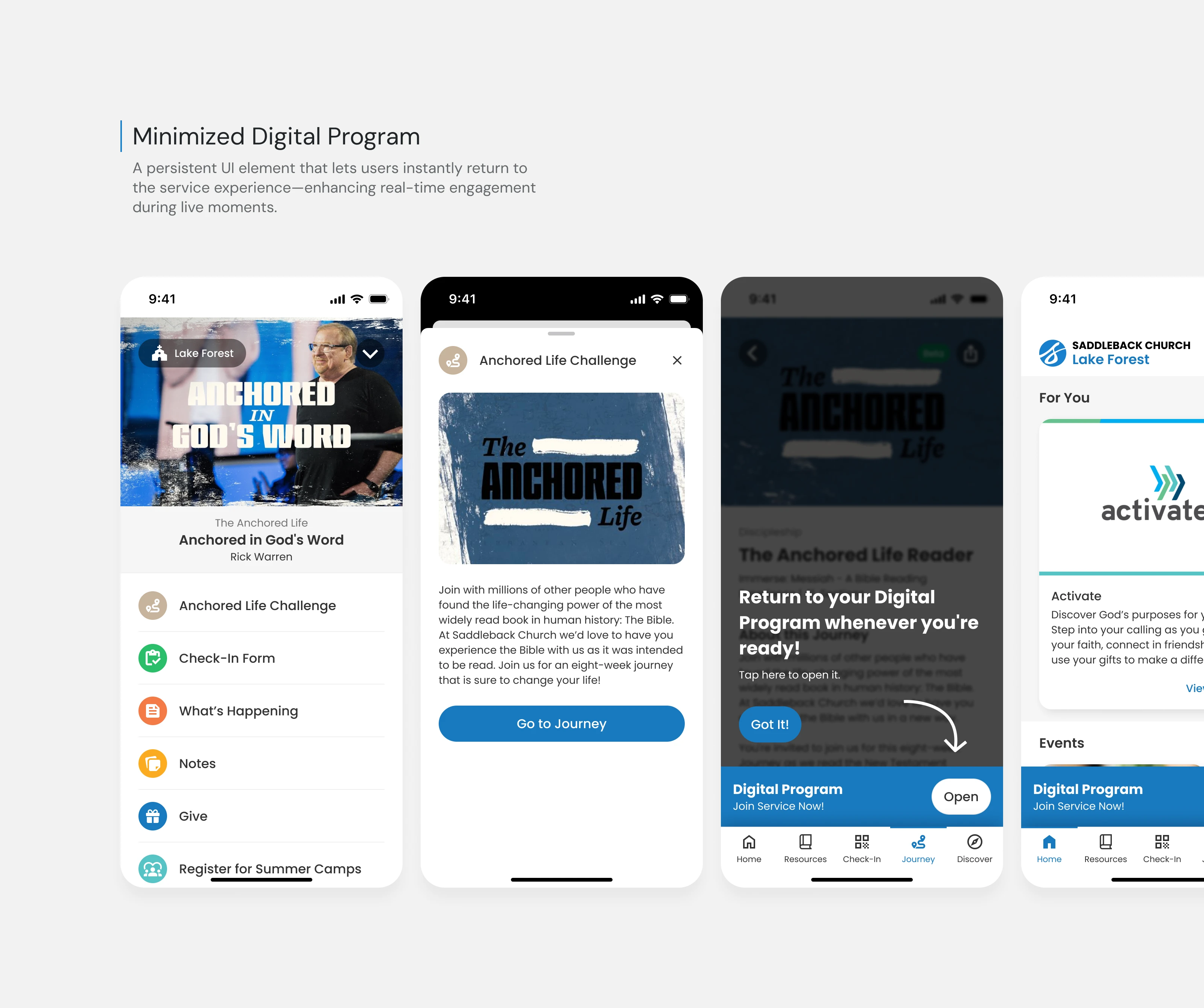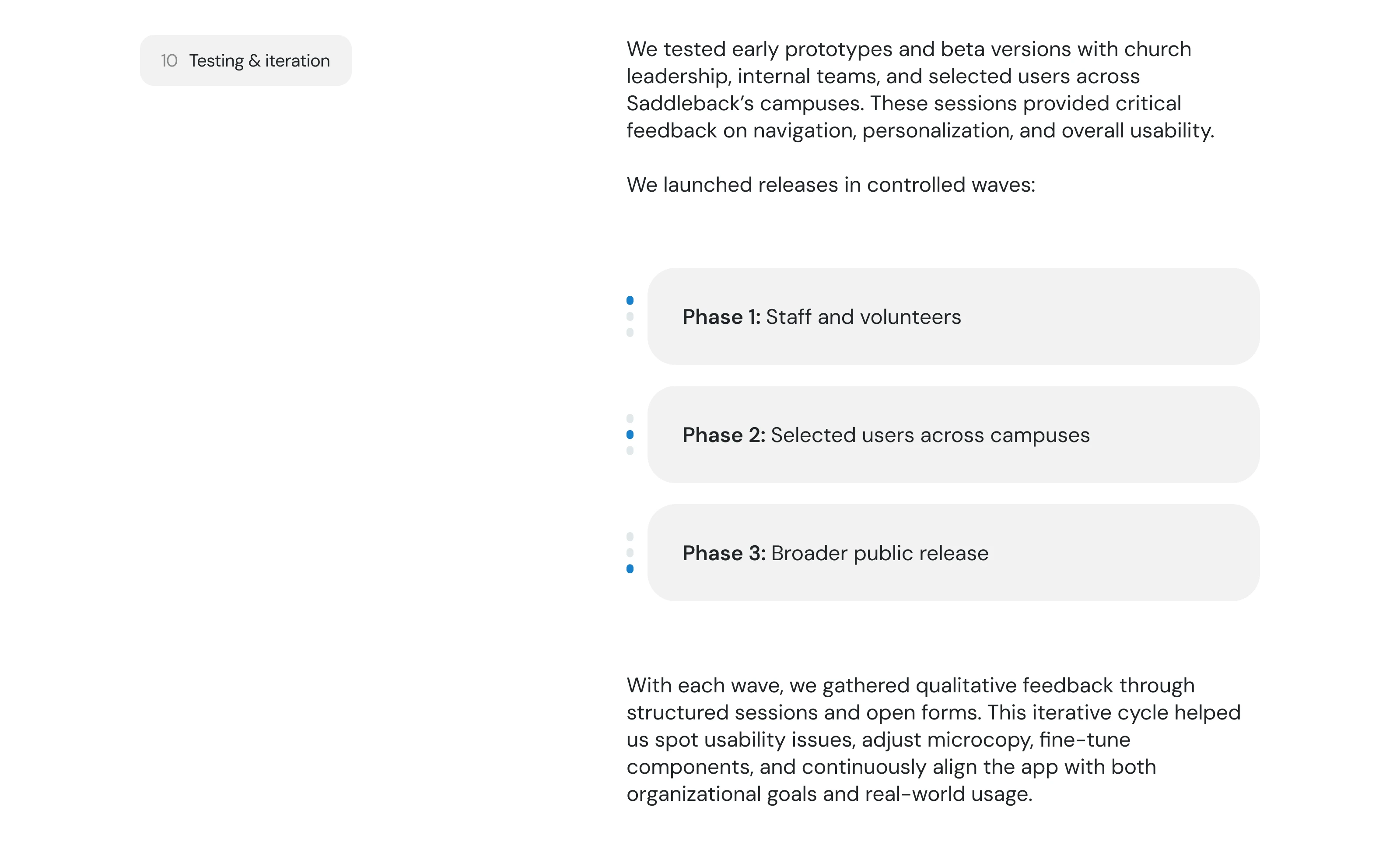 Mobile app redesign for Saddleback Church as part of a digital transformation, achieving a 4.1 App Store rating and 10K+ downloads on Google Play.