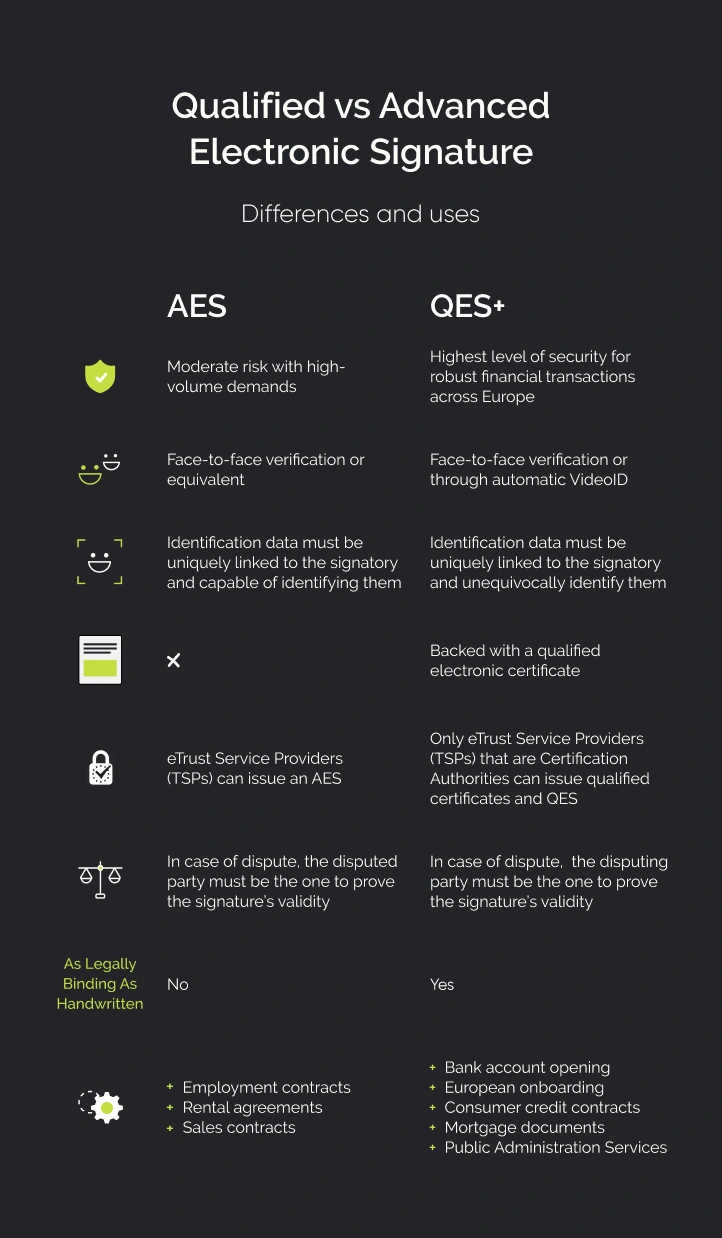 : SES, AES and QES. This post clarifies the different digital signatures and provides guidance on which one may suit your business needs.