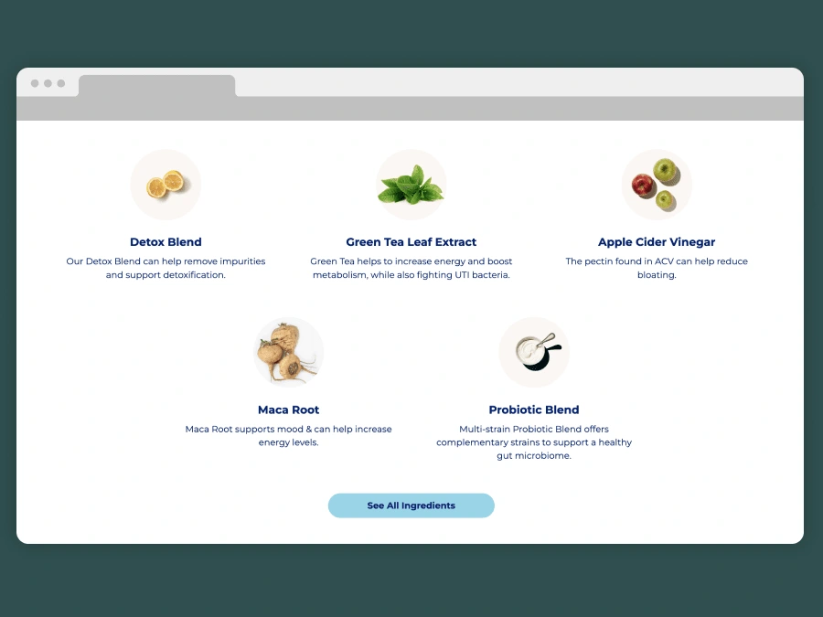 Full Shopify store for health supplement brand Her Own. The store has a mini-cart and it needed an extensive ingredients list that could be referenced in other parts of the website.