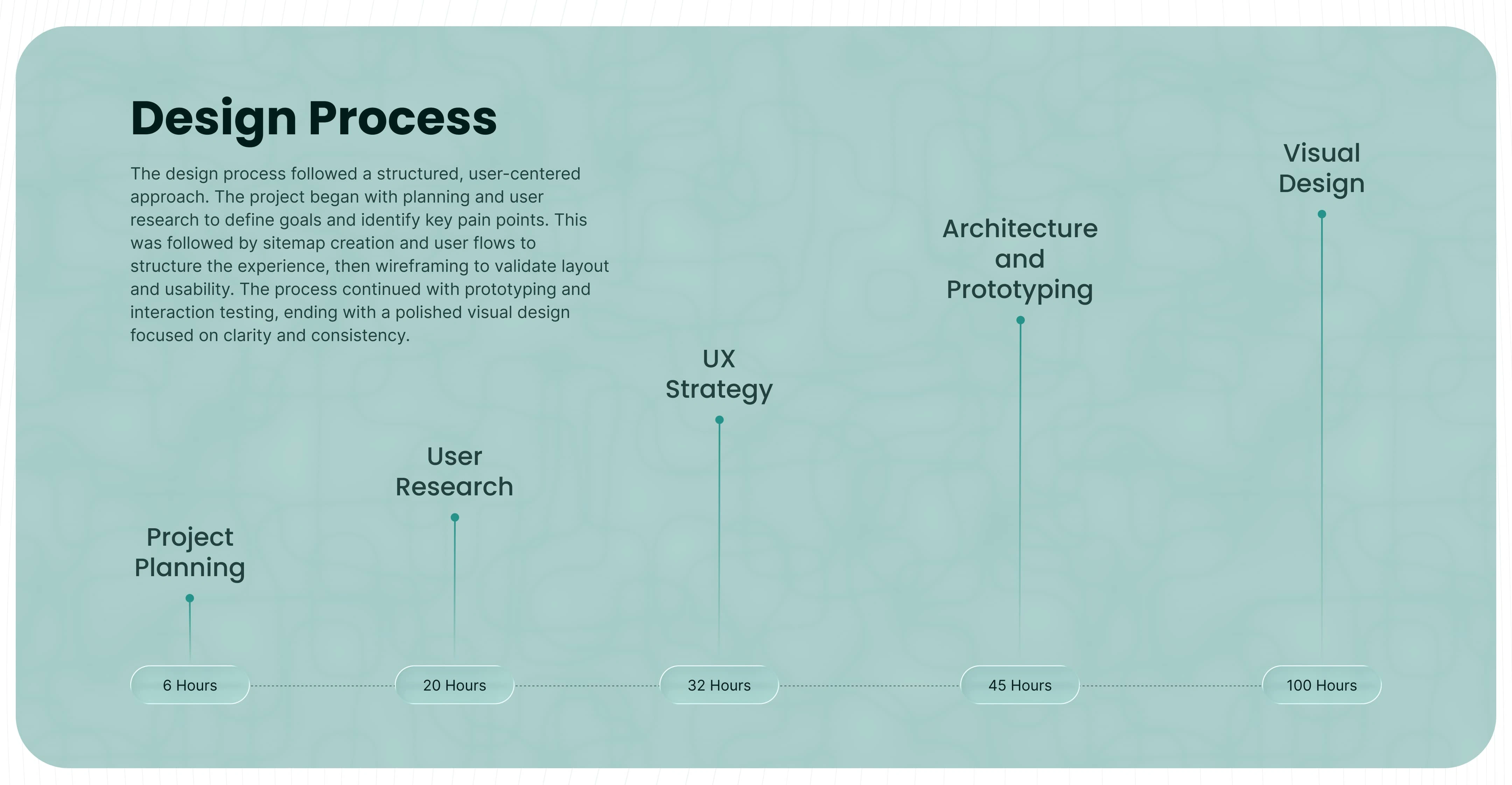 The design process followed a structure, user-centered approach. The project began with planning and user research to define goals and identity key pain points.