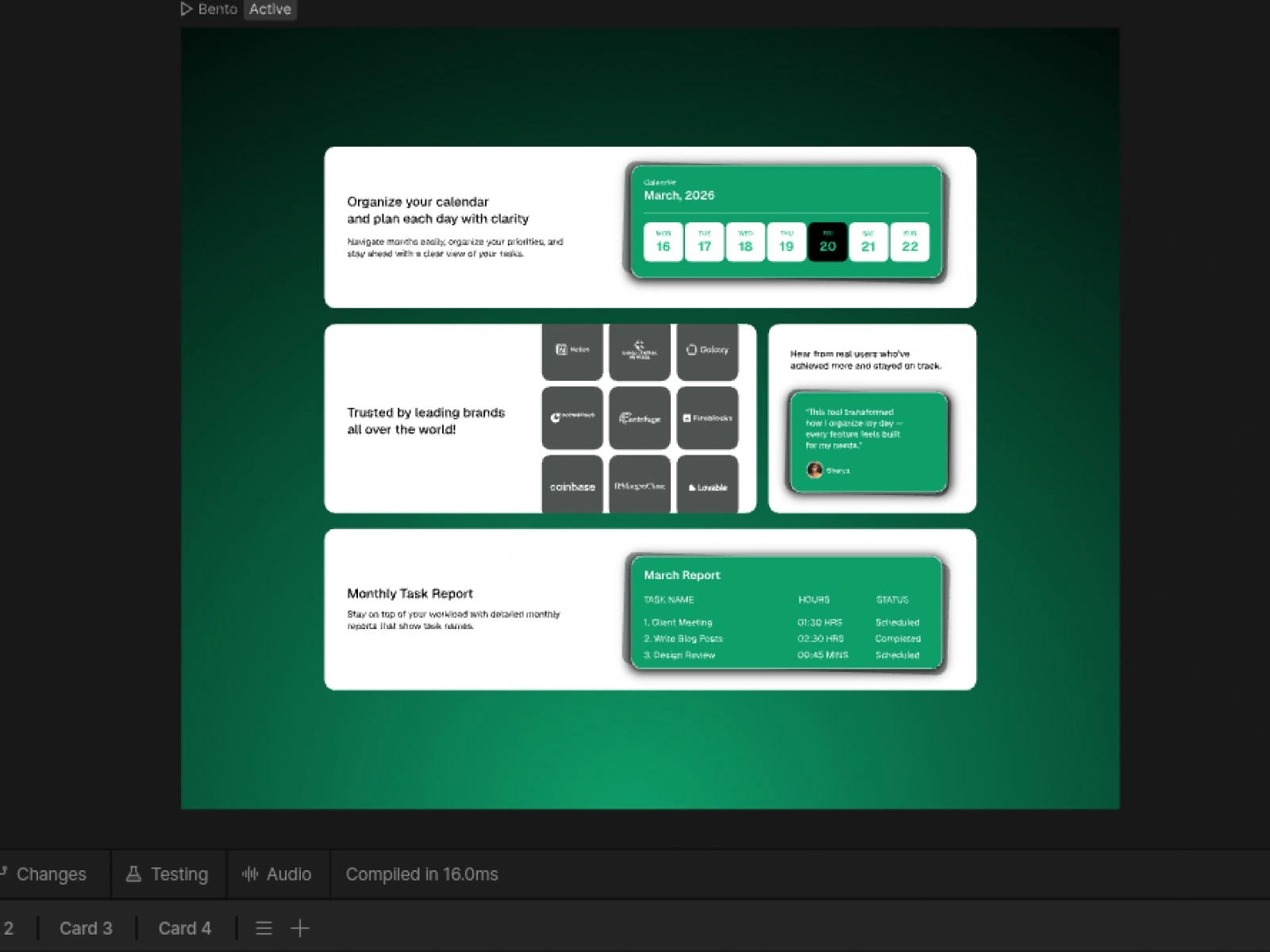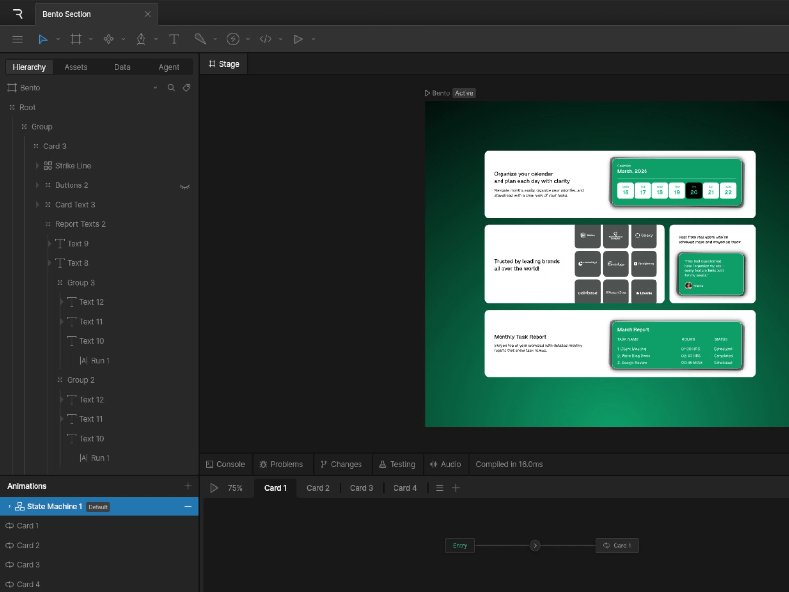 Created minimalist animated cards for Bento Section using Rive. I have learned so much and have fun working on this Bento.
