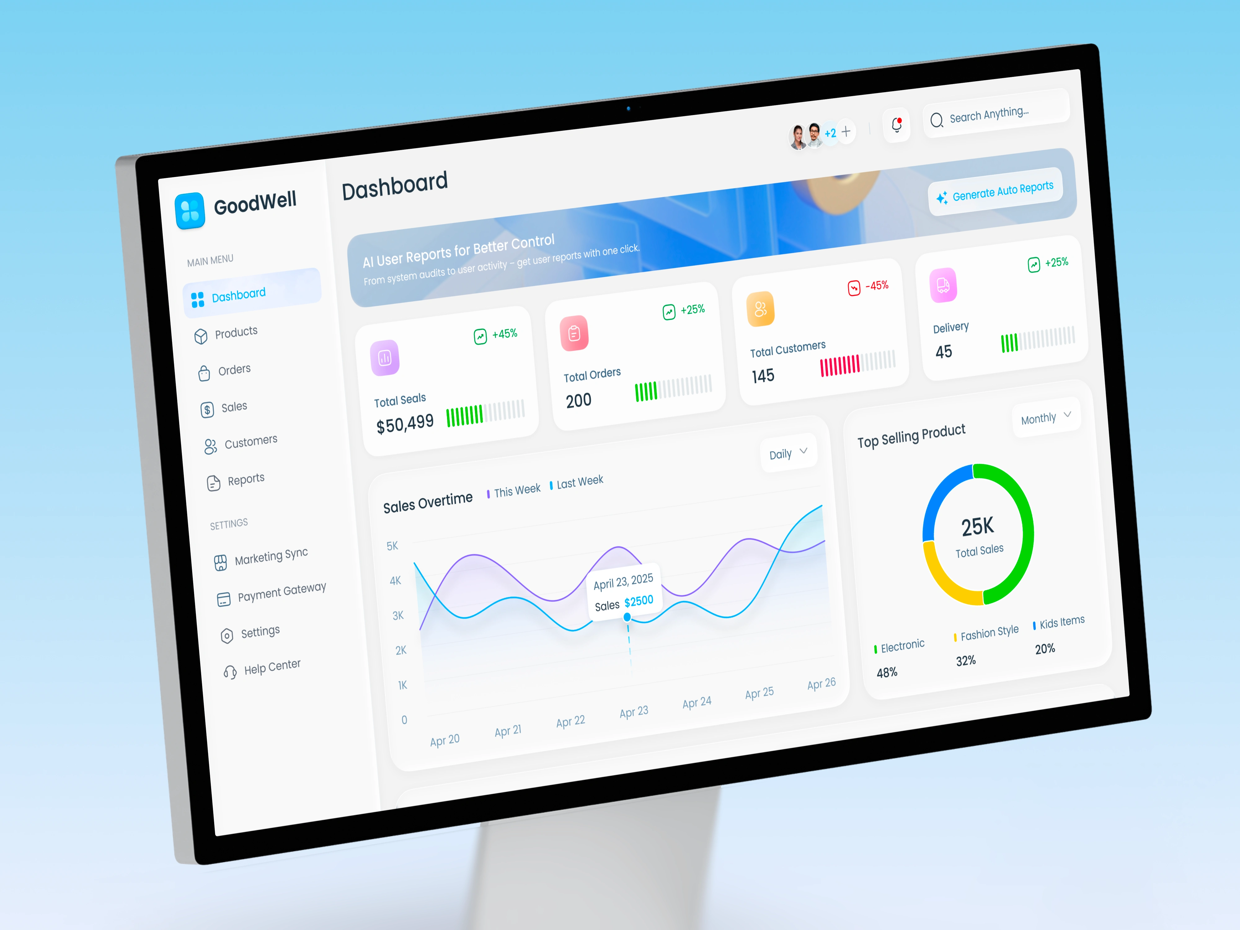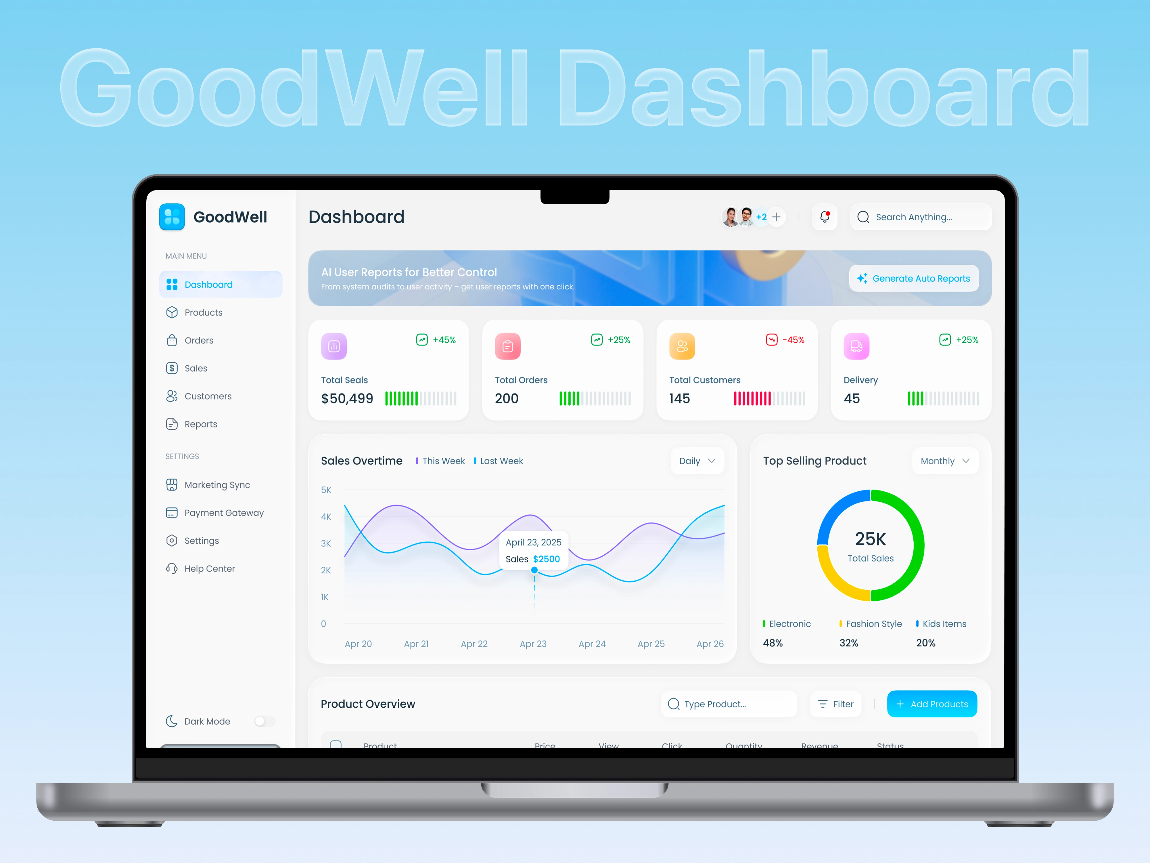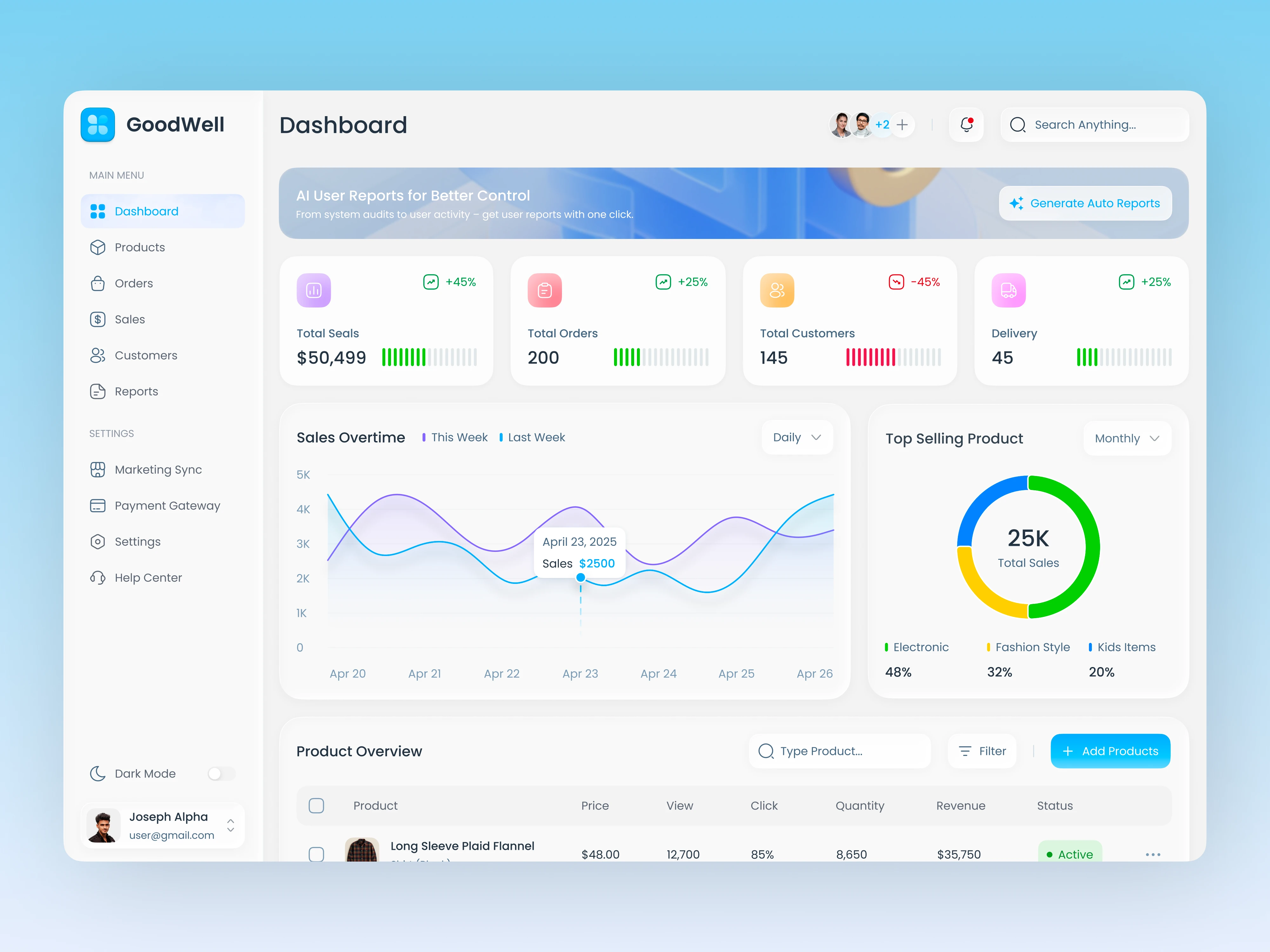 The redesigned dashboard features real-time KPI cards for sales, orders, customers, and deliveries. A clean sales overtime chart allows effortless weekly comparisons, while a product performance table helps identify high-value opportunities. The category donut chart highlights trends across Electronic, Fashion, and Kids Items for immediate strategic context.