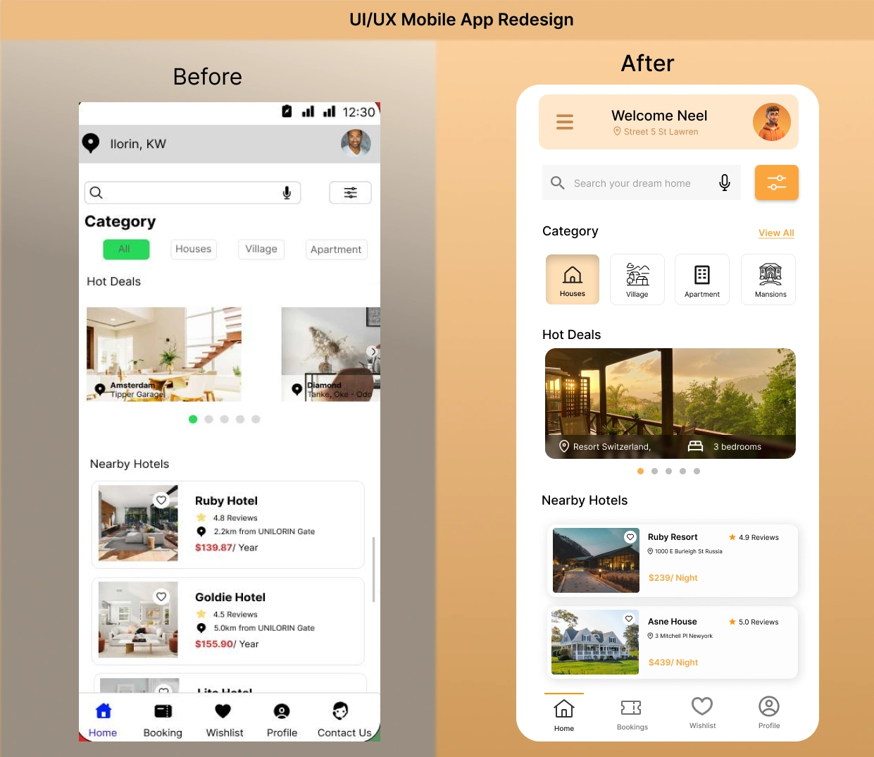 Section 1: Home PageBefore: Basic and less interactive.After: Personalized user greeting, streamlined navigation, and visually appealing elements.