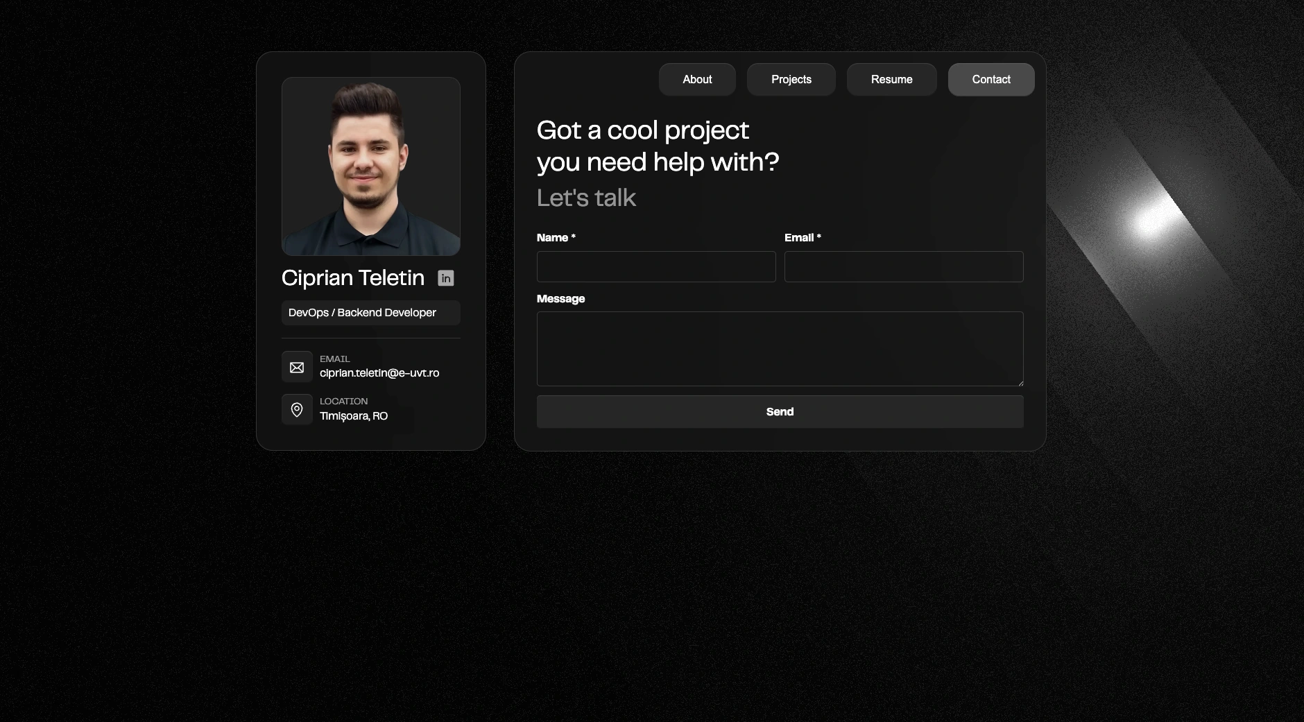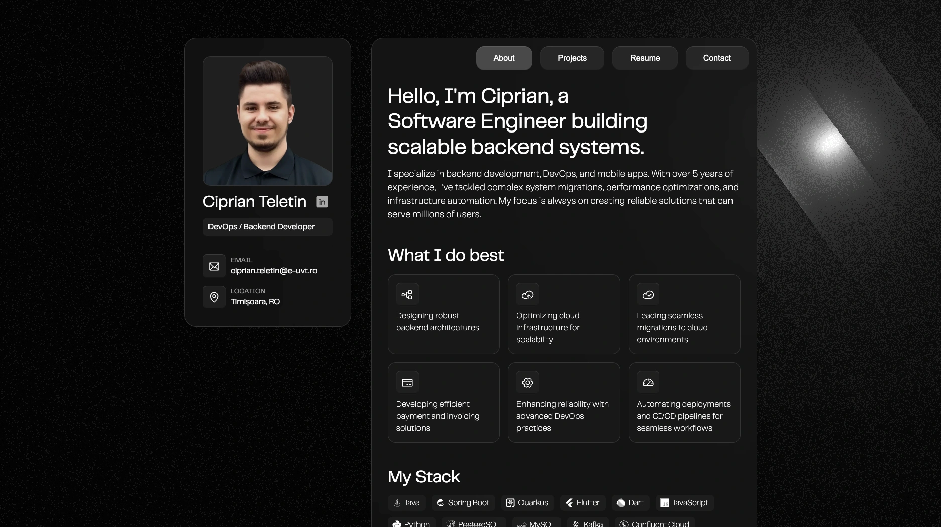 I designed and built a full portfolio site for Ciprian Teletin, a backend and DevOps engineer, with the goal of positioning him as a high-credibility technical professional. The work covered branding, visual direction, layout structure, and web implementation.