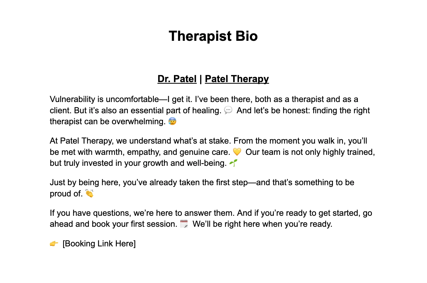 I created this bio for a hypothetical therapist who needed a bio that displayed their authentic intentions. This bio would make clients feel safe and ready.