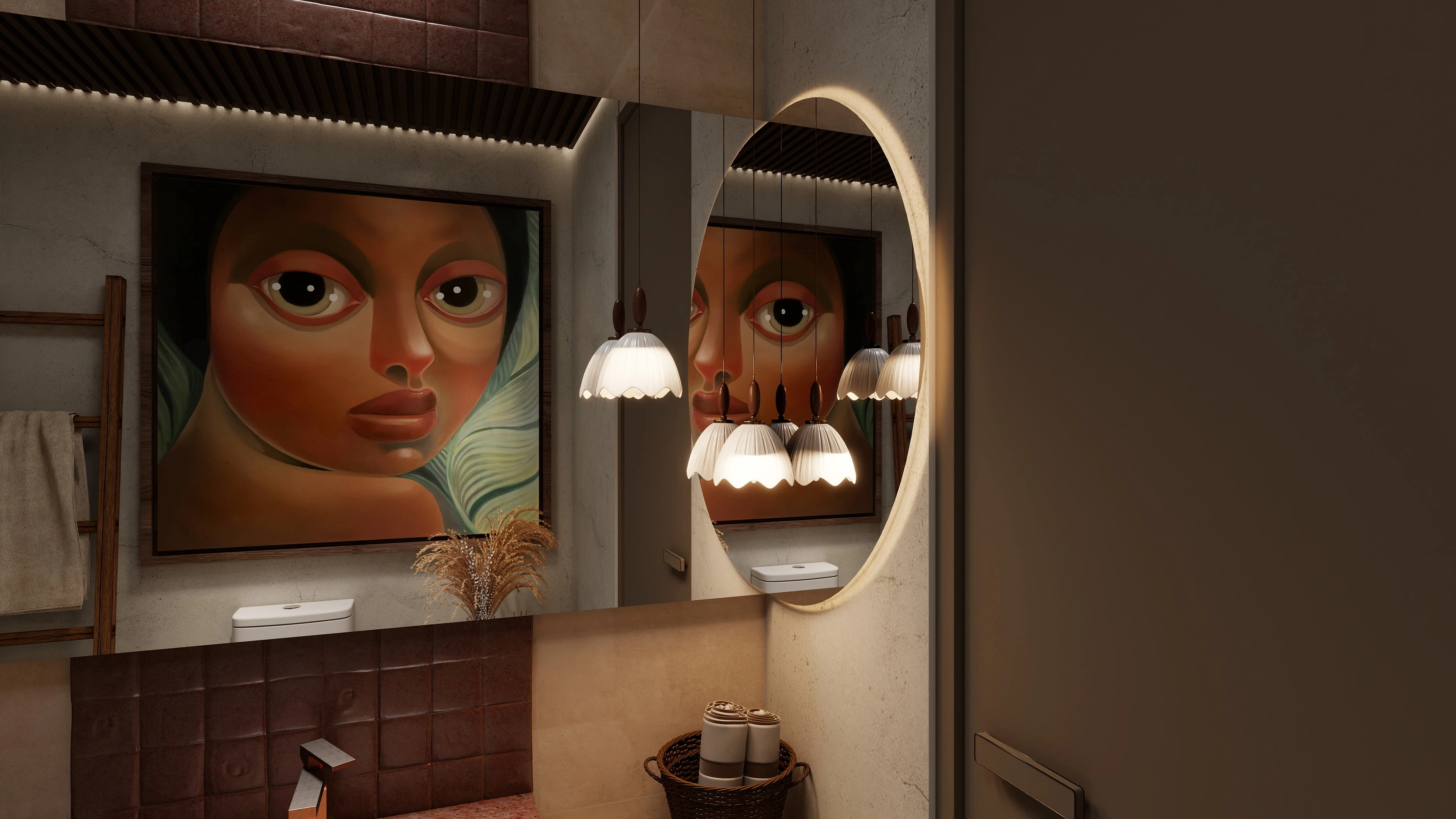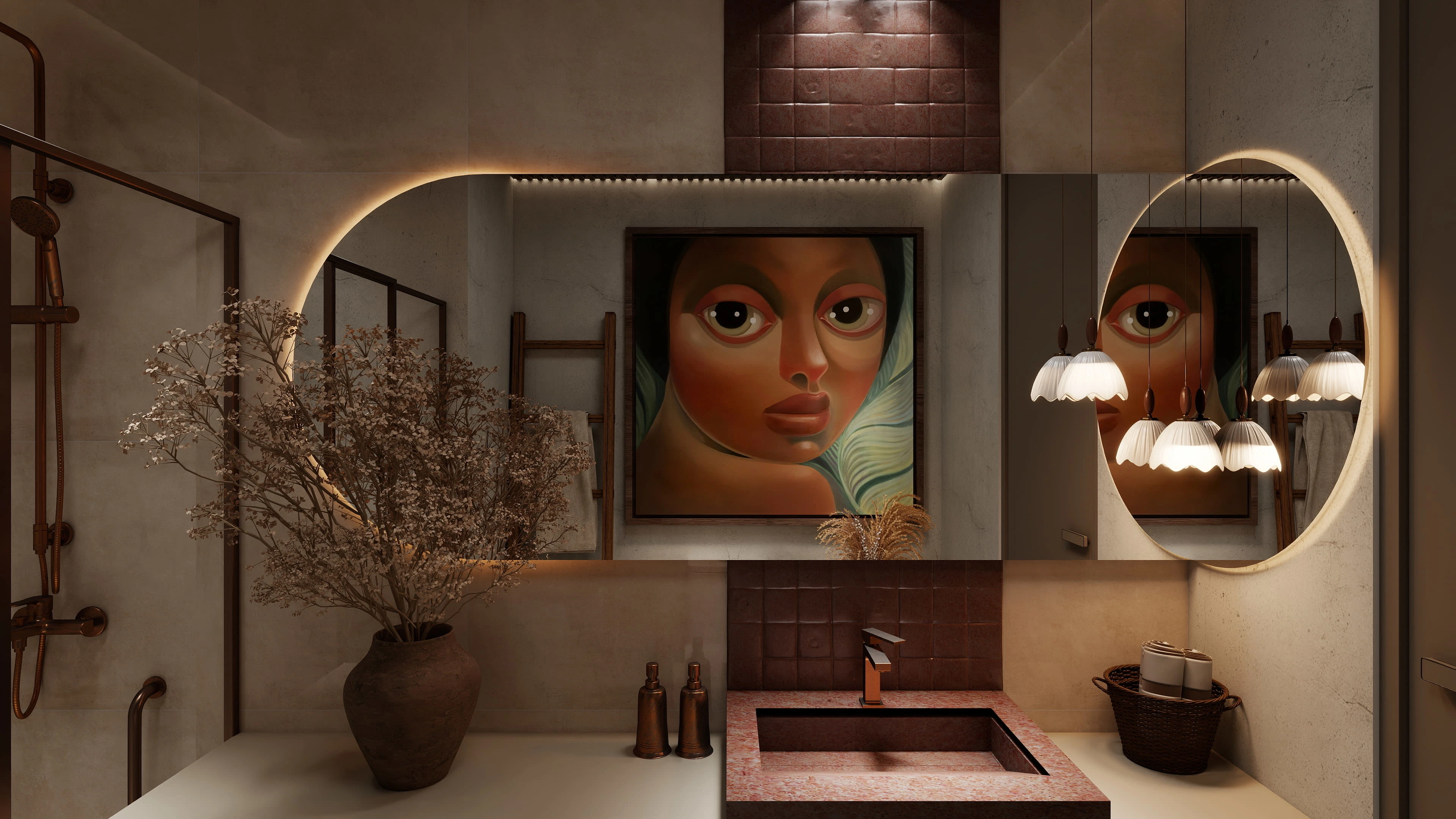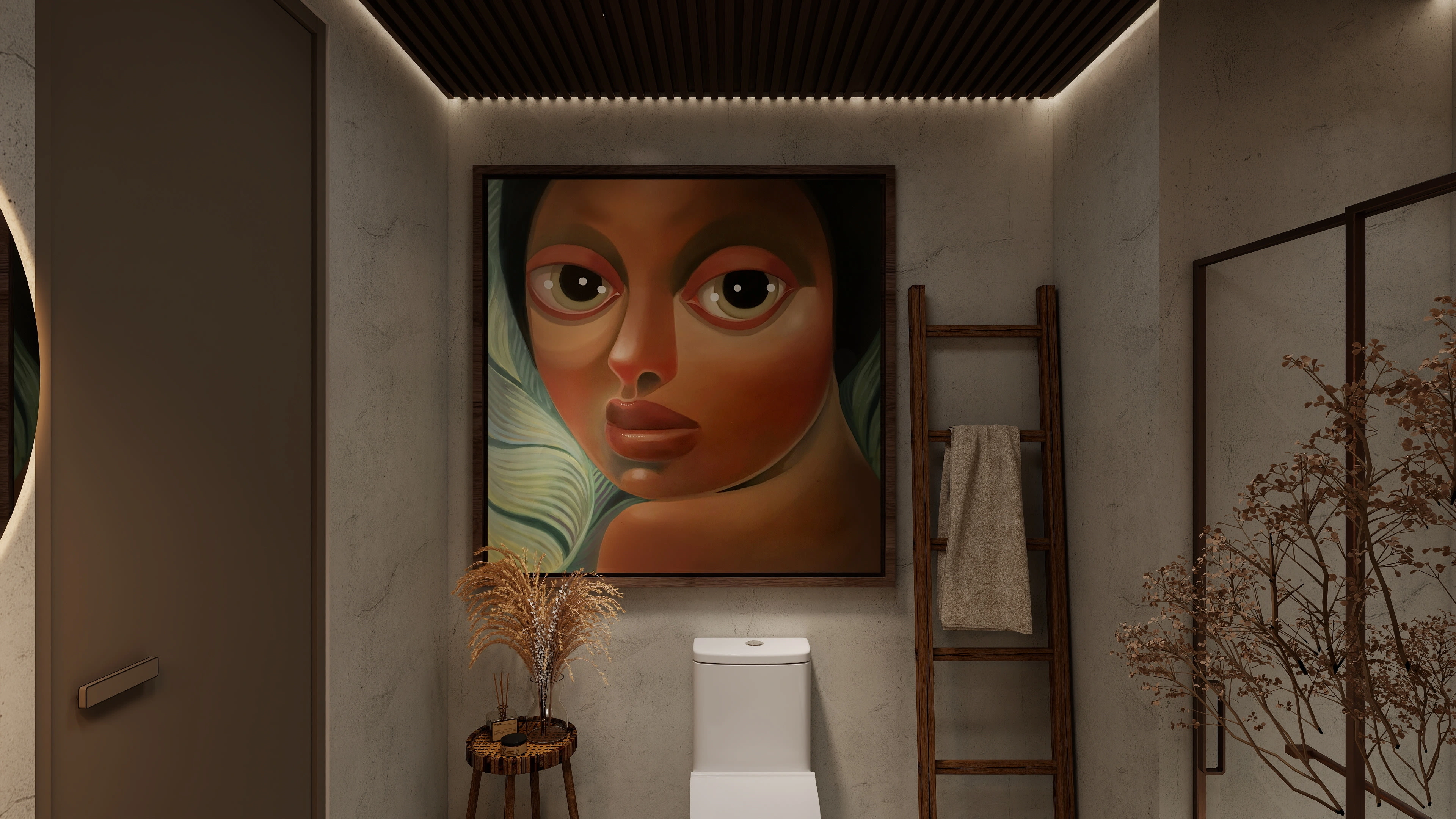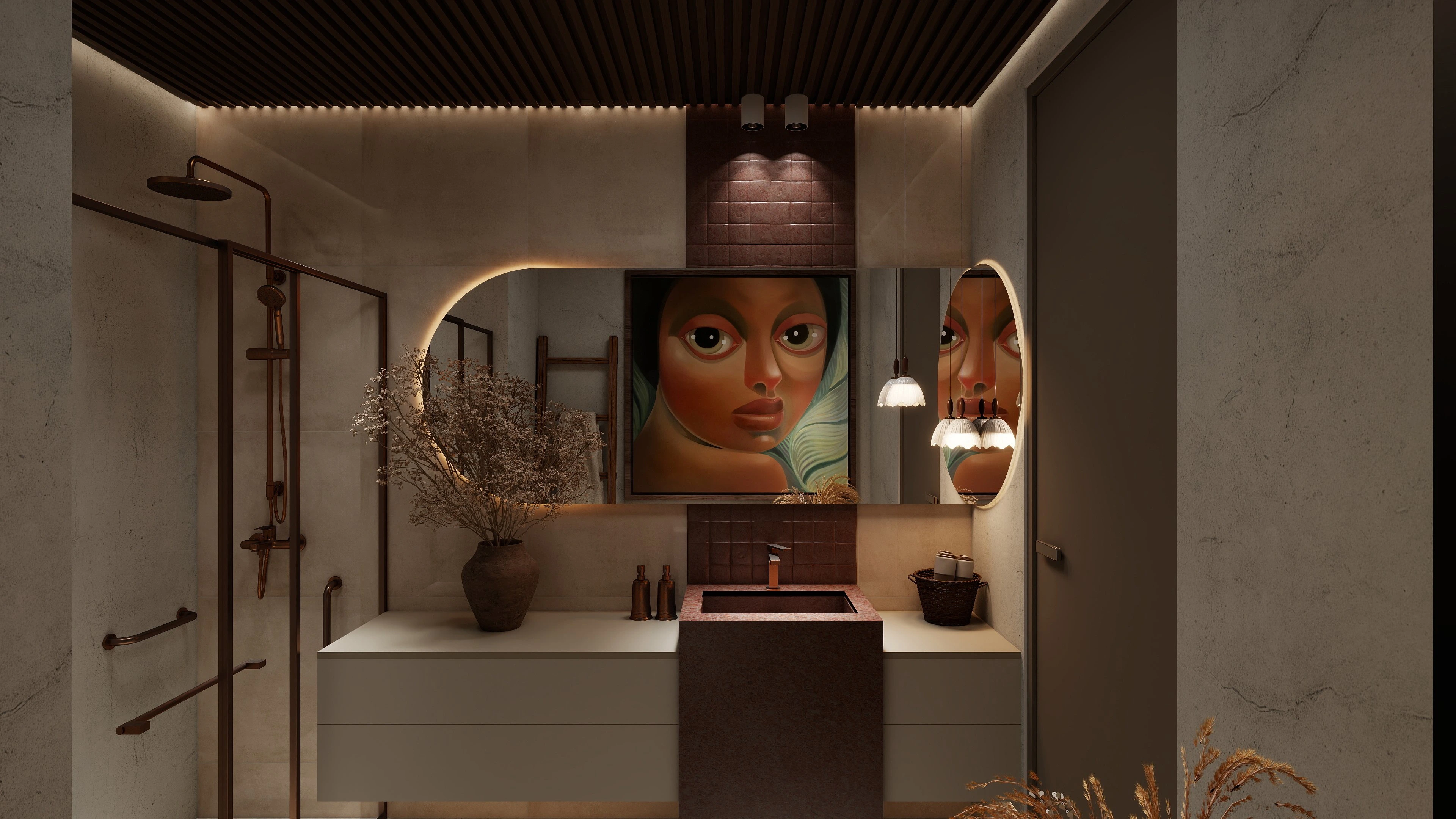 For a client accustomed to a neutral, all-beige aesthetic, I designed this bathroom as a strategic 'creative explosion.' The goal was to introduce drama and character without overwhelming the home's overall harmony. Centered around a captivating focal portrait, the space balances raw industrial textures with warm, sophisticated accents. By layering wooden ceiling slats, copper fixtures, and a bespoke textured vanity, I transformed a functional room into a multisensory retreat that proves bold design can coexist with subtle elegance.
