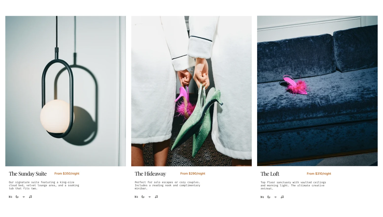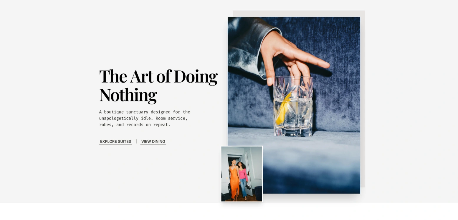 Landing page for a boutique hotel brand. Draws from print editorial inspiration. Built in Framer and responsive across desktop, tablet, and mobile.