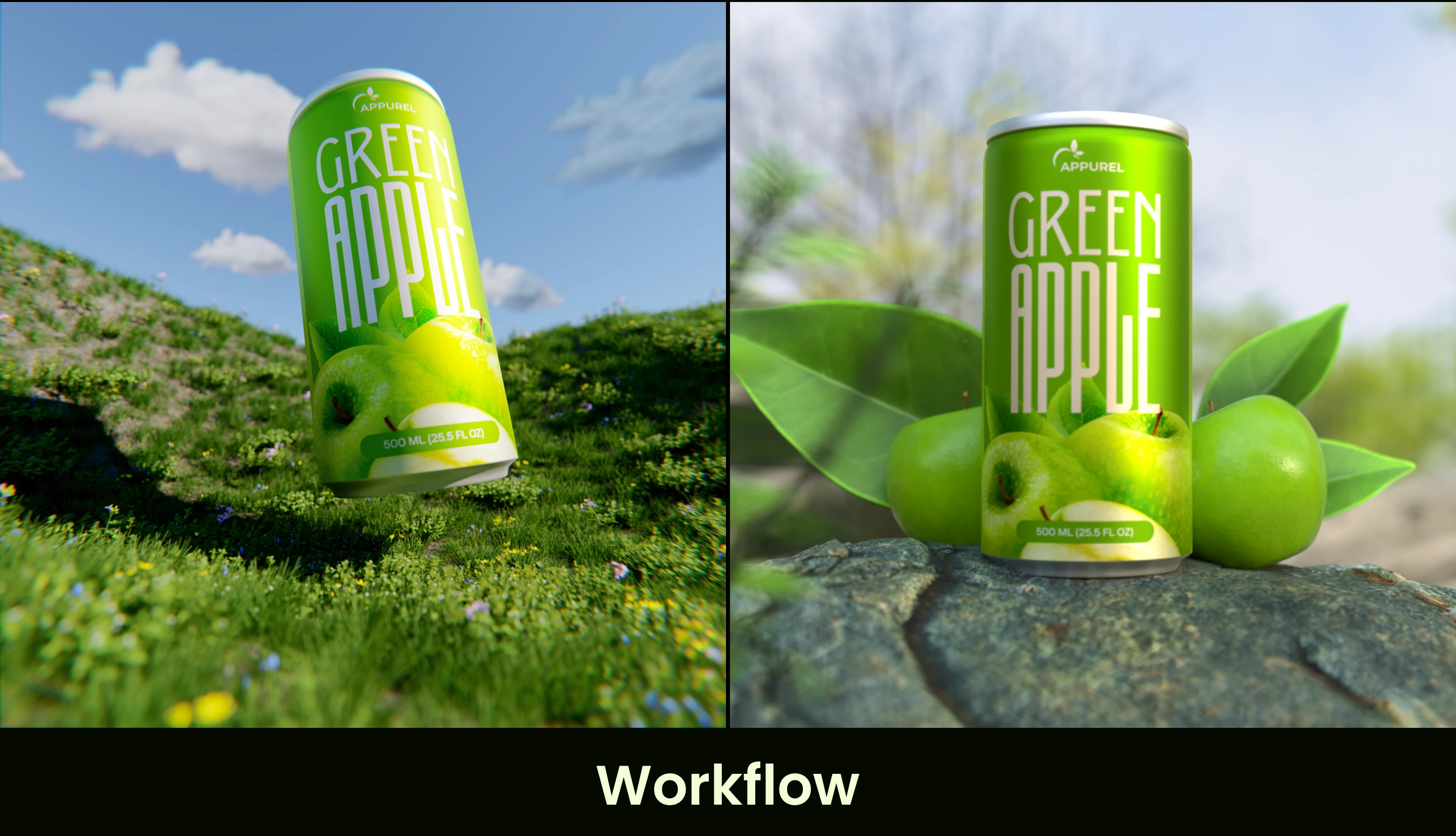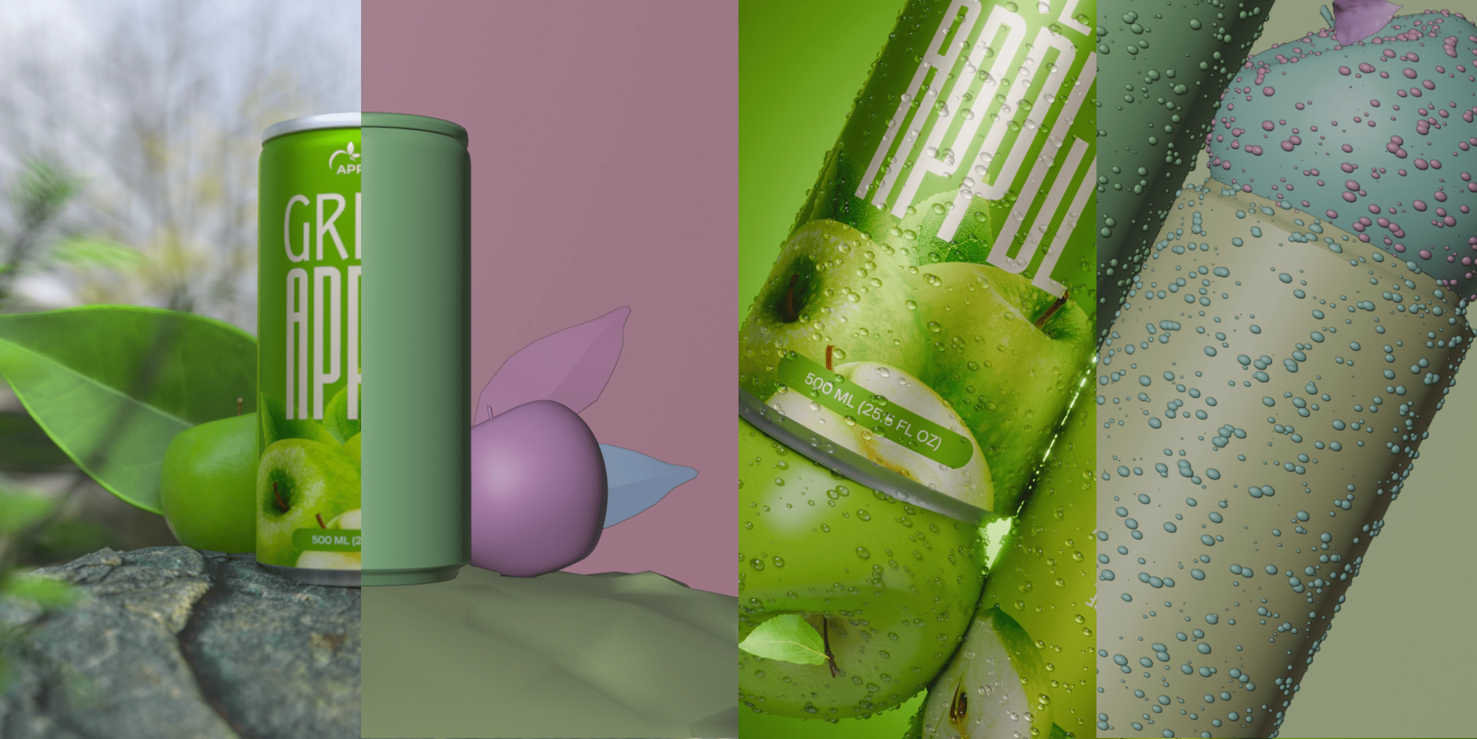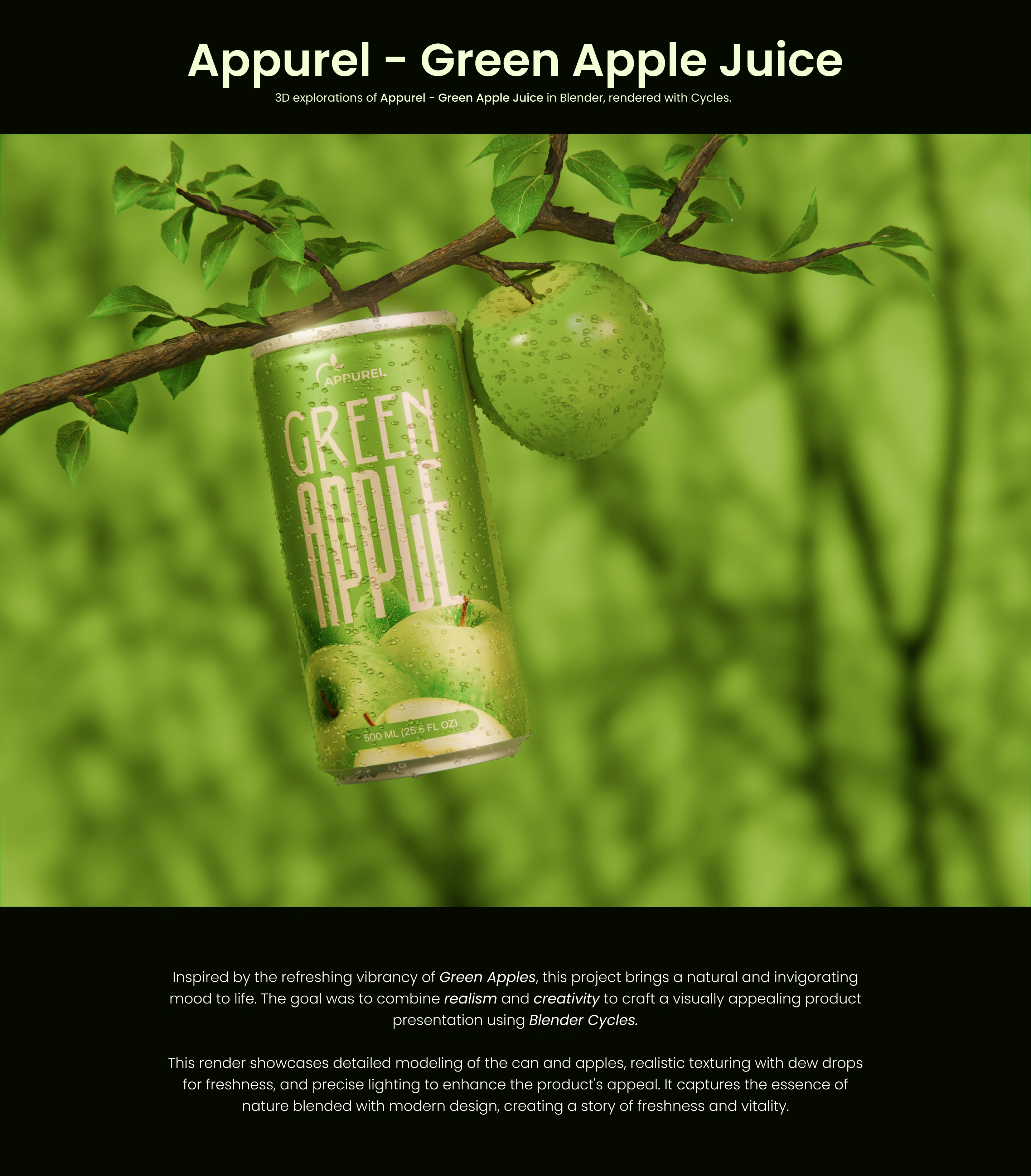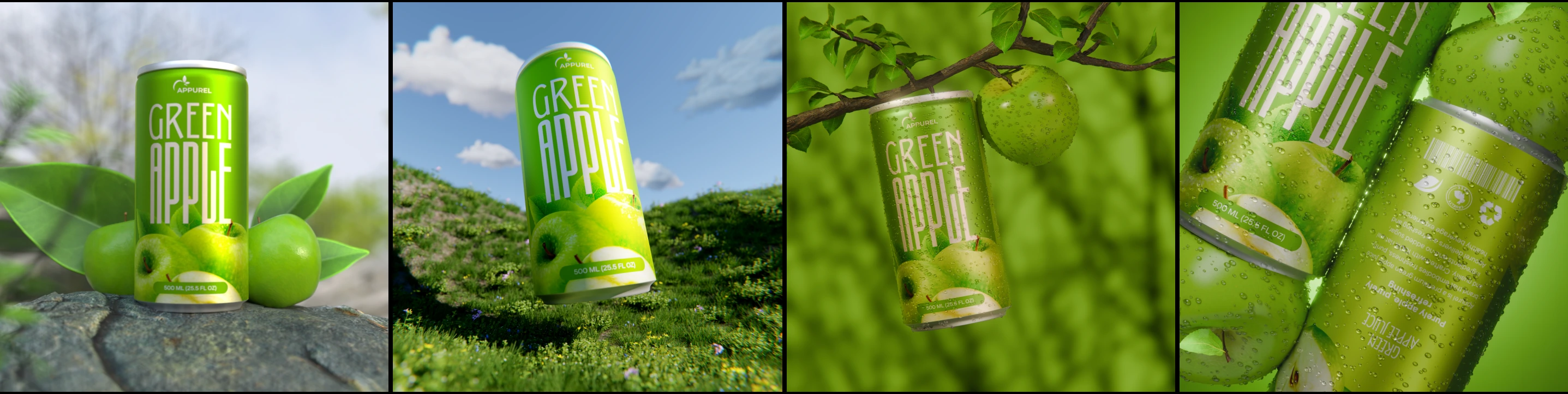 A vibrant 3D visualization of Green Apple Juice, showcasing fresh ingredients, crisp details, and realistic textures to bring the essence of freshness to life.