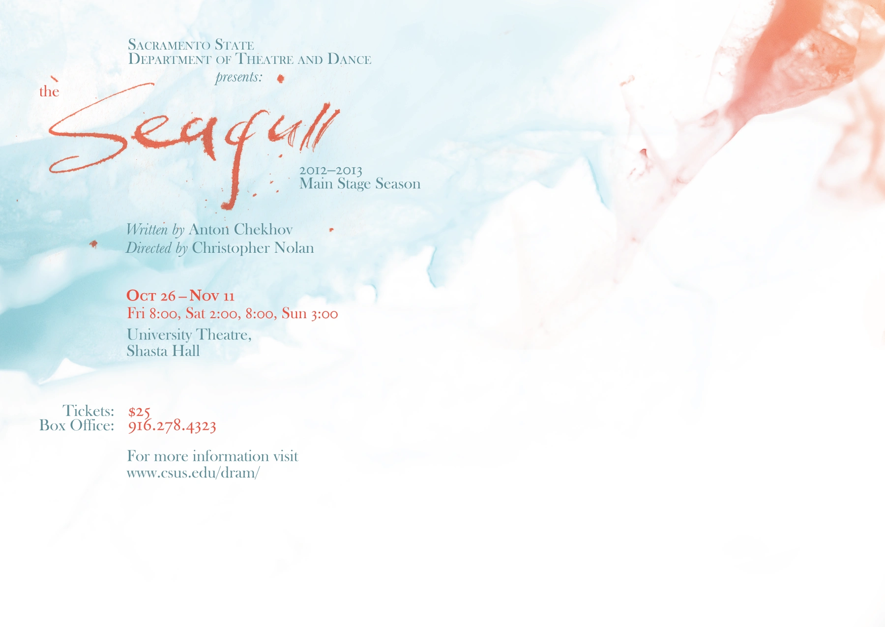 The challenge of this project was to create three postcards for a play expressing the emotion through abstract lighting of paper. The Seagull is a drama written by Anton Chekhov set in early 20th Century Aristocratic Russia. The emotions I pulled from were classiness, heartbreak, tragedy, envy, and sorrow. After playing with different kinds of paper and different ways of lighting it, dropping ink onto crumbled tracing paper brought the emotion of the play to life. To give each postcard it’s own voice yet still feel as a part of the whole, I gave them a narrative that weaves from one postcard to the other. The first one acting as an establishing shot by creating the mood of the aristocratic class. The second one introduces themes of love, heartbreak and envy. Culminating in tragedy and death in the final postcard