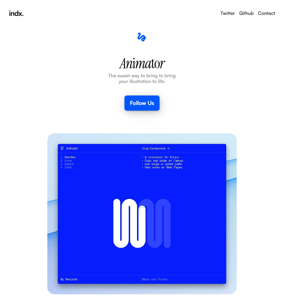 "Indx. Animator" is a highly interactive web showcase designed to demonstrate the full potential of Framer's motion capabilities. It serves as a digital playground and component library where users can explore how static elements, specifically typography and iconography..can be brought to life. The site features a clean, brutalist aesthetic (Blue/White) that puts the focus entirely on the animation physics and layout precision.