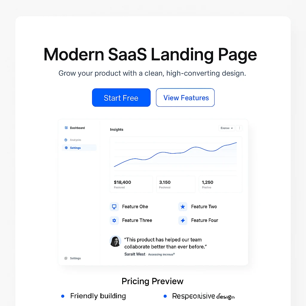 A clean, modern landing page concept for a SaaS product. Clear feature highlights, and strong calls-to-action that help startups convert more users.