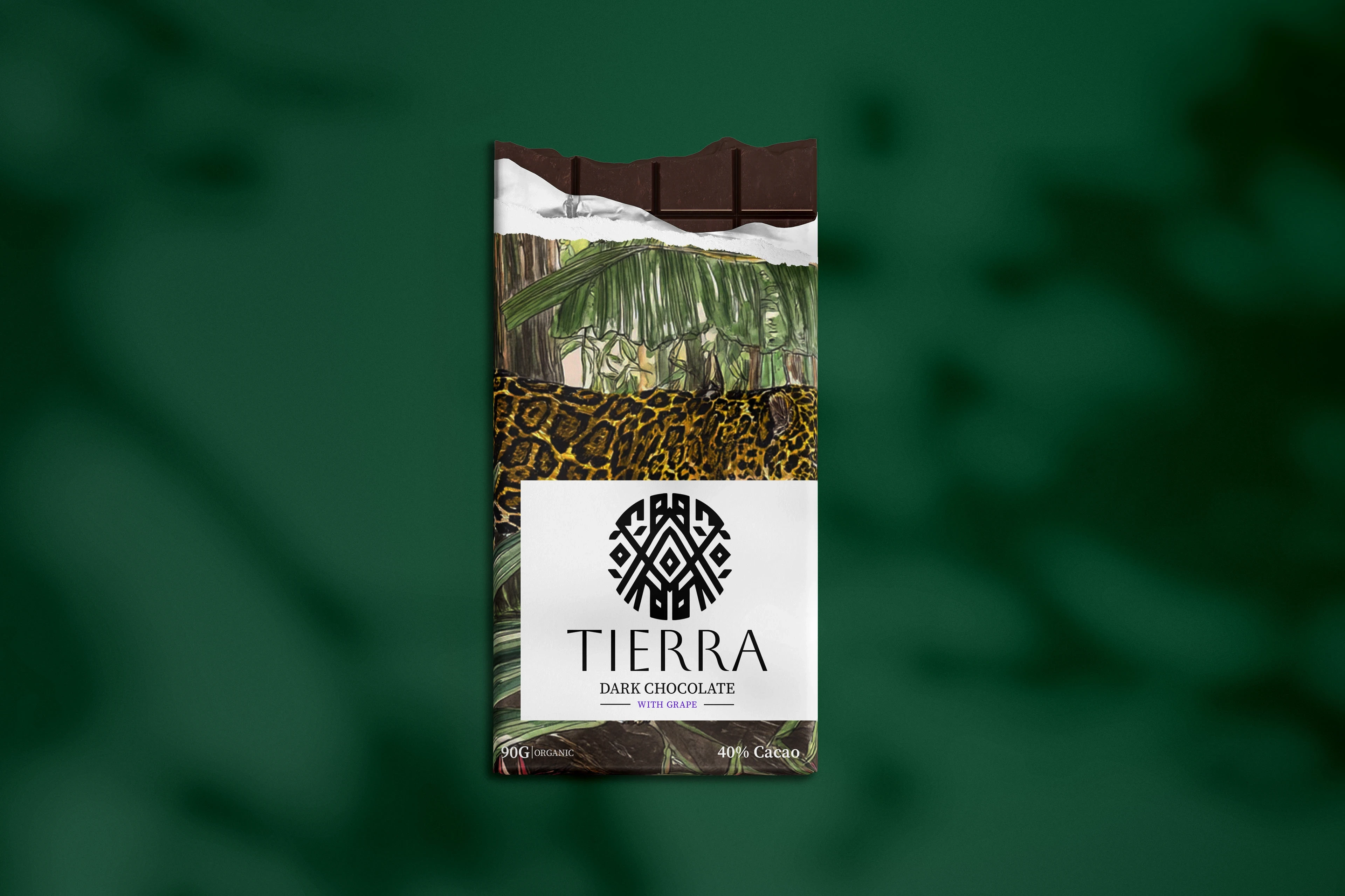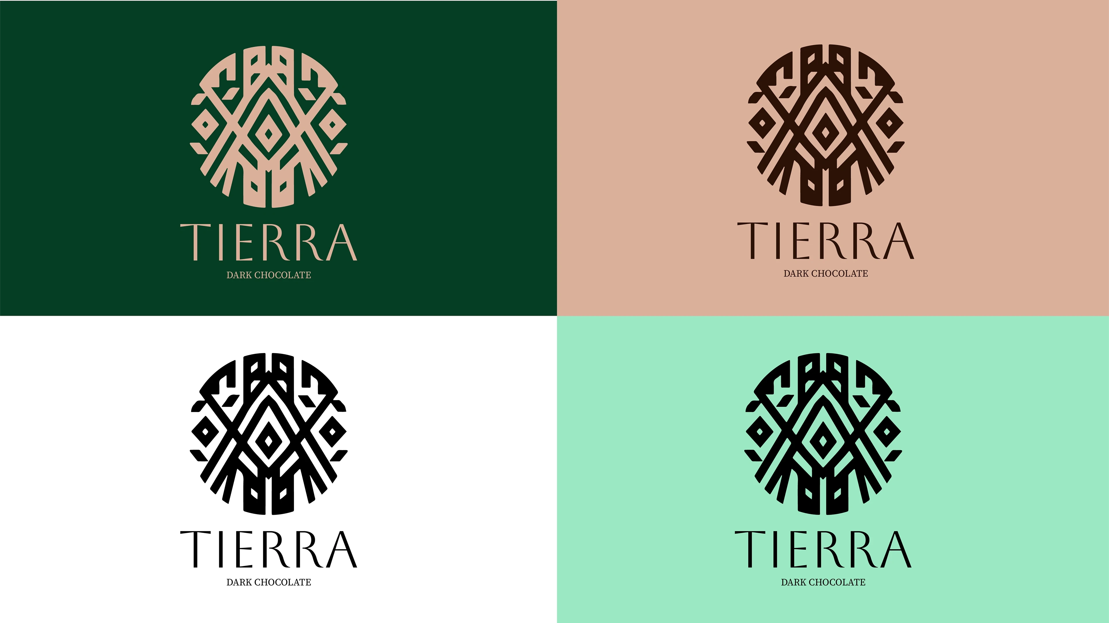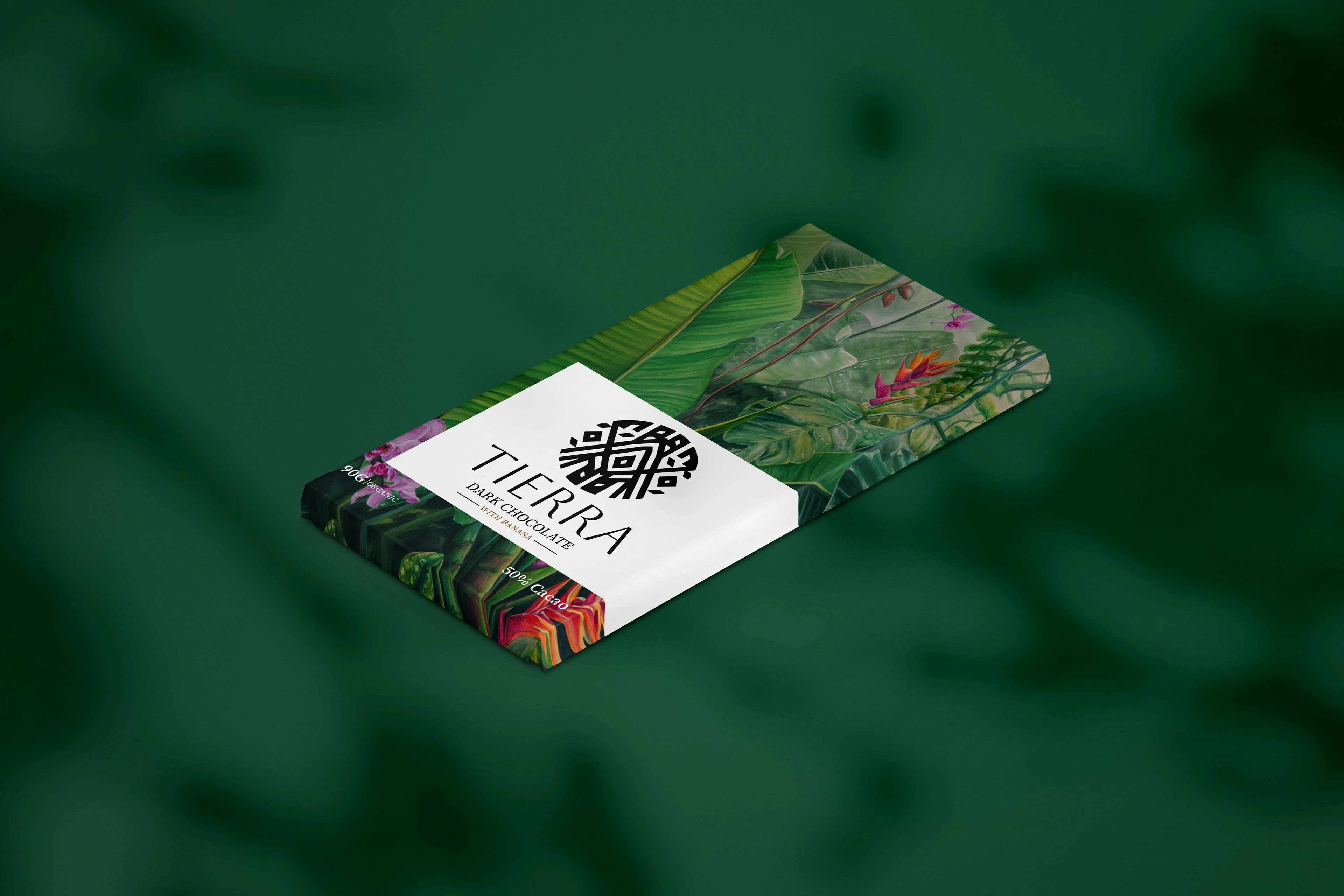 Tierra’s visual identity draws its strength from the very heart of the Amazon: a base of deep “Rainforest Green” echoes the filtered light beneath the canopy, while a warm “Clay Tan” recalls rich jungle soils and the husks of cacao pods. A bright “Mint Canopy” accent—suggestive of young leaf shoots—lends vibrancy when needed, and a crisp “Graphite Black” anchors the logo and wordmark with modern clarity. On light backgrounds the black emblem stands out sharply; on dark green or tan, it inverts to the clay tone, ensuring the mark always feels both cohesive and dynamic. This color system frames a circular logo inspired by the natural geometry of leaf veins, river tributaries, and indigenous textile patterns, while supporting imagery—watercolor florals, finely stippled banana leaves, heliconia blooms, and a jaguar’s spotted coat—immerses you in the rainforest’s lush drama. Together, these elements evoke Tierra’s commitment to sustainable craft, cultural heritage, and the wild beauty of Colombian dark chocolate