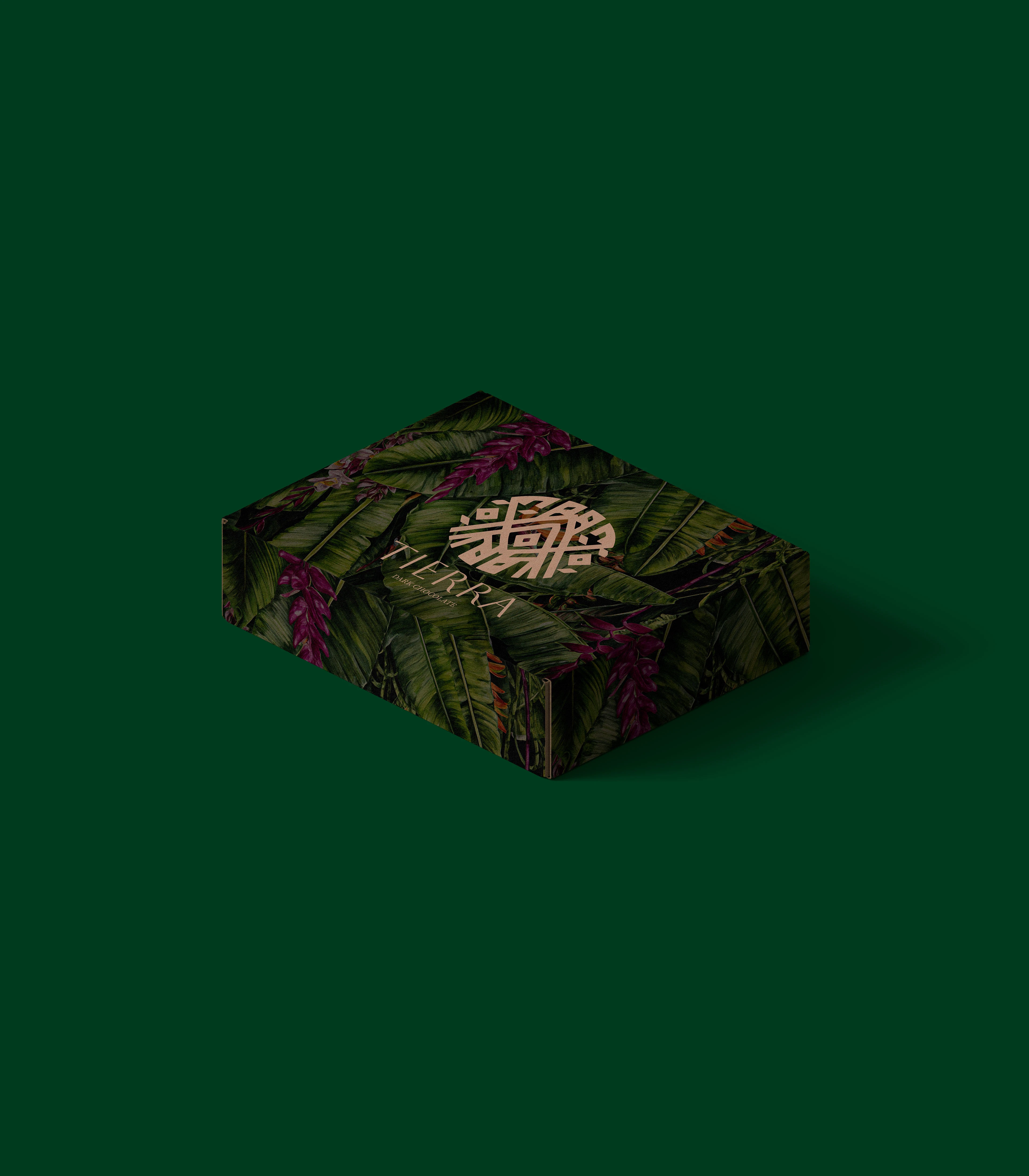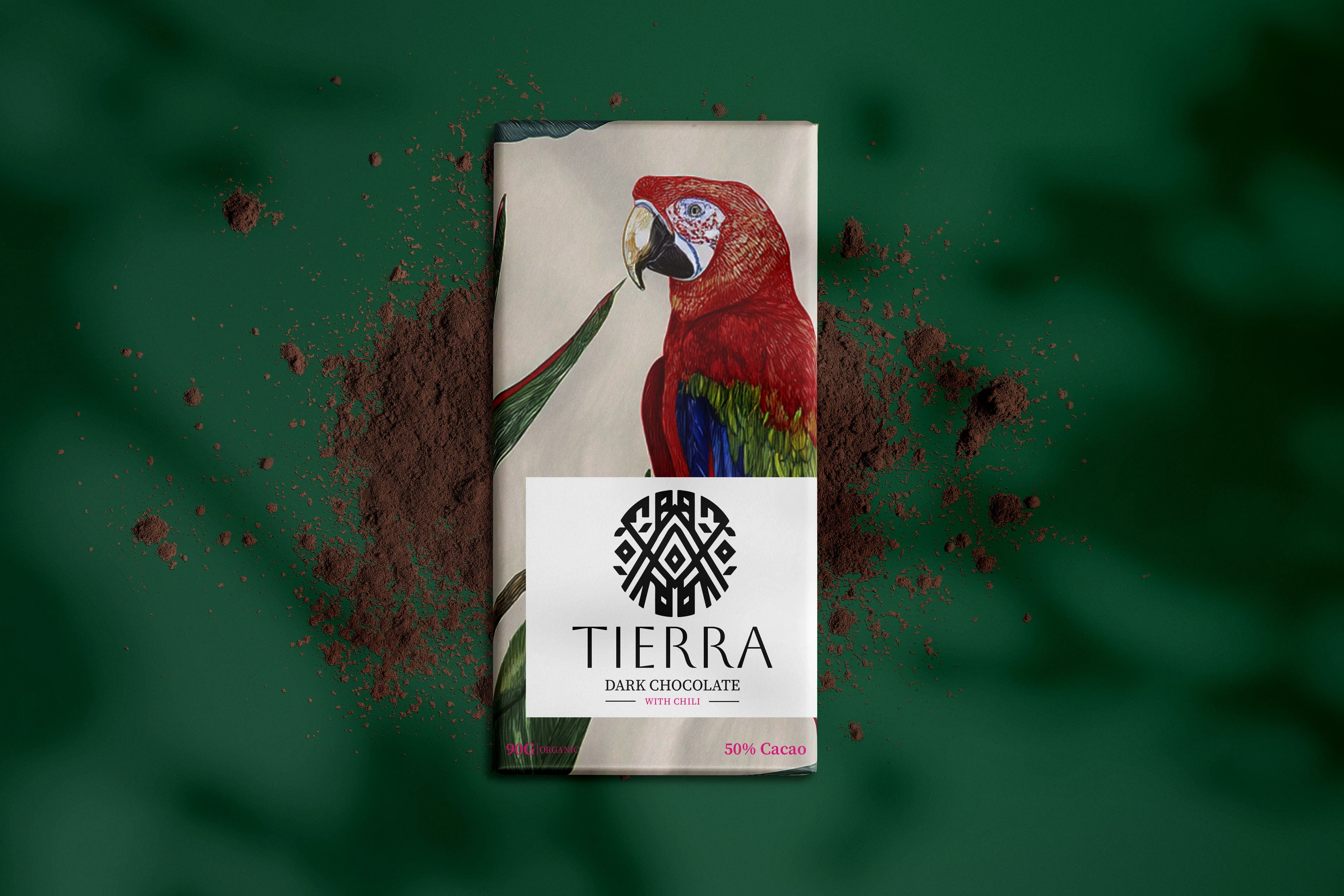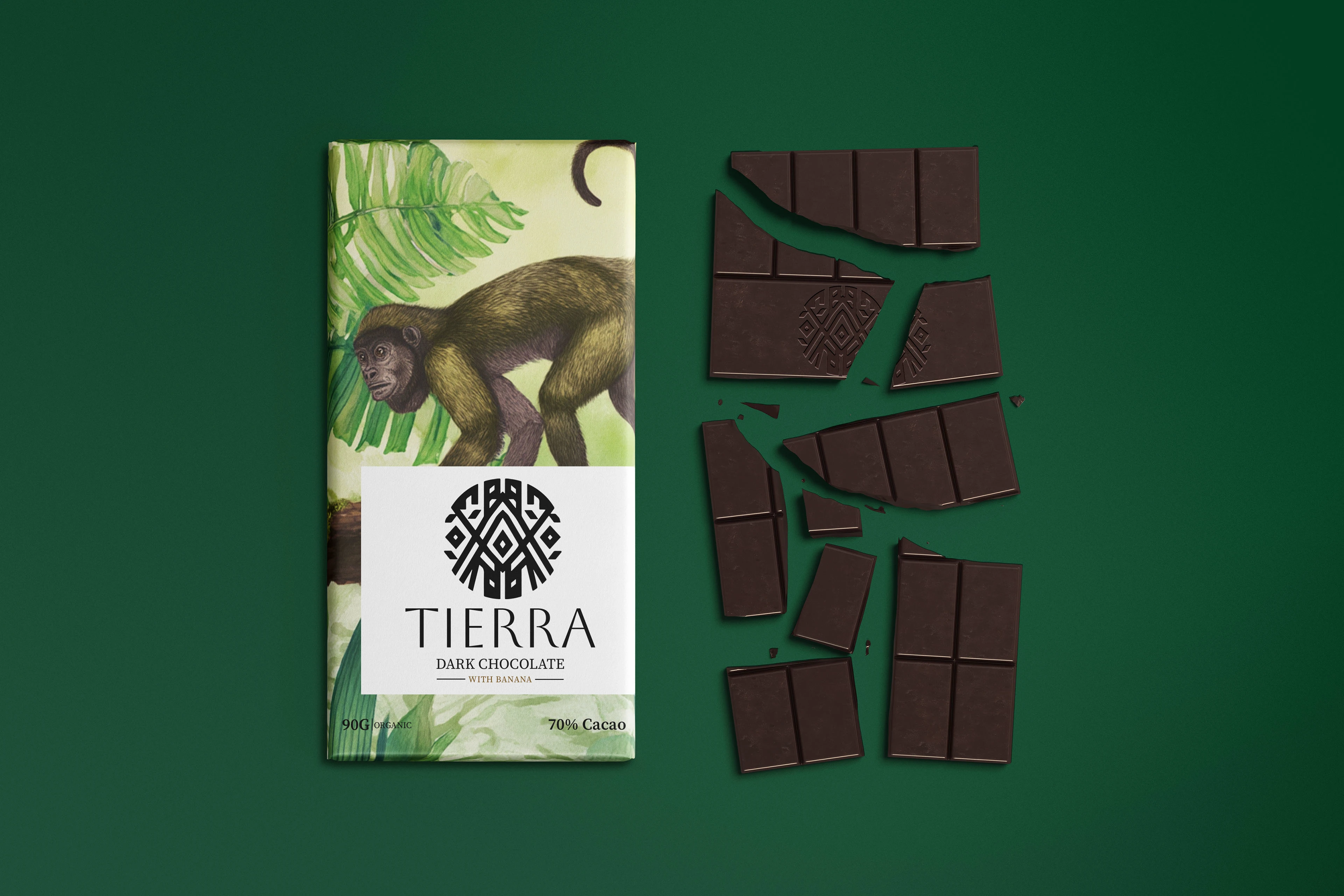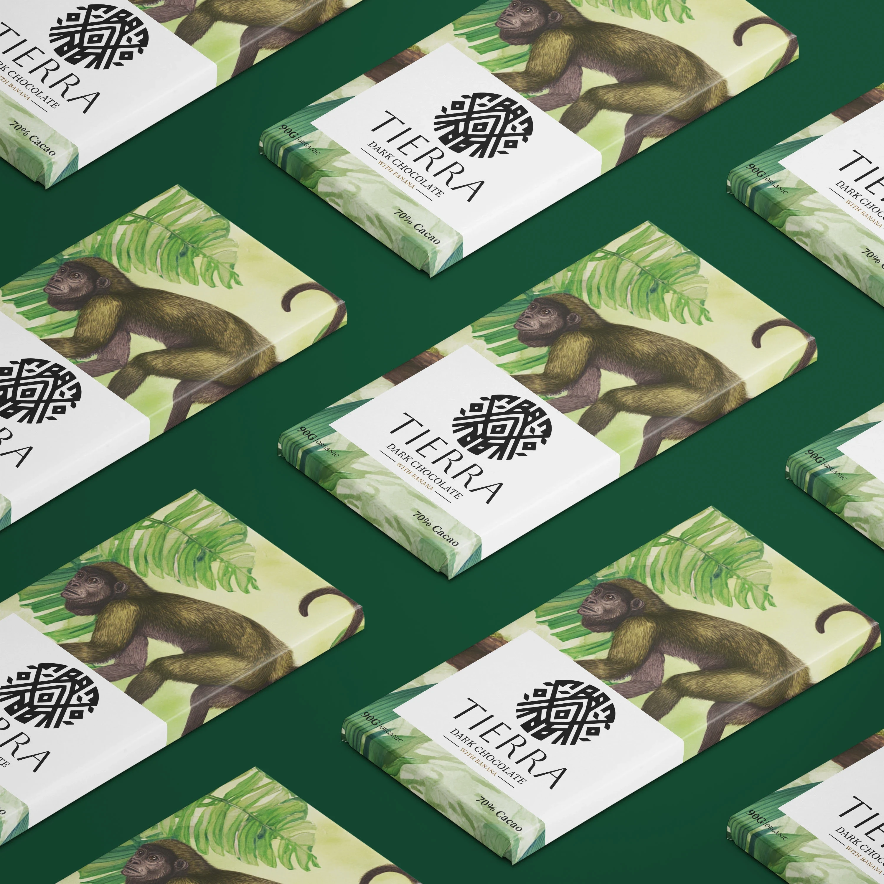 Tierra’s visual identity draws its strength from the very heart of the Amazon: a base of deep “Rainforest Green” echoes the filtered light beneath the canopy, while a warm “Clay Tan” recalls rich jungle soils and the husks of cacao pods. A bright “Mint Canopy” accent—suggestive of young leaf shoots—lends vibrancy when needed, and a crisp “Graphite Black” anchors the logo and wordmark with modern clarity. On light backgrounds the black emblem stands out sharply; on dark green or tan, it inverts to the clay tone, ensuring the mark always feels both cohesive and dynamic. This color system frames a circular logo inspired by the natural geometry of leaf veins, river tributaries, and indigenous textile patterns, while supporting imagery—watercolor florals, finely stippled banana leaves, heliconia blooms, and a jaguar’s spotted coat—immerses you in the rainforest’s lush drama. Together, these elements evoke Tierra’s commitment to sustainable craft, cultural heritage, and the wild beauty of Colombian dark chocolate