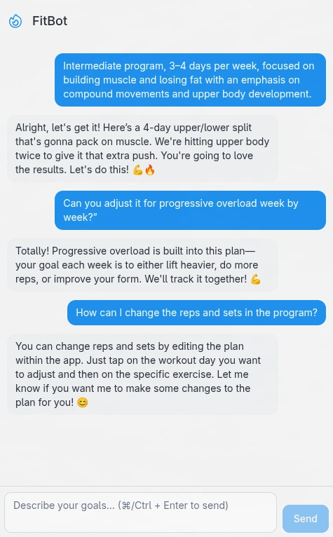 FitBot is your AI fitness coach that creates a custom weekly workout plan in seconds, turning your goals into a smart, personalized training routine.