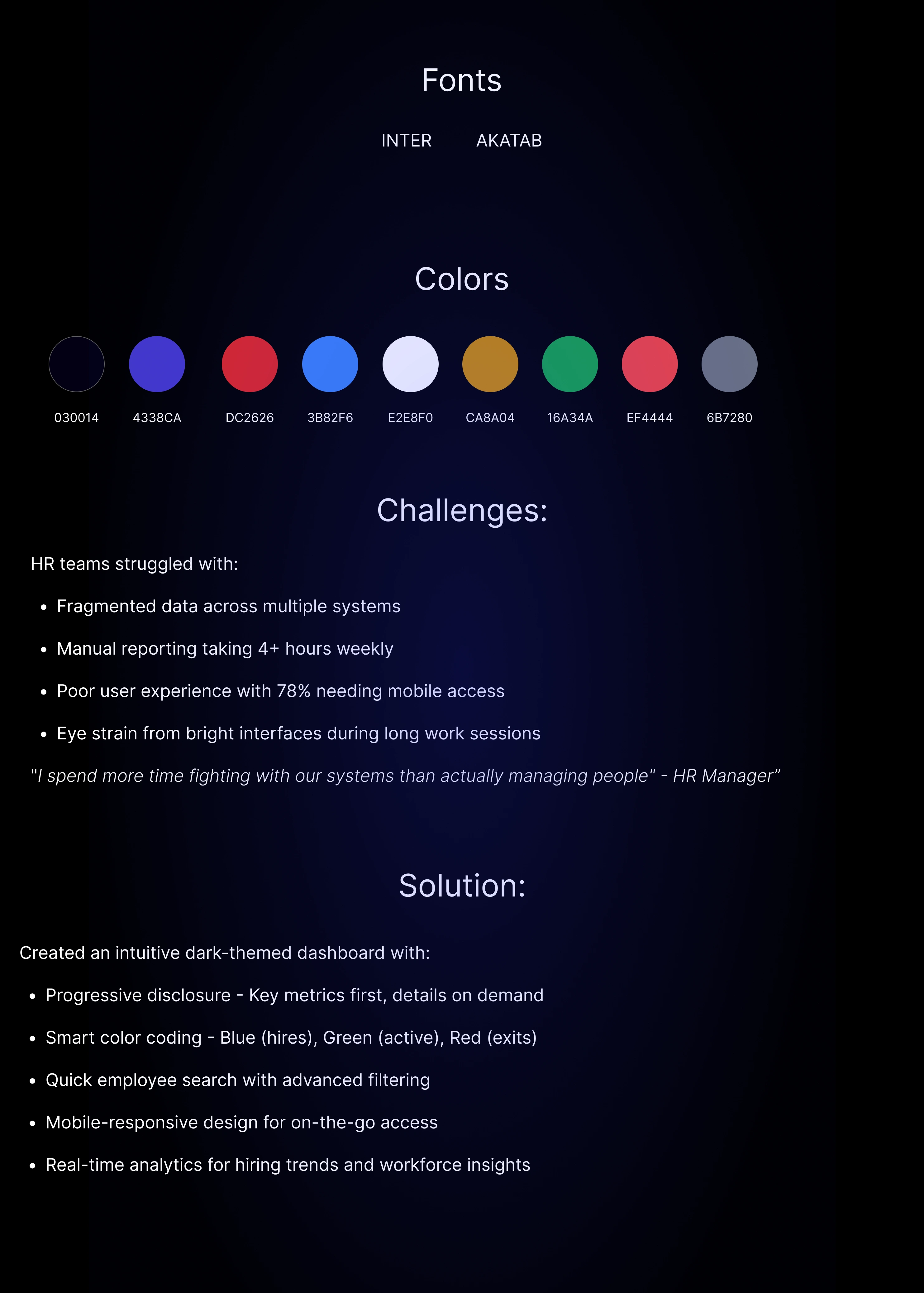 A dark-mode HR dashboard that centralizes workforce data, giving teams instant visibility into headcount, hiring trends, and employee status.