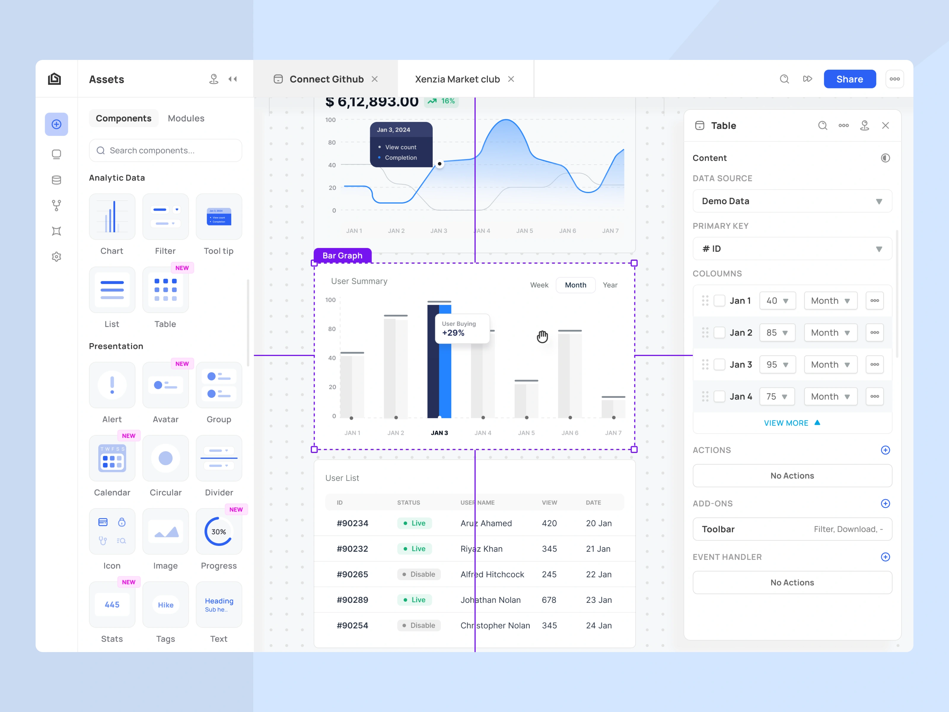 The goal of this project was to design a highly flexible, component-based workspace that allows users to build custom data visualizations without writing code. I focused on creating a seamless "drag-and-drop" experience while maintaining deep configuration options for data sources, primary keys, and UI styling.