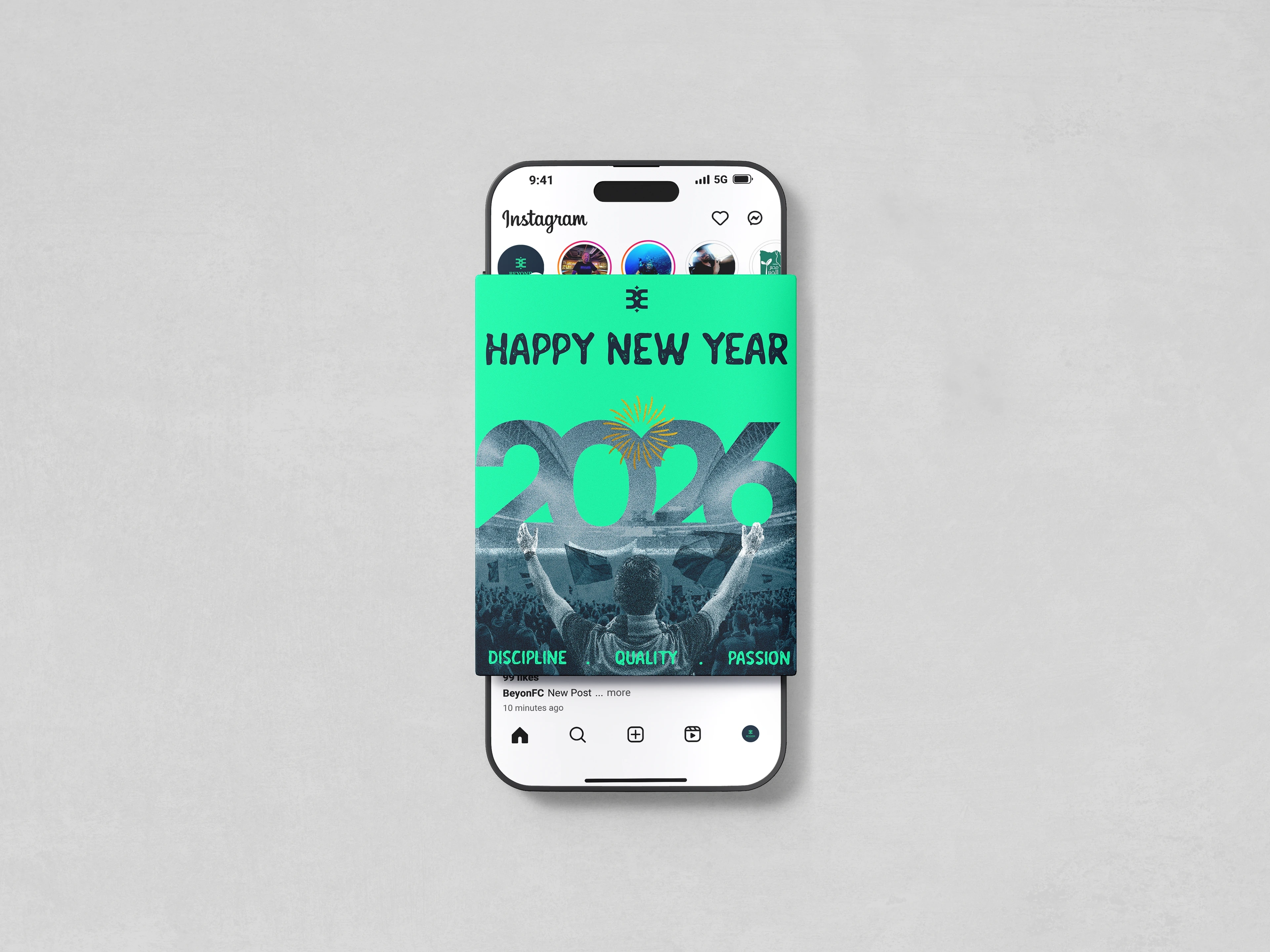 This project is a New Year Instagram post designed for the soccer team Beyond to welcome 2060. The goal was to create a strong visual that celebrates a new beginning while reinforcing the team’s identity and competitive spirit.