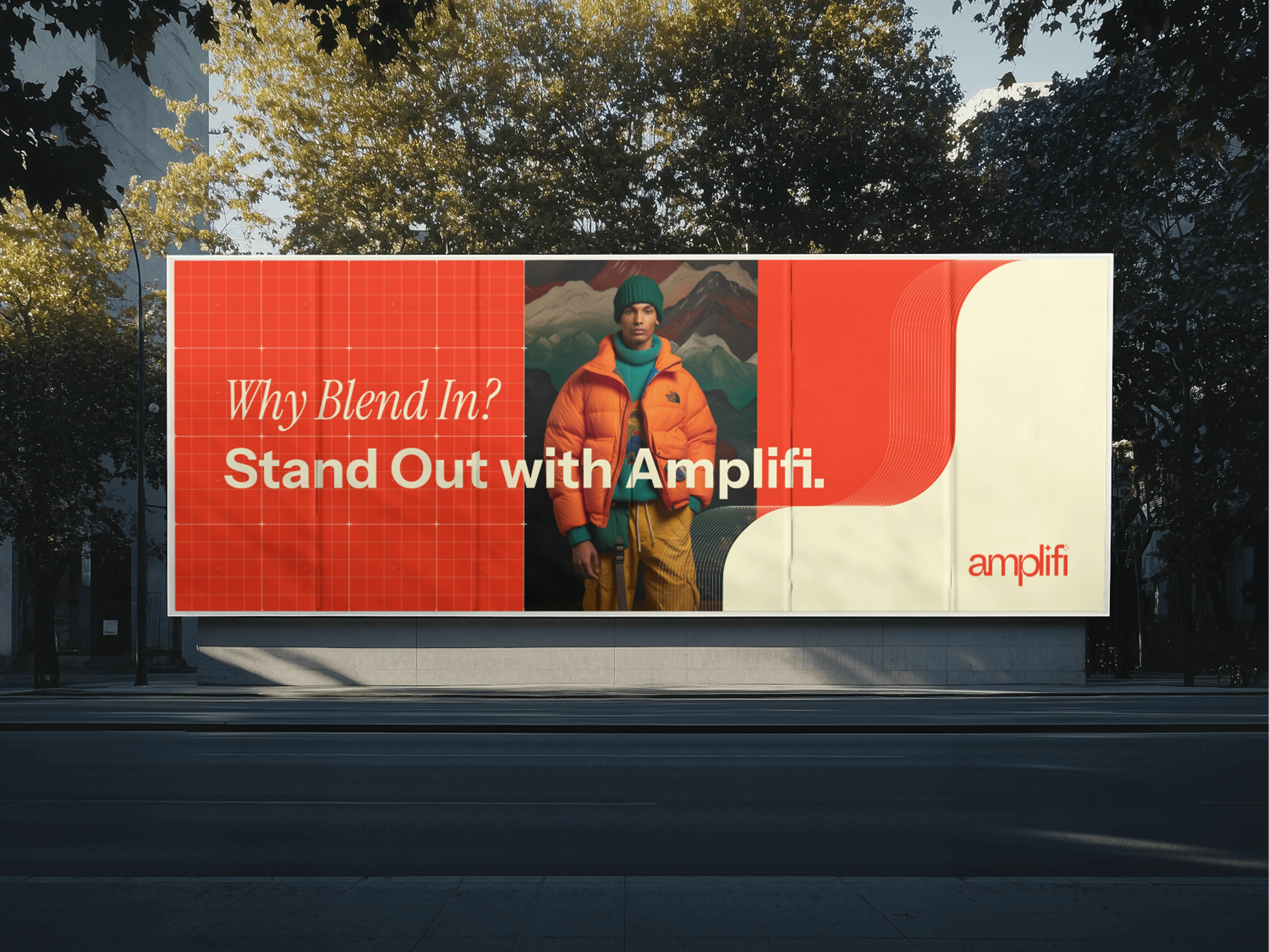 The Amplifi logo successfully balances strategy and creativity through its modern typography, structured grid system, and bold color palette.