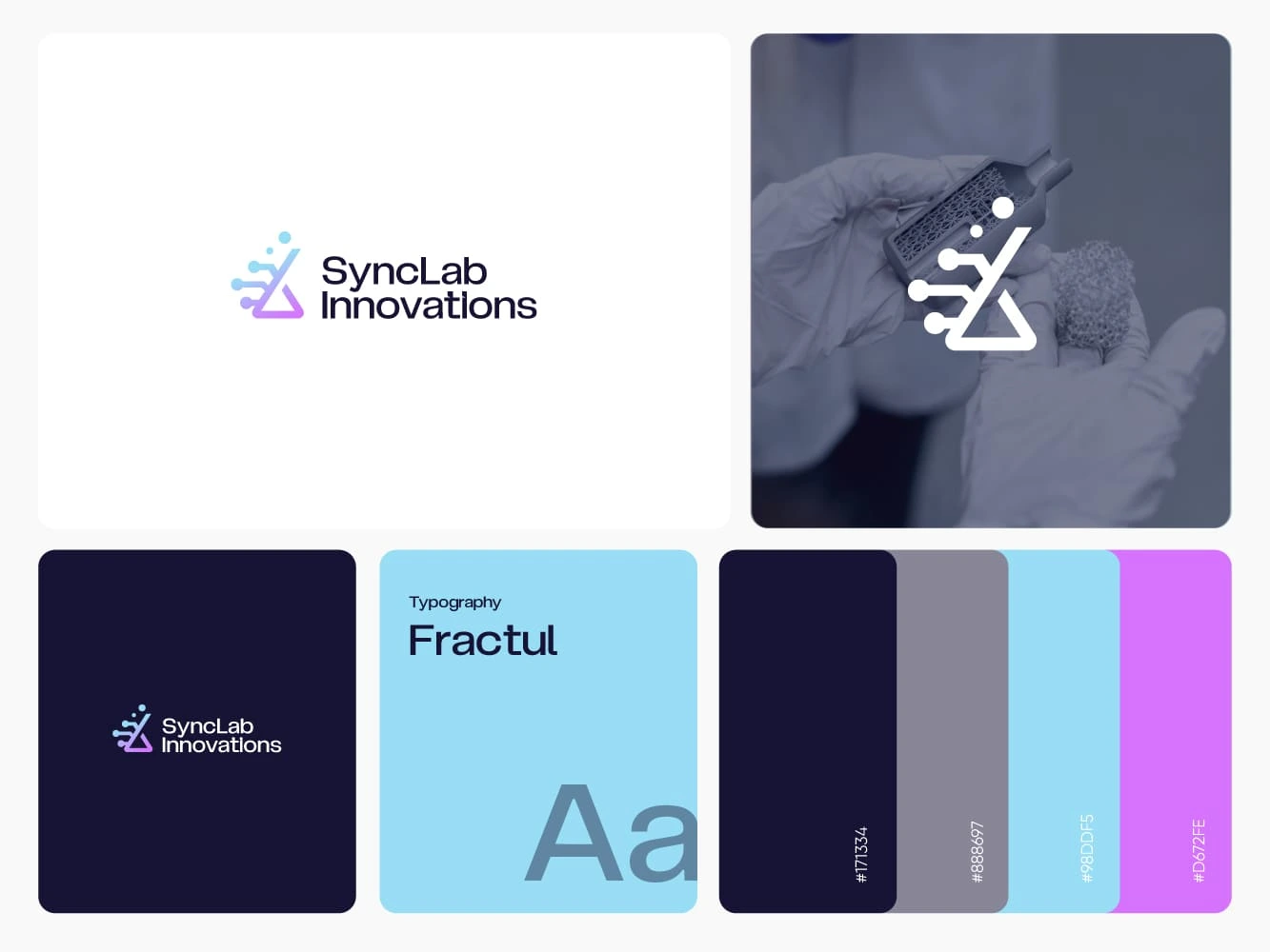Innovation meets imagination in the logo for SyncLab Innovations, where a sleek flask icon takes center stage, symbolizing experimentation, discovery, and breakthrough ideas. Paired with the futuristic "Fractul" font and a striking palette of deep navy, cool gray, sky blue, and vibrant violet, the design exudes creativity and forward-thinking energy. Every element works in harmony to reflect SyncLab’s mission to lead in tech and scientific advancement. Bold yet refined, the logo captures the essence of a brand driven by curiosity, precision, and limitless innovation.