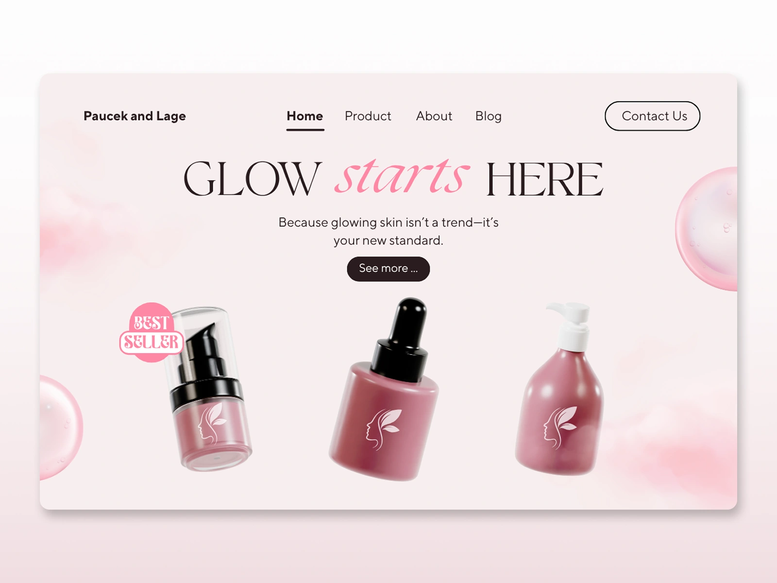 Striking Visual Hierarchy: The central, large headline, "GLOW starts HERE," immediately grabs attention. The use of a soft, script-like font for the word "starts" provides a gentle, feminine contrast to the bold, classic sans-serif, reflecting a blend of luxury and modernity.