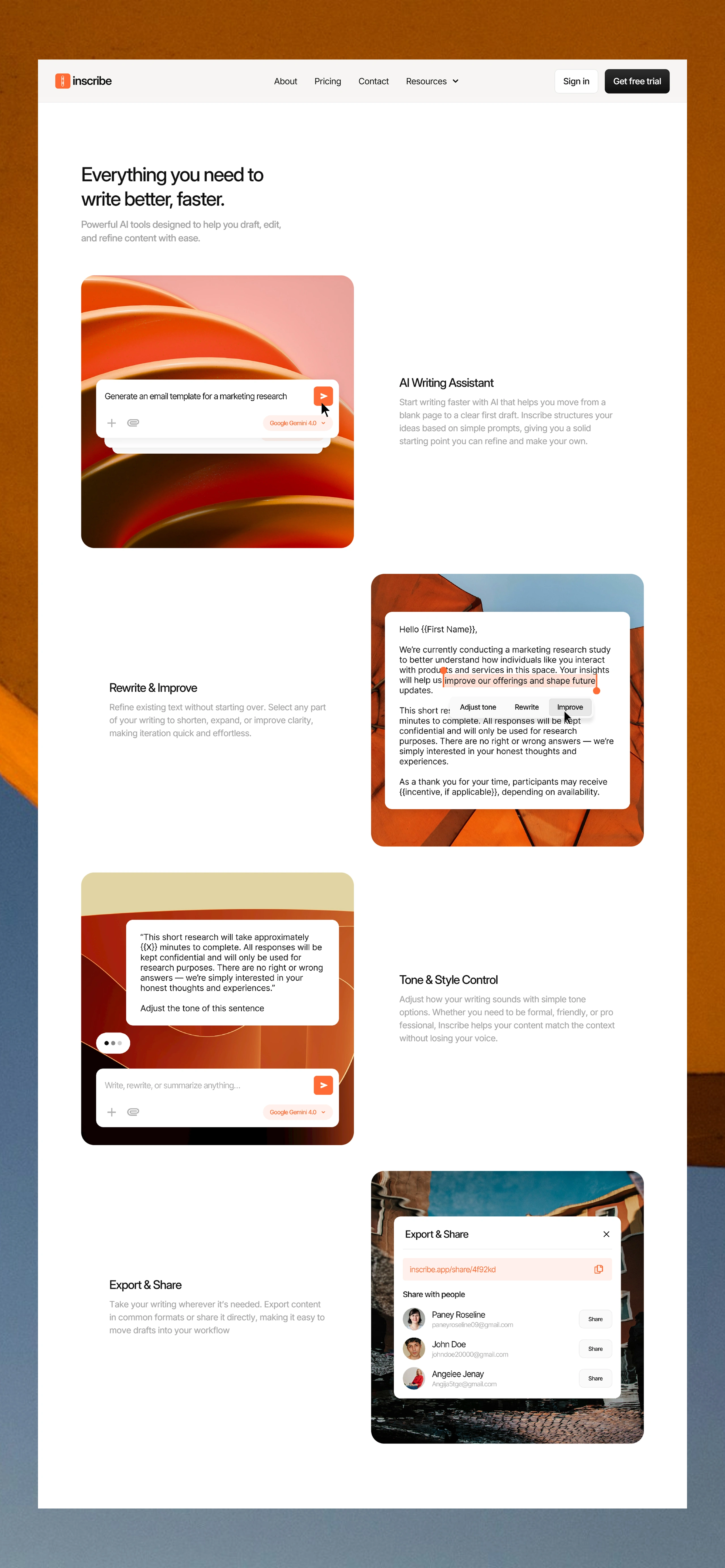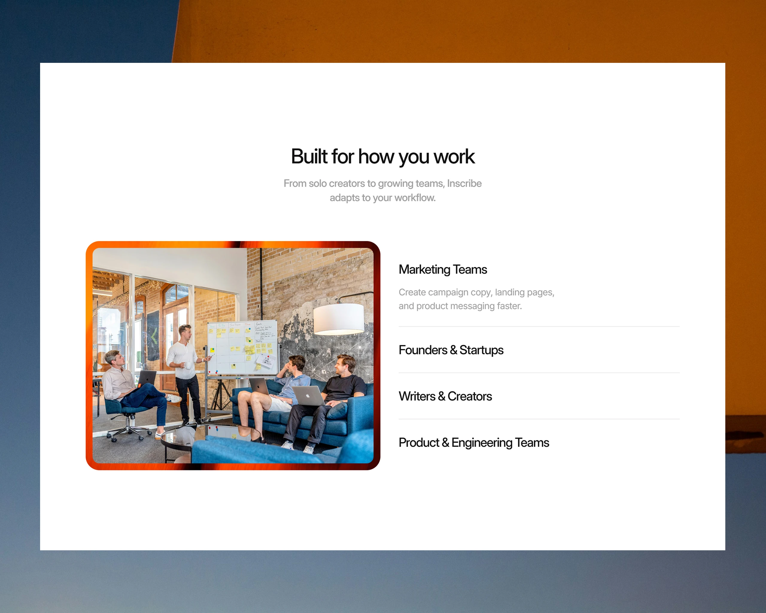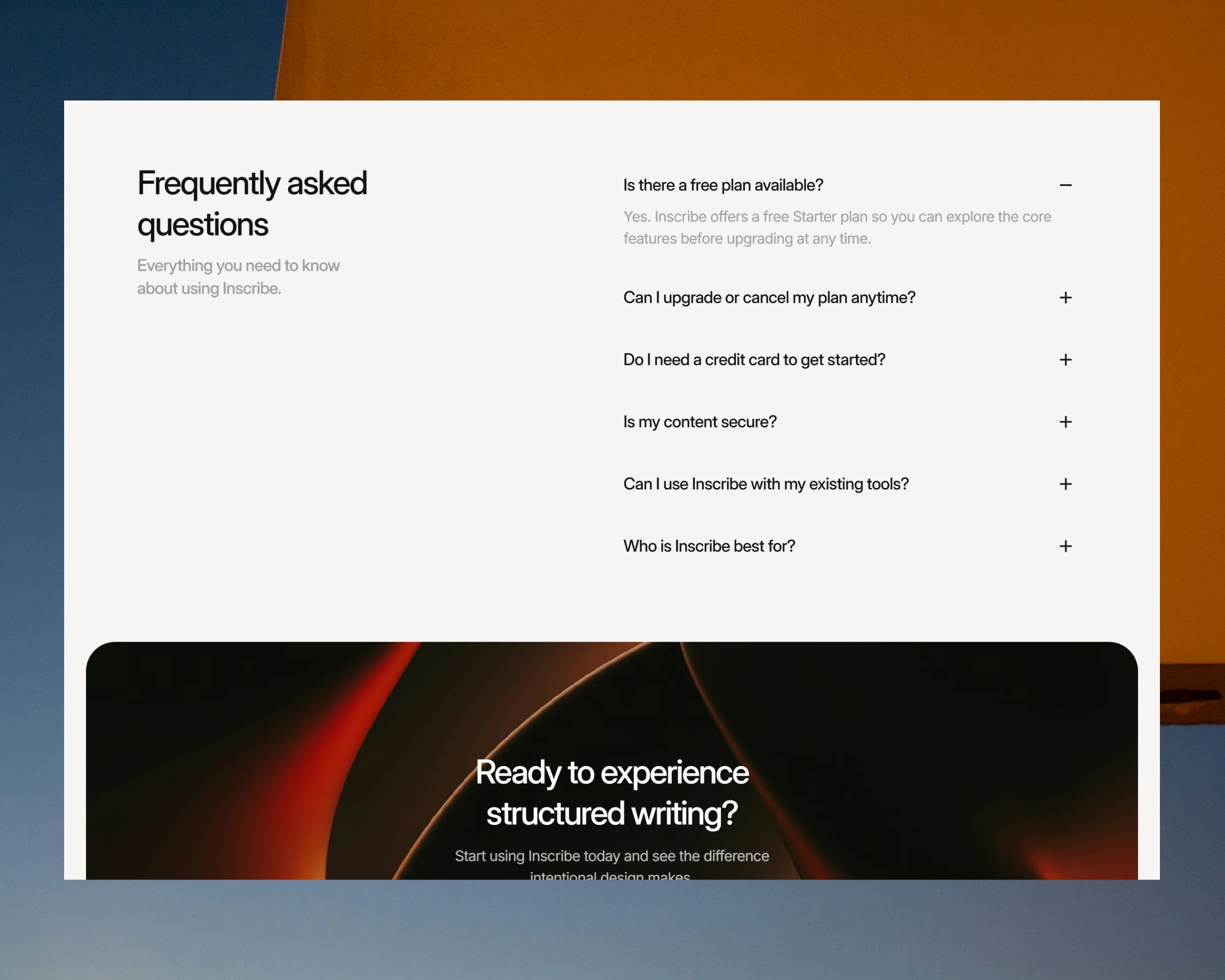 Inscribe is a modern B2B SaaS landing page built in Framer, designed to combine clarity, structure, and conversion-driven layout principles. The project focuses on creating a polished, responsive experience that communicates product value effectively while maintaining strong visual hierarchy and interactive refinement.