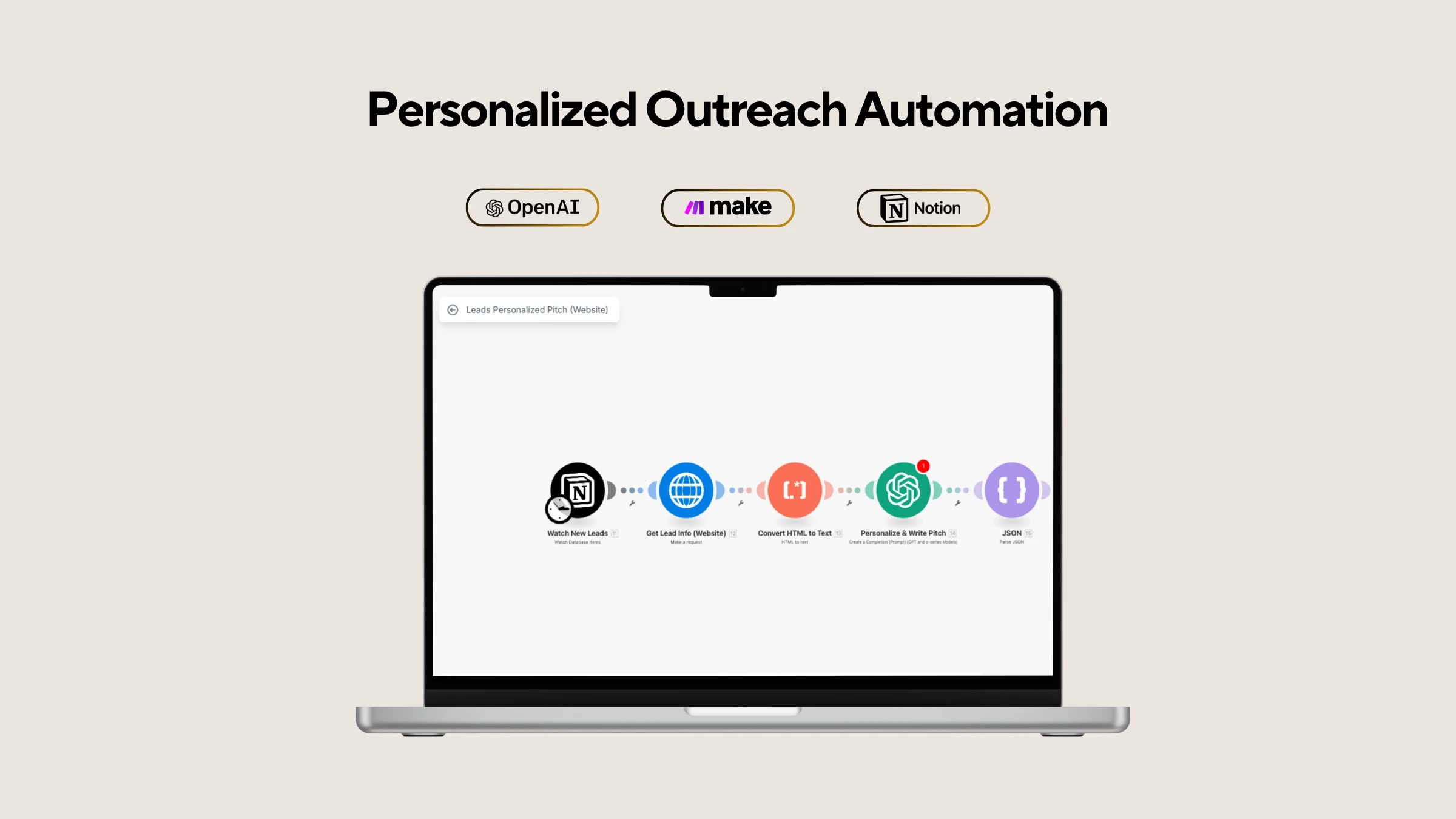 When a new lead is added to Notion, the automation scrapes their company website, converts the HTML into clean text, and sends it to OpenAI to generate a tailored outreach message or pitch based on the website’s content.