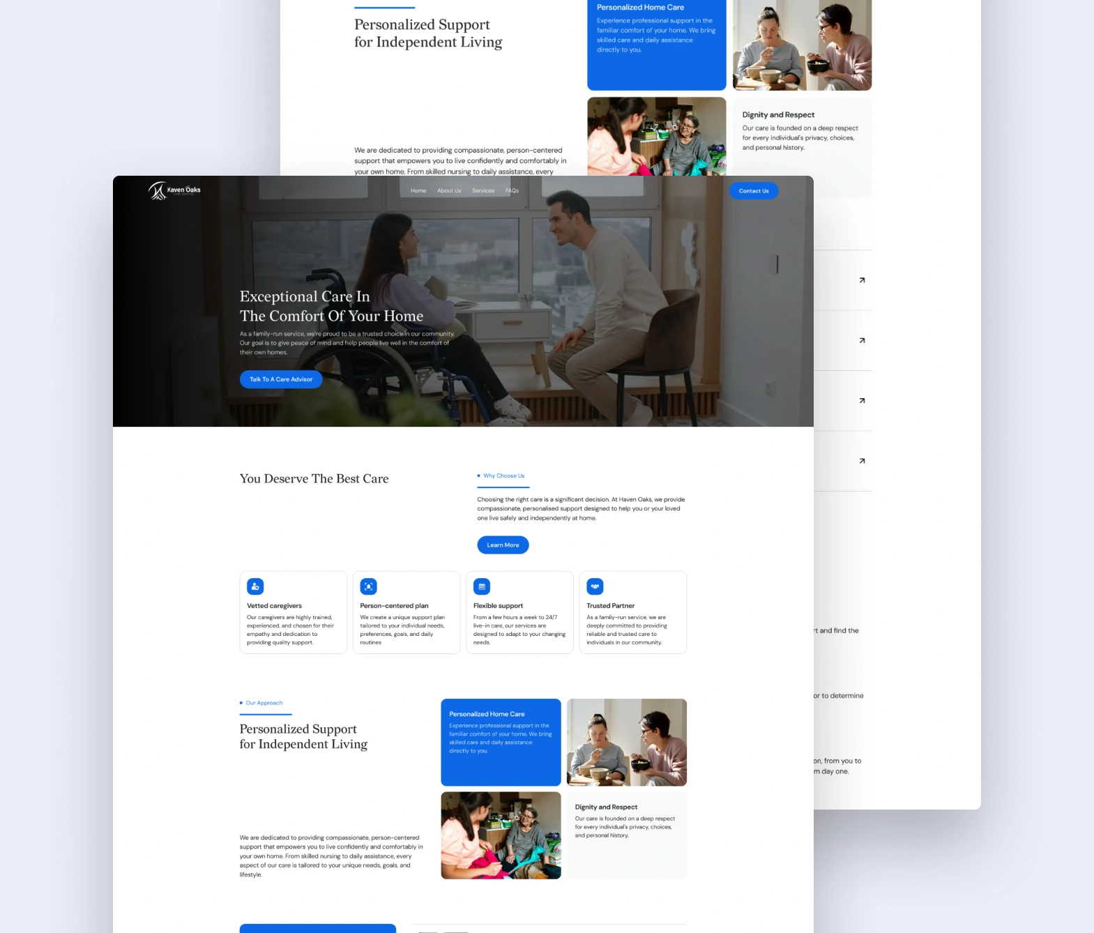 The new Haven Oaks website has successfully translated their compassionate, in-person care into a welcoming and informative digital experience. The user-centric design and clear presentation of services have made it easier for families to understand their options and take the next step in securing care for their loved ones. The prominent display of testimonials has been instrumental in building trust and credibility in a competitive market. Ultimately, the website now serves as a powerful tool for attracting new clients and reinforcing Haven Oaks' reputation as a leading provider of exceptional in-home care.